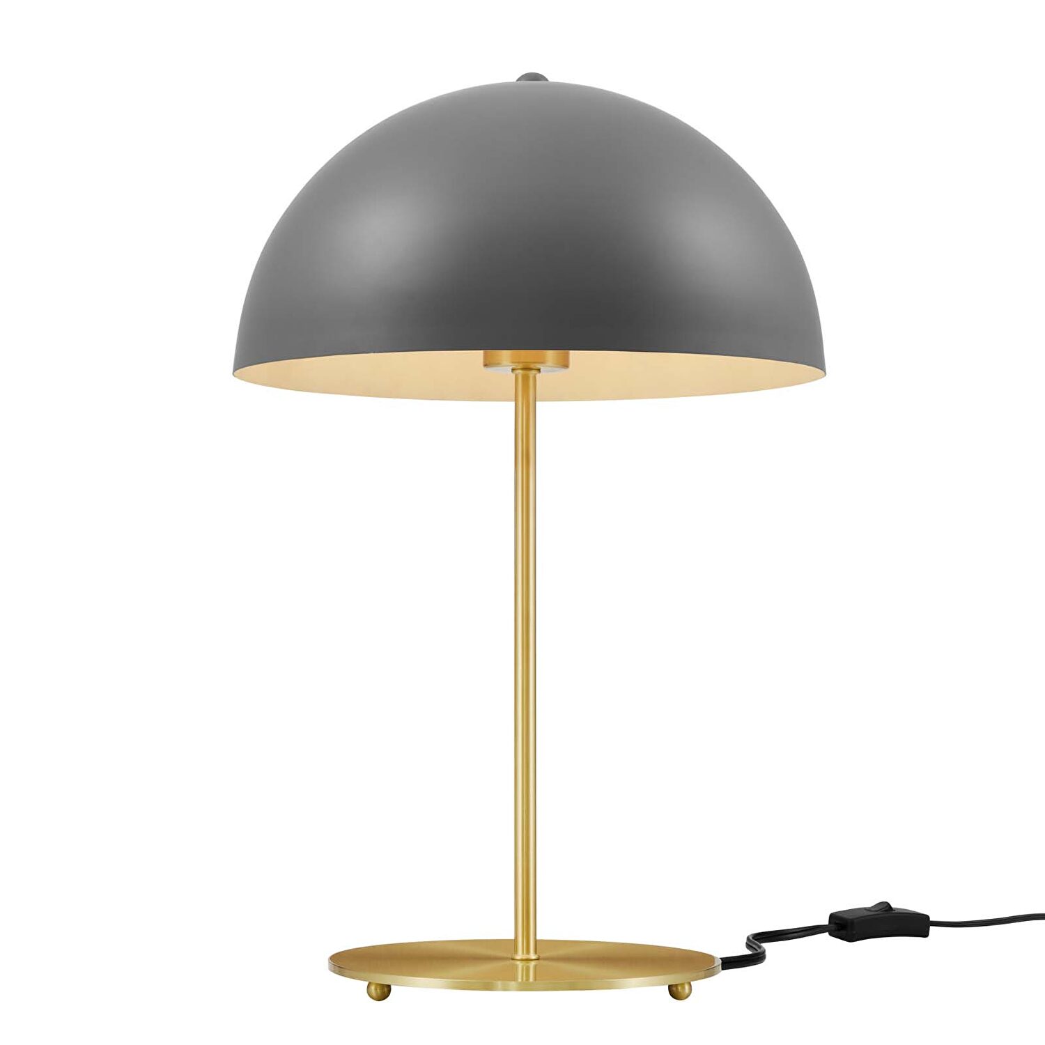 Enhance the lighting decor in your bedroom, living room, office, or entryway with the industrial-inspired Ideal Gray Metal Table Lamp. This side table lamp brings illumination and warmth into mid-century modern, contemporary, minimalist, or eclectic decors. The Ideal Office Desk Lamp shines with subtle vintage appeal, featuring a smooth metal dome lampshade for superior task lighting. This contemporary living room light is enhanced by a satin brass rod and round base with a black power cord and a convenient on/off switch. This bedside lamp requires 1 E26 60W max bulb or LED equivalent (not included). Compatible with dimmer switches (not included). Assembly required. Clean with a soft, damp cloth.Features: