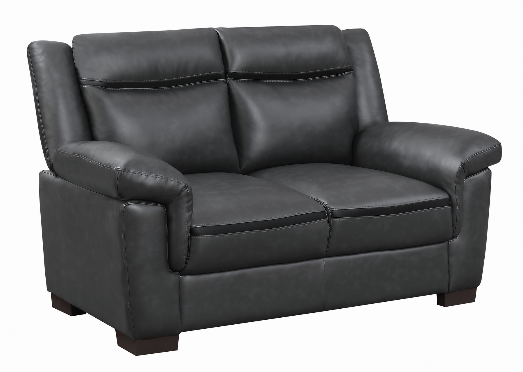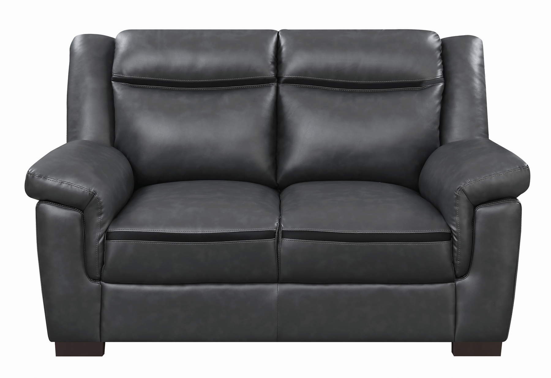 Maximize style and space! This arabella faux leather loveseat features a striking modern design, perfect for a contemporary-styled living or family room. The stylish, compact design works perfectly to maximize space, while the lovely neutral grey fabric works wonderfully in many different color schemes. A subtly contrasting line of darker color added to seat and headrest brings depth to the loveseat.Features: