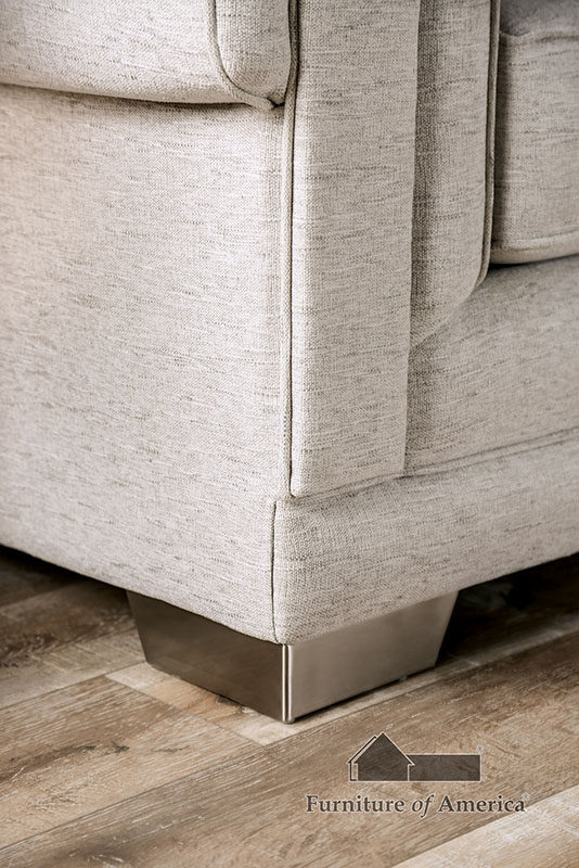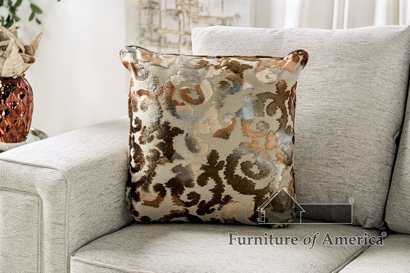 Made in the U.S.A., this gorgeous light gray loveseat with uniquely squared-back arms hosts a number of pillows that serve to complement the visual motif most effectively.Features: