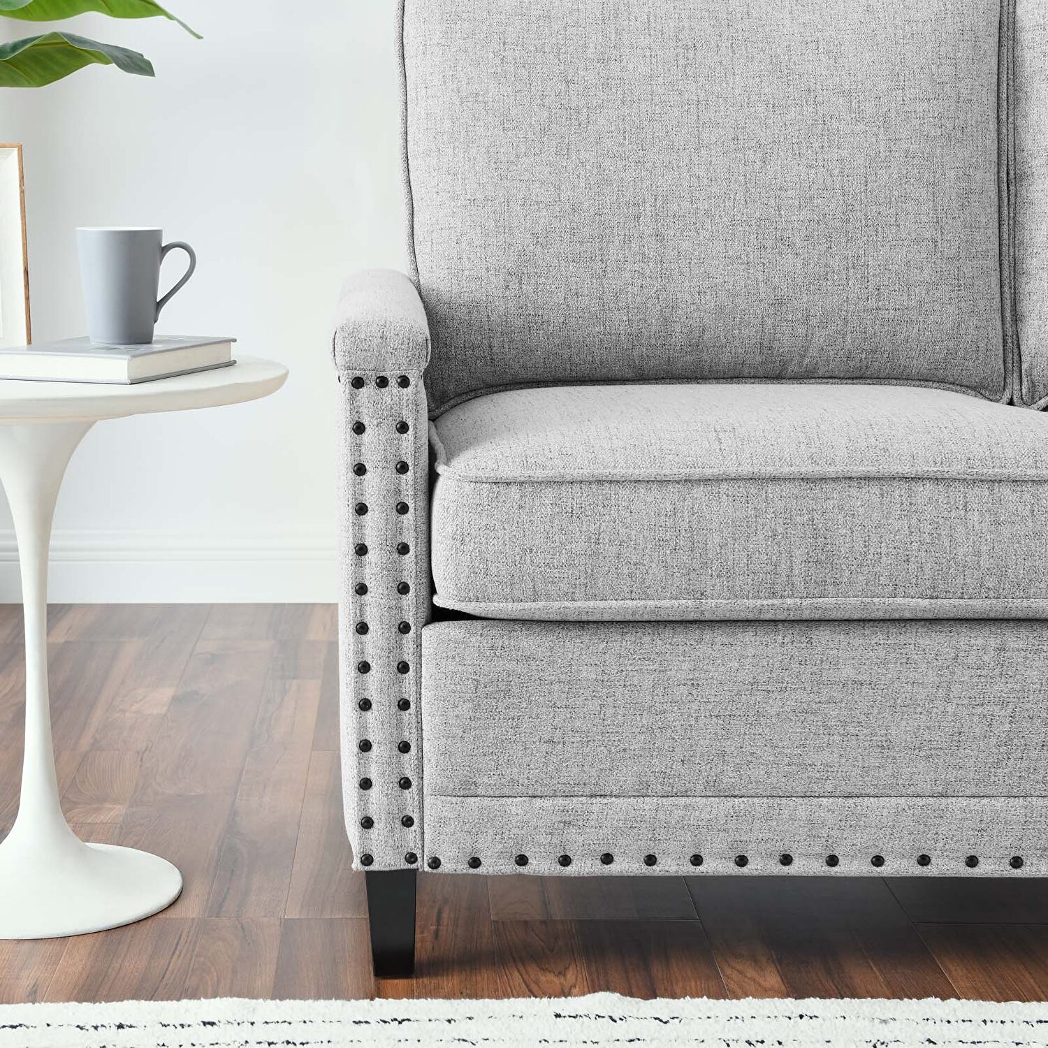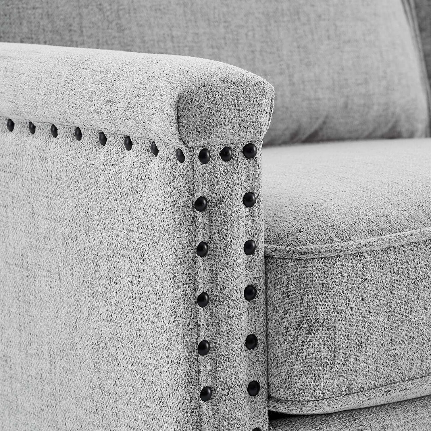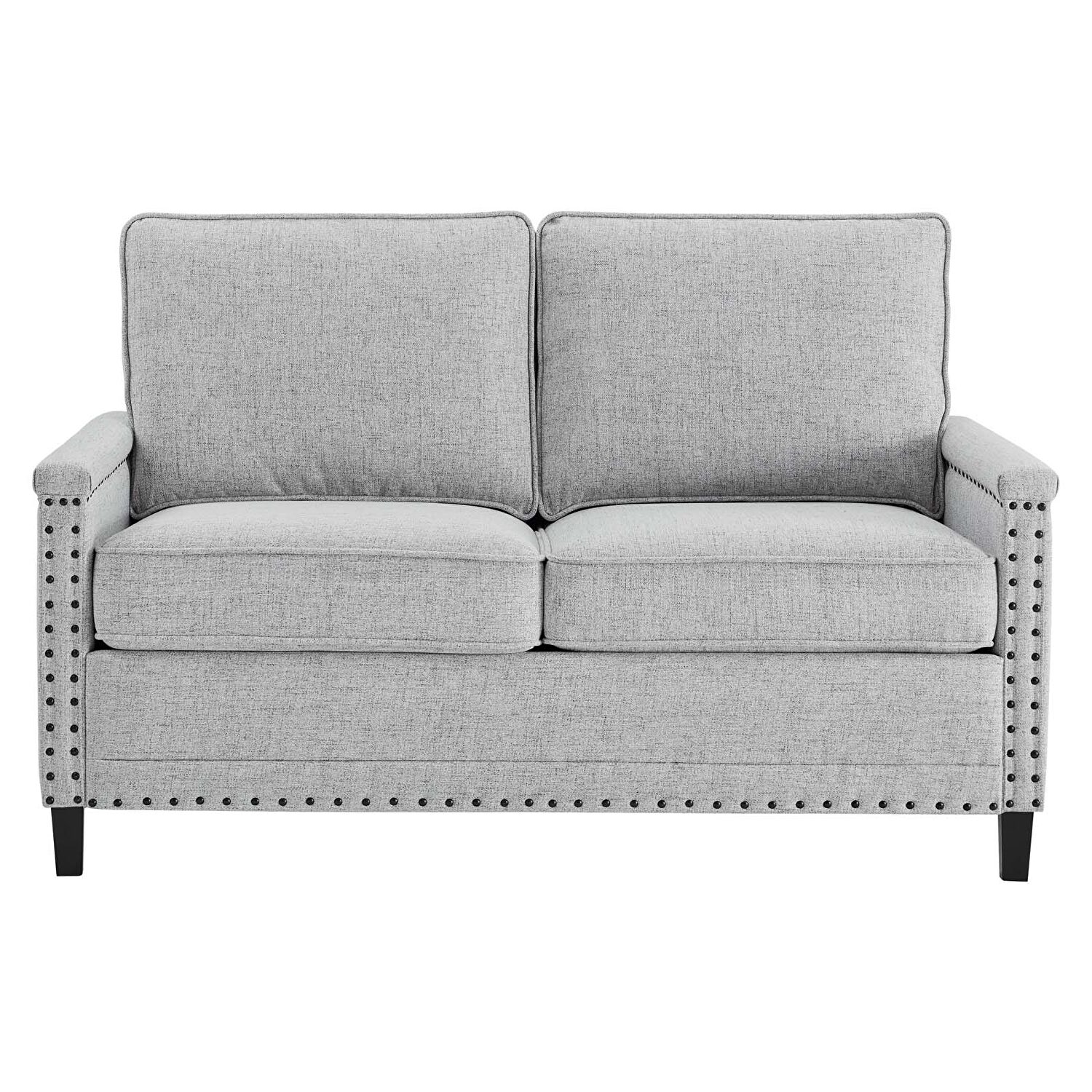 Sit back and relax amidst streamlined style and supportive comfort with the Ashton Upholstered Fabric Loveseat. Perfect for the living room, bedroom, office, or lounge area, this loveseat is enriched with a tailored profile, separate seat cushions, and a classic nailhead trim. Upholstered in polyester fabric, this two-seater sofa is padded with dense foam and complete with a spring pocket support system to offer a premium seating experience. Durably crafted, this loveseat rests on solid wood legs with non-marking foot pins to protect flooring. Say goodbye to the days of hauling heavy furniture because Ashton ships in a conveniently portable box that's easily maneuverable up staircases and narrow hallways. Assembly required. Loveseat Weight Capacity: 1103 lbs.Features: