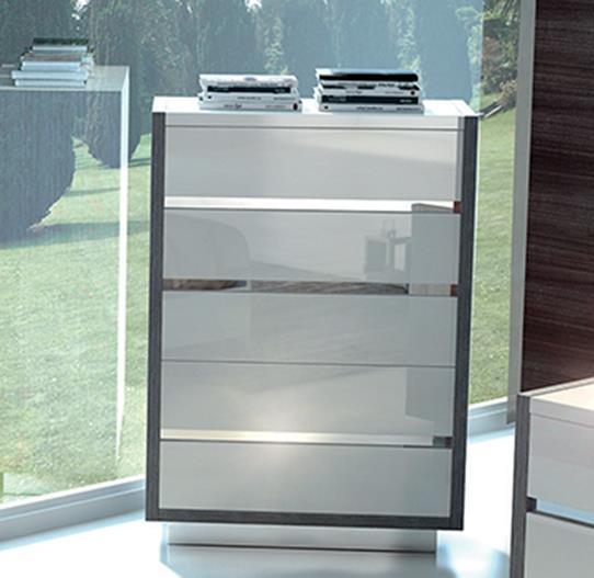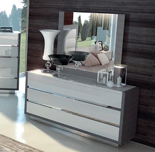 Indulge in the epitome of modern sophistication with the Mangano Modern Queen Bed, a masterpiece of Italian design that brings a touch of sleek, contemporary style to your bedroom. With its striking high-gloss white and silver-tone finish, this bed is a statement piece that radiates luxury and minimalist charm. The clean lines and chrome accents of the Mangano Collection embody the very essence of chic modernity, ensuring that your bedroom becomes an oasis of trendsetting elegance.The Mangano Collection doesn't just look fabulous; it's designed to adapt to your lifestyle. Whether you choose the Queen or King size, this bed accommodates your space and preferences with ease. Enhance the cohesive look of your bedroom with optional additions such as the 5-Drawer Chest, dresser, or nightstands, each piece echoing the bed's refined aesthetic for a harmonious sleeping environment.