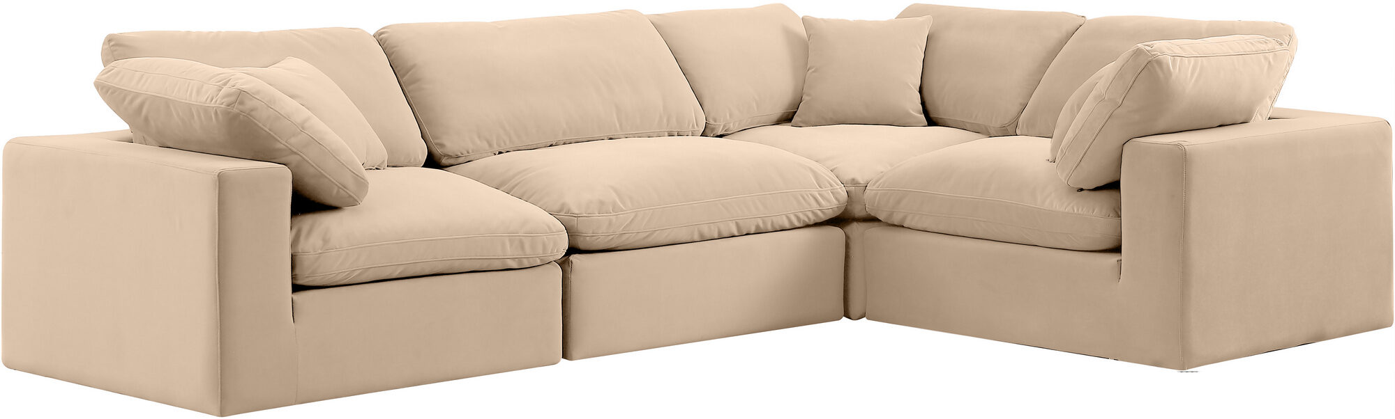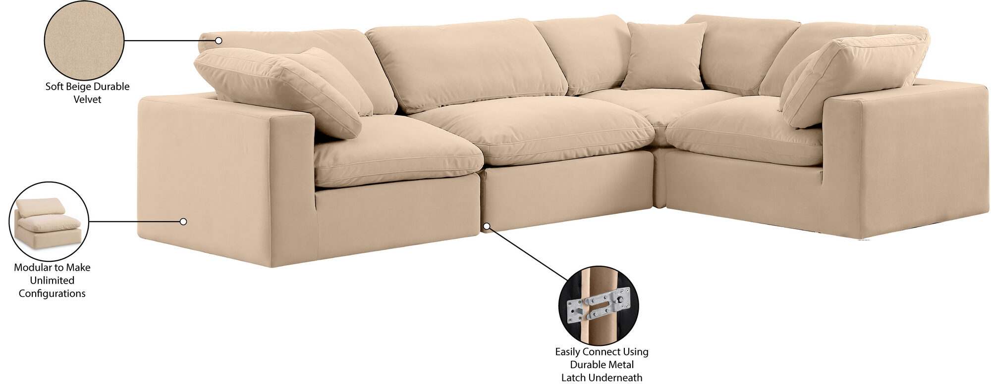 Transform your living area into a haven of luxury with the sleek and sophisticated beige Comfy velvet sectional. This contemporary piece of furniture is the epitome of versatility and elegance, seamlessly integrating with the rest of the Comfy collection to elevate your decor. The sectional's sumptuous velvet upholstery, in an elegant beige hue, is not only durable but also exudes an air of opulence.Sink into the lavish comfort of the overstuffed down feather cushions, meticulously designed to offer an unparalleled seating experience. The sectional's robust frame is encased in dense foam, ensuring both support and an inviting softness that beckons you to unwind. Whether you're lounging after a long day or entertaining guests, this sectional promises relaxation without compromising on style.