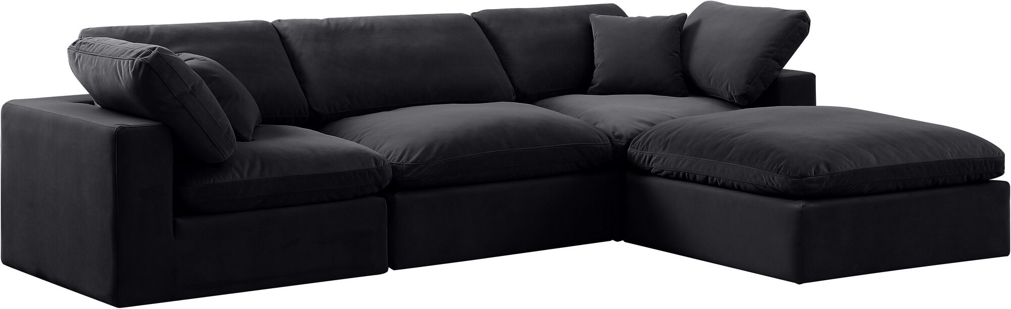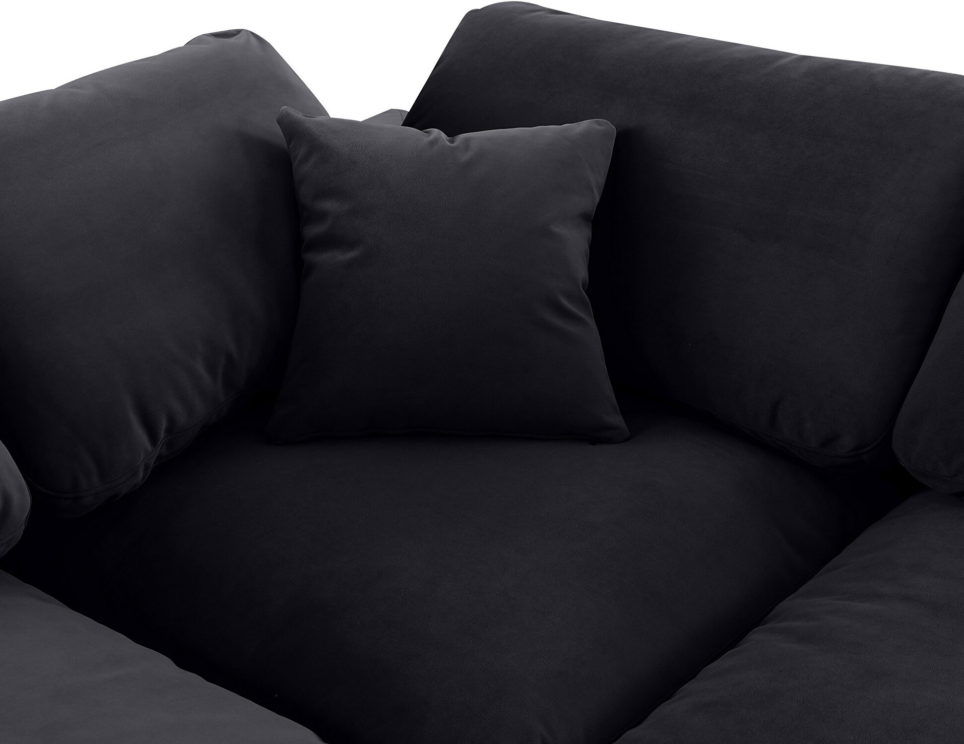 Transform your living area into a haven of luxury with the sleek and sophisticated black Comfy velvet sectional. This contemporary piece of furniture is the epitome of versatility and elegance, seamlessly integrating with the rest of the Comfy collection to elevate your decor. The sectional's sumptuous velvet upholstery, in an elegant black hue, is not only durable but also exudes an air of opulence.Sink into the lavish comfort of the overstuffed down feather cushions, meticulously designed to offer an unparalleled seating experience. The sectional's robust frame is encased in dense foam, ensuring both support and an inviting softness that beckons you to unwind. Whether you're lounging after a long day or entertaining guests, this sectional promises relaxation without compromising on style.