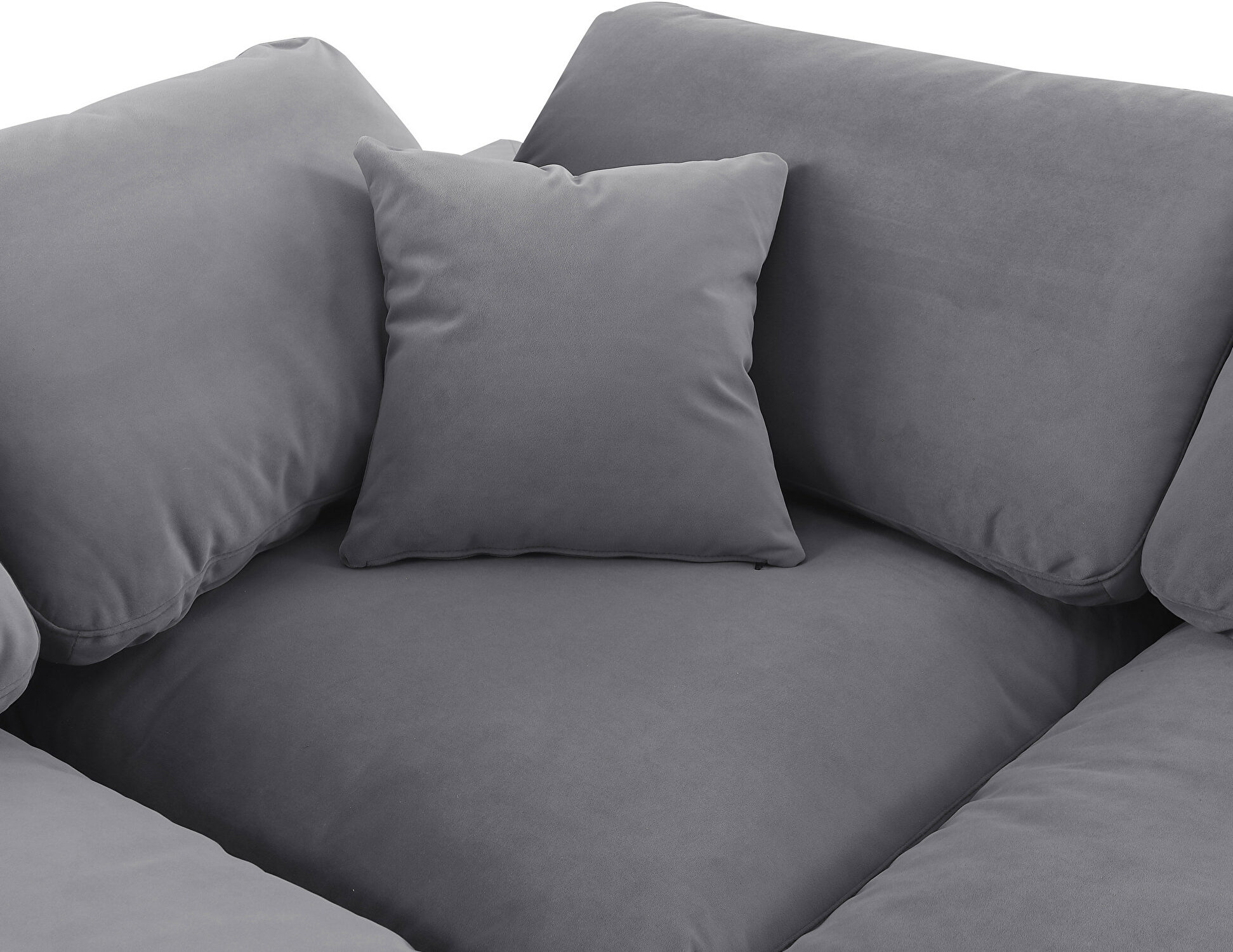 Transform your living area into a haven of luxury with the sleek and sophisticated gray Comfy velvet sectional. This contemporary piece of furniture is the epitome of versatility and elegance, seamlessly integrating with the rest of the Comfy collection to elevate your decor. The sectional's sumptuous velvet upholstery, in an elegant gray hue, is not only durable but also exudes an air of opulence.Sink into the lavish comfort of the overstuffed down feather cushions, meticulously designed to offer an unparalleled seating experience. The sectional's robust frame is encased in dense foam, ensuring both support and an inviting softness that beckons you to unwind. Whether you're lounging after a long day or entertaining guests, this sectional promises relaxation without compromising on style.