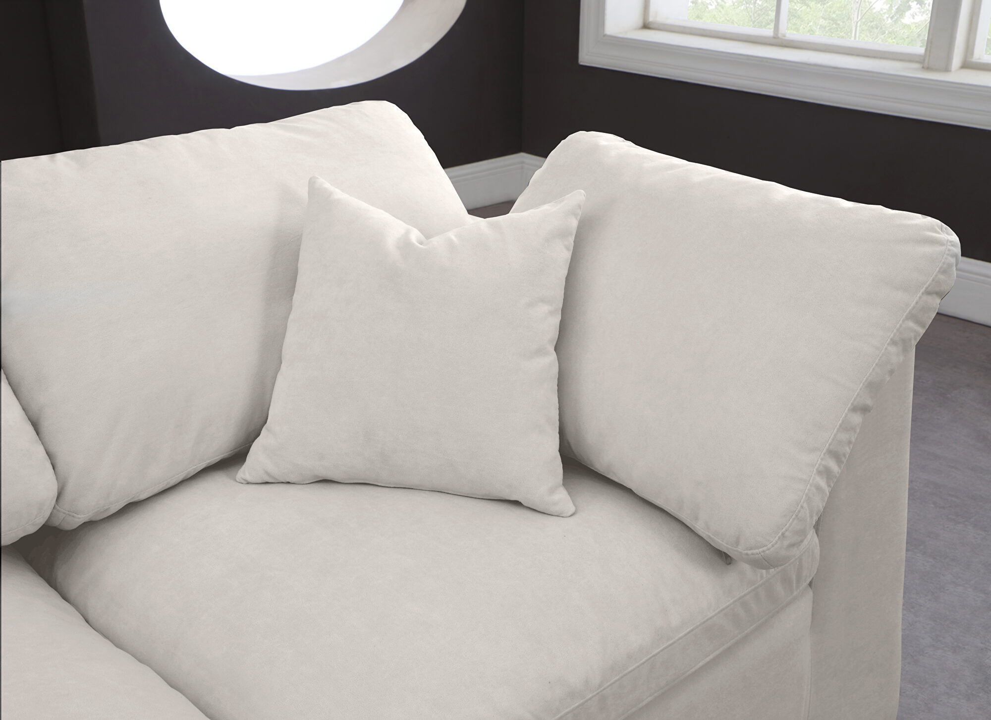 Experience the epitome of versatile comfort with our luxurious Cozy 4-piece Sectional Sofa, the ultimate blend of flexibility and lavishness. Wrapped in a sumptuous velvet cream fabric, this modular masterpiece invites you to personalize your living space. Whether you seek a snug sofa for intimate gatherings or a sprawling sectional for grand occasions, the Cozy collection adapts to your desires. It comprises three distinct components: an inviting ottoman, a cozy corner wedge, and a sleek armless chair, each sold individually for a truly customizable seating experience.Build the lounge area of your dreams with ease, as every piece is designed to connect seamlessly with user-friendly latches. Sink into the opulence of overfilled soft fiber cushions that promise unparalleled comfort for those endless nights of relaxation or lively social gatherings. The elegant design boasts an overall height of 35 inches with the back cushion fully upright, ensuring a statuesque presence in your home.