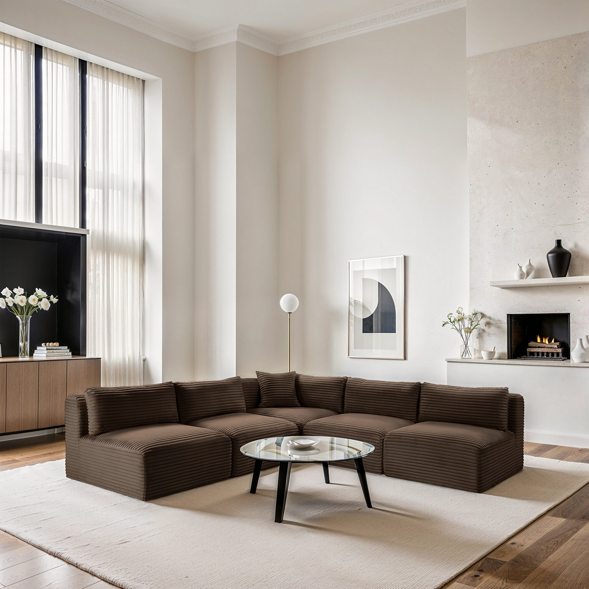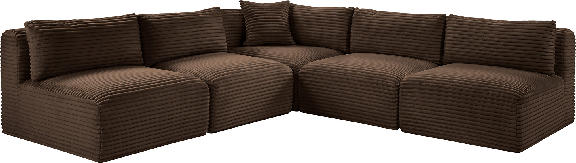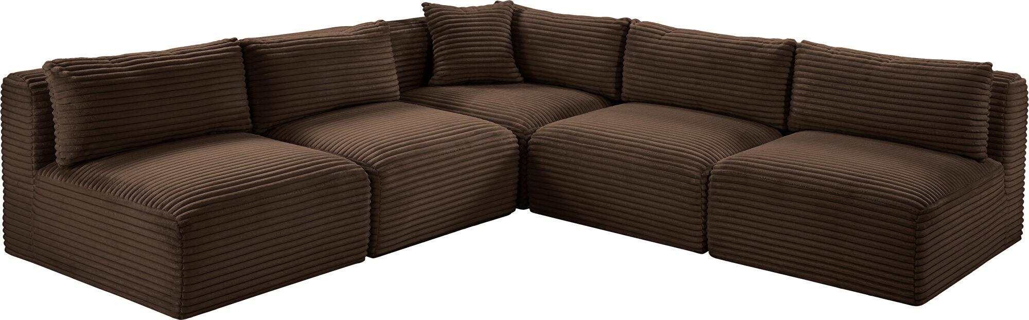 Elevate your living space with the Shaggy Brown Corduroy Modular 5pcs Sectional (1 wedge & 4 armless chairs), where luxury meets functionality. Draped in a sumptuous, soft furry-textured corduroy fabric, this sectional invites you to experience comfort like never before. The bold, 1-inch-wide corduroy wales add a contemporary edge to its appearance, making a statement in any room.Crafted for both sophistication and endurance, the sectional's high-performance fabric offers peace of mind with its water-repellent and stain-resistant properties, preserving the sectional's allure for years to come. Sink into the plush foam seating, meticulously designed to provide a supportive and cozy retreat after a long day.