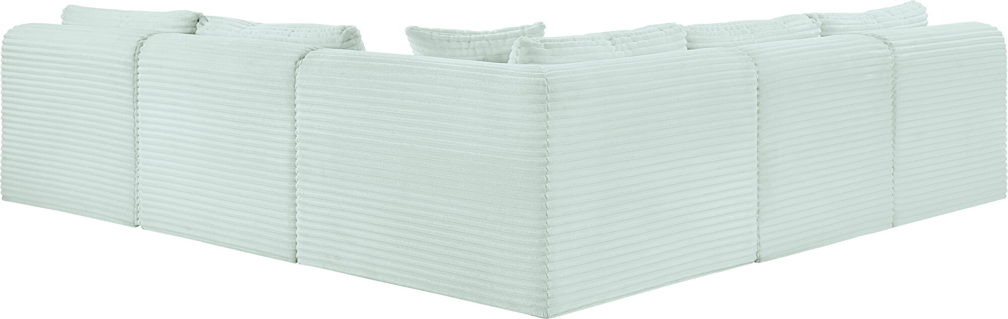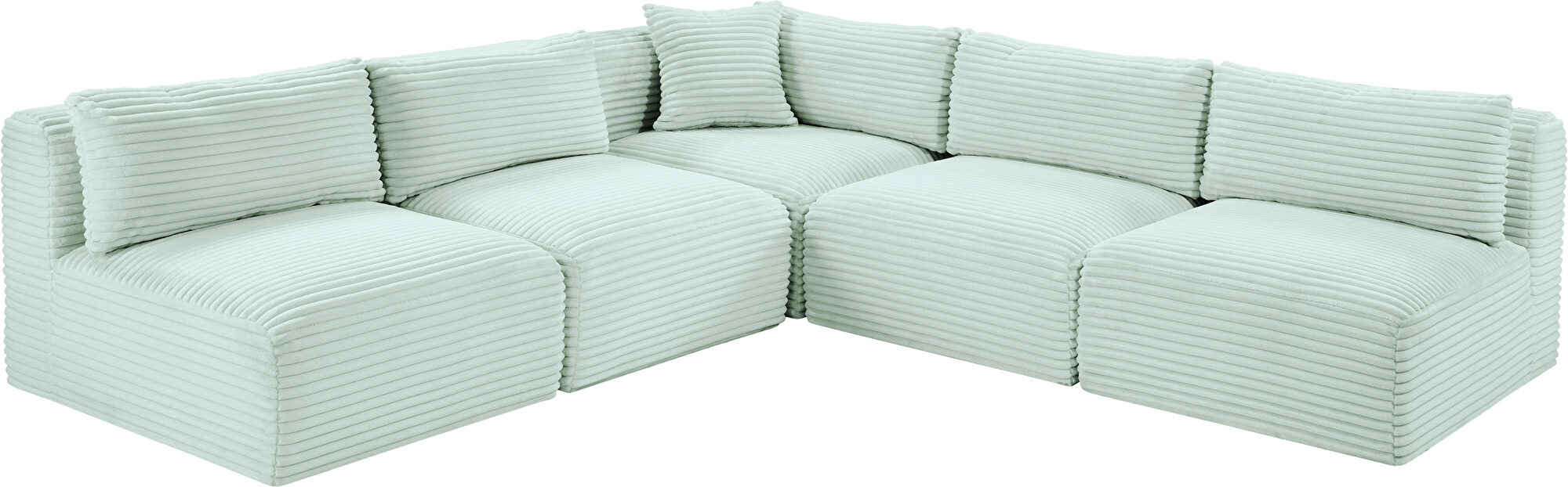 Elevate your living space with the Shaggy Mint Corduroy Modular 5pcs Sectional (1 wedge & 4 armless chairs), where luxury meets functionality. Draped in a sumptuous, soft furry-textured corduroy fabric, this sectional invites you to experience comfort like never before. The bold, 1-inch-wide corduroy wales add a contemporary edge to its appearance, making a statement in any room.Crafted for both sophistication and endurance, the sectional's high-performance fabric offers peace of mind with its water-repellent and stain-resistant properties, preserving the sectional's allure for years to come. Sink into the plush foam seating, meticulously designed to provide a supportive and cozy retreat after a long day.