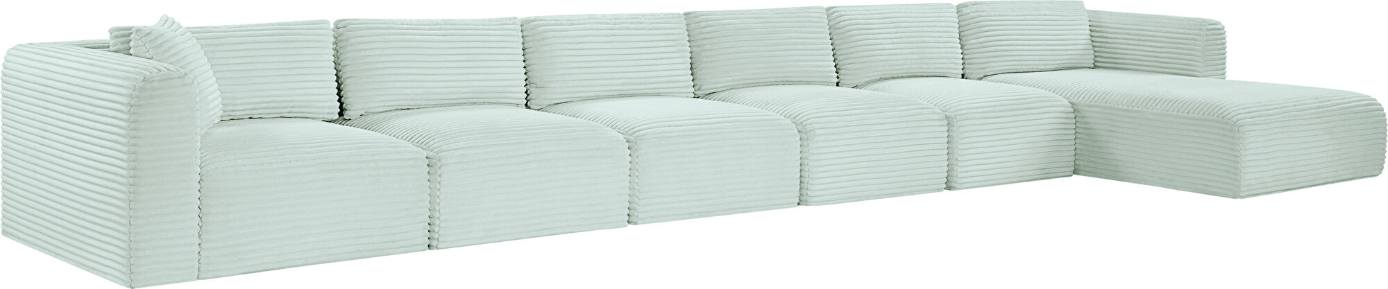 Elevate your living space with the Shaggy Mint Corduroy Modular 6pcs Sectional (4 armless chairs, 1 chaise and 1 wedge), where luxury meets functionality. Draped in a sumptuous, soft furry-textured corduroy fabric, this sectional invites you to experience comfort like never before. The bold, 1-inch-wide corduroy wales add a contemporary edge to its appearance, making a statement in any room.Crafted for both sophistication and endurance, the sectional's high-performance fabric offers peace of mind with its water-repellent and stain-resistant properties, preserving the sectional's allure for years to come. Sink into the plush foam seating, meticulously designed to provide a supportive and cozy retreat after a long day.