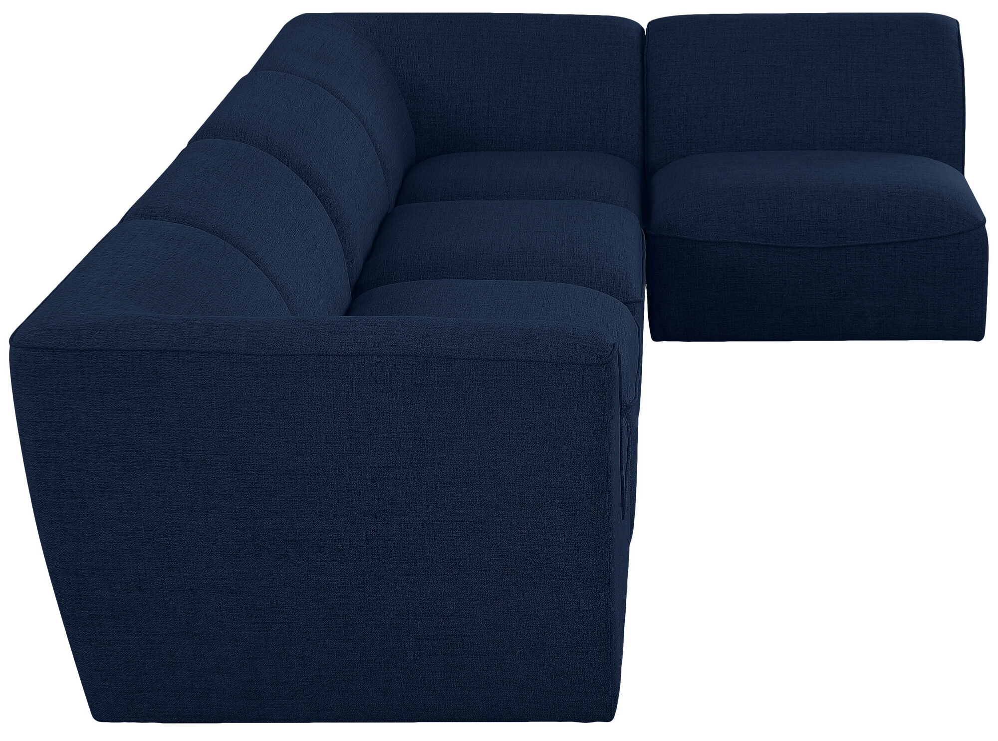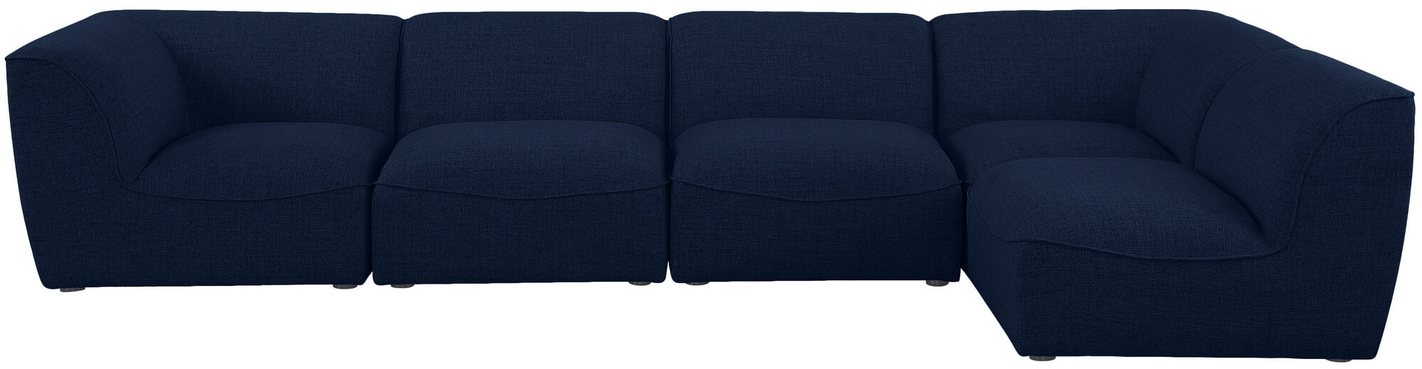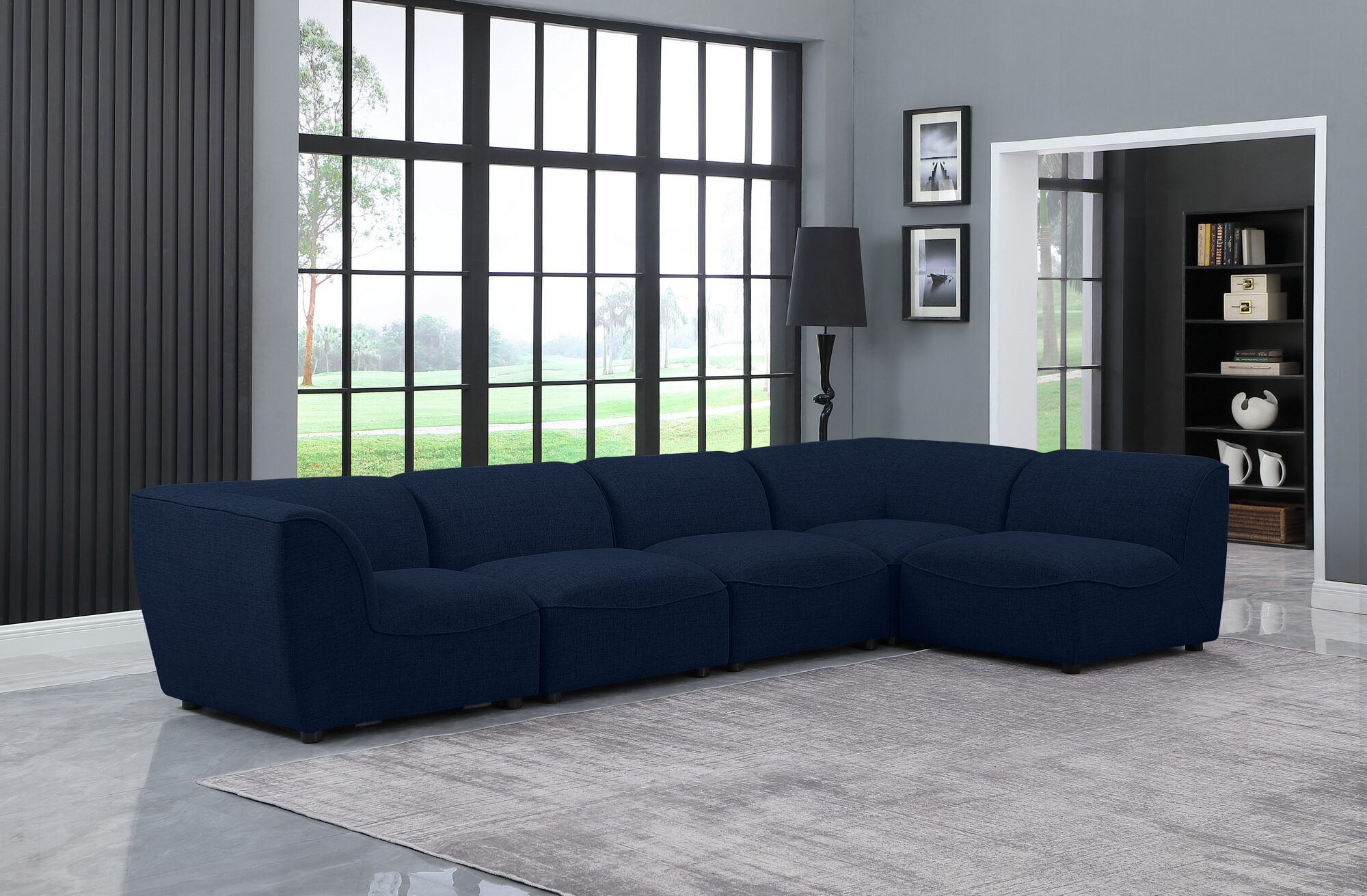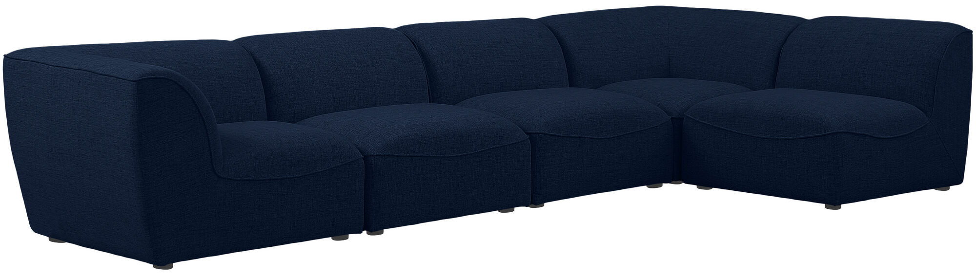 Elevate your living space with the Miramar Modular 5pcs Sectional, a perfect blend of comfort and contemporary style. Designed for versatility and longevity, this sectional boasts a robust frame crafted from top-grade materials, guaranteeing years of reliable use. Draped in a plush, soft navy blue linen-textured upholstery, it invites you to indulge in its luxurious touch, transforming any room into a serene retreat.The beauty of this sectional lies in its modularity; it consists of two corner pieces and three armless chairs, which can be arranged in countless configurations to suit your space and style. The intuitive attachment latches located underneath each piece make it a breeze to mix and match with other items in the Miramar collection, allowing you to create a cohesive and tailored living environment.