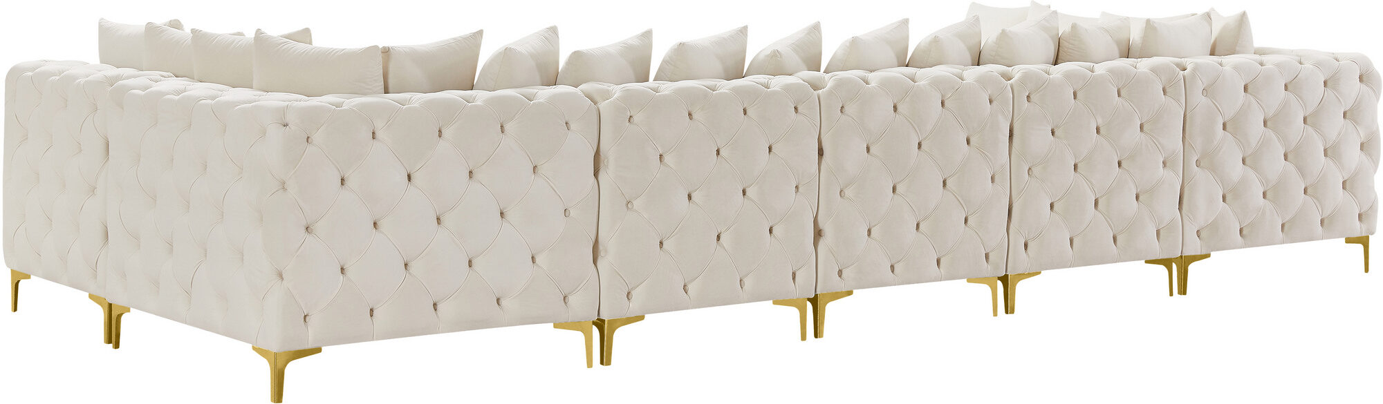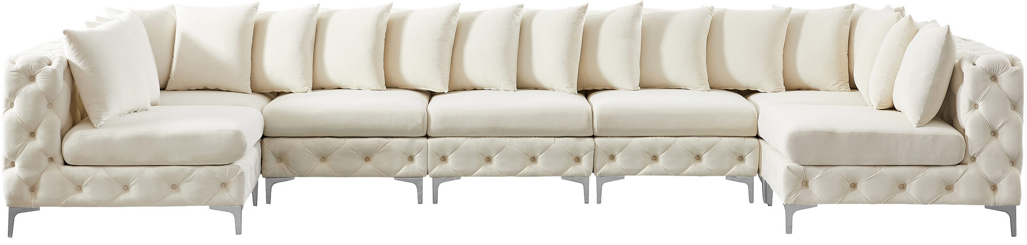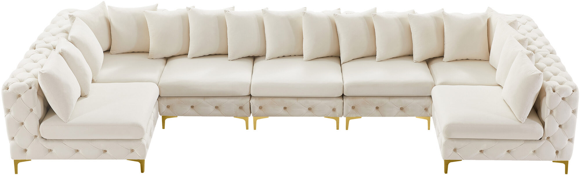 Sink into the sumptuous comfort of the Tremblay 7pcs modular Sectional (2 corners, 5 armless chairs), a true embodiment of modern luxury for your living space. Draped in rich cream velvet, this sectional sofa exudes sophistication with its plush, deep button tufting that invites you to unwind in style. The versatility of the Tremblay is unmatched, coming with two sets of sleek legs in both gold and chrome finishes, allowing you to customize its look to seamlessly blend with your existing decor. The sectional's modular nature means you can arrange it in endless configurations, adapting to your space and needs with ease. Each piece locks securely into place with a simple latch mechanism, providing stability and ease of assembly. Designed with contemporary aesthetics in mind, the Tremblay Sectional not only elevates your living area but also offers a generous inclusion of 12 pillows for an indulgent, cohesive look.Features: