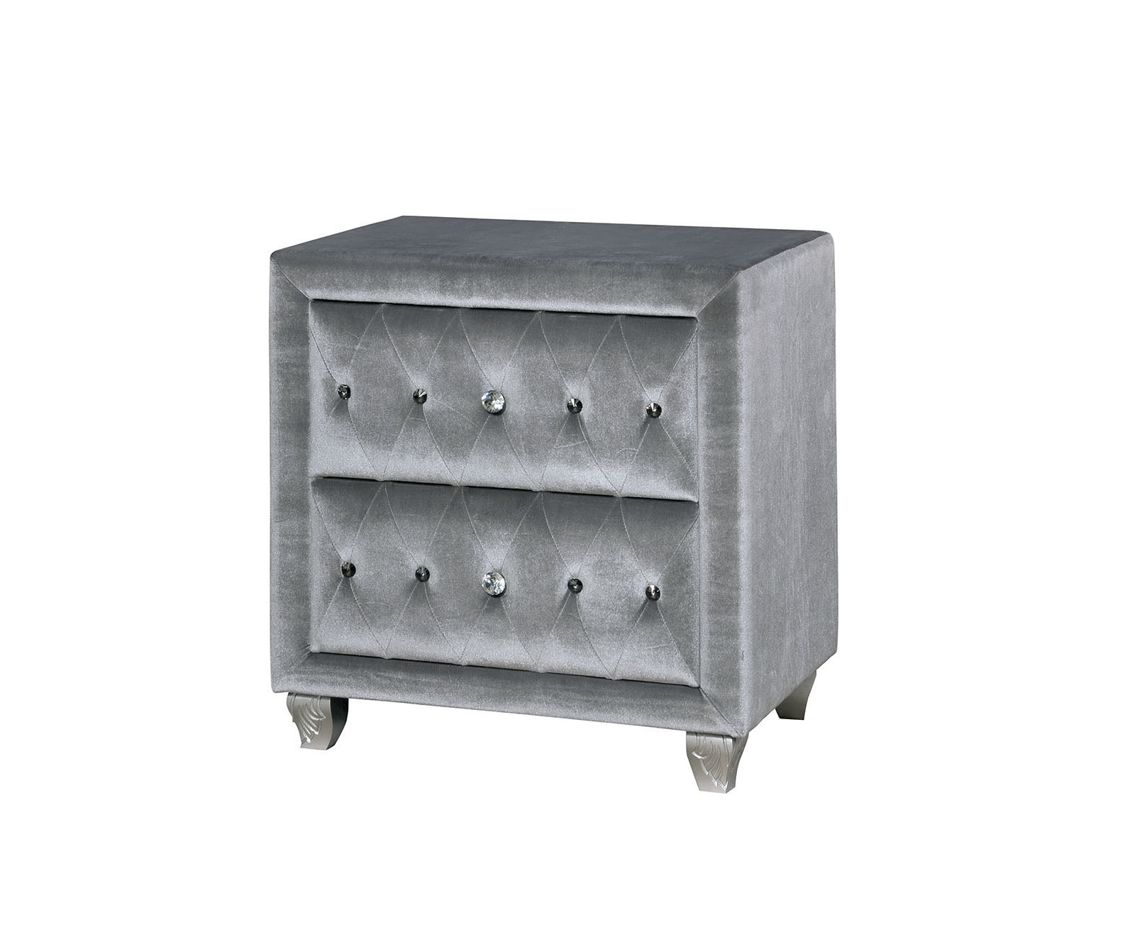 Comforting cushioned flannelette encompasses this gray fabric nightstand. Admire the glimmering acrylic button tufts, run your hands over the soothing fabric, and easily stock essentials in their cavernous storage drawers. Cabriole feet add a well polished finished as they provide unwavering support to this elegant piece.Model: Alzir Gray