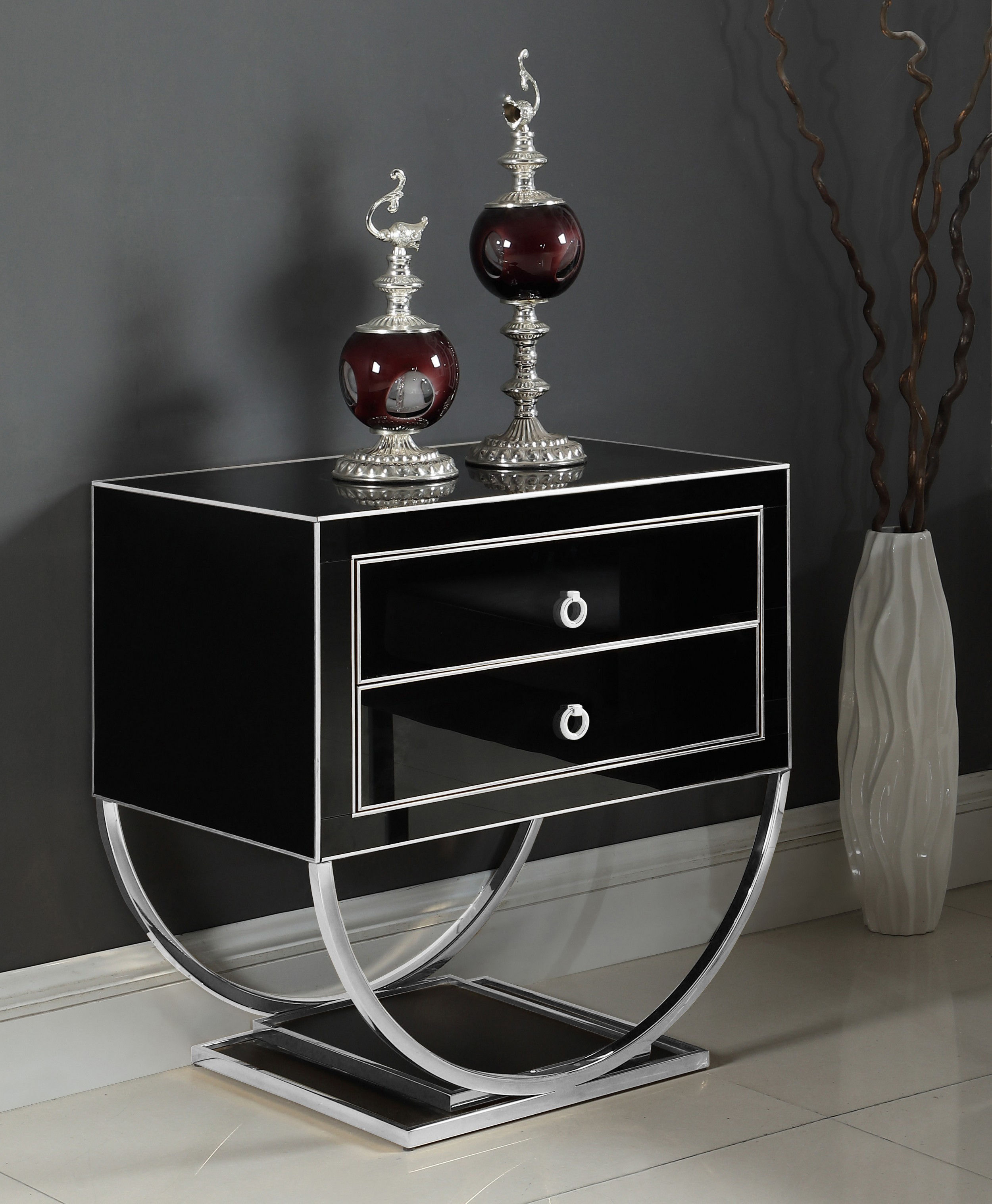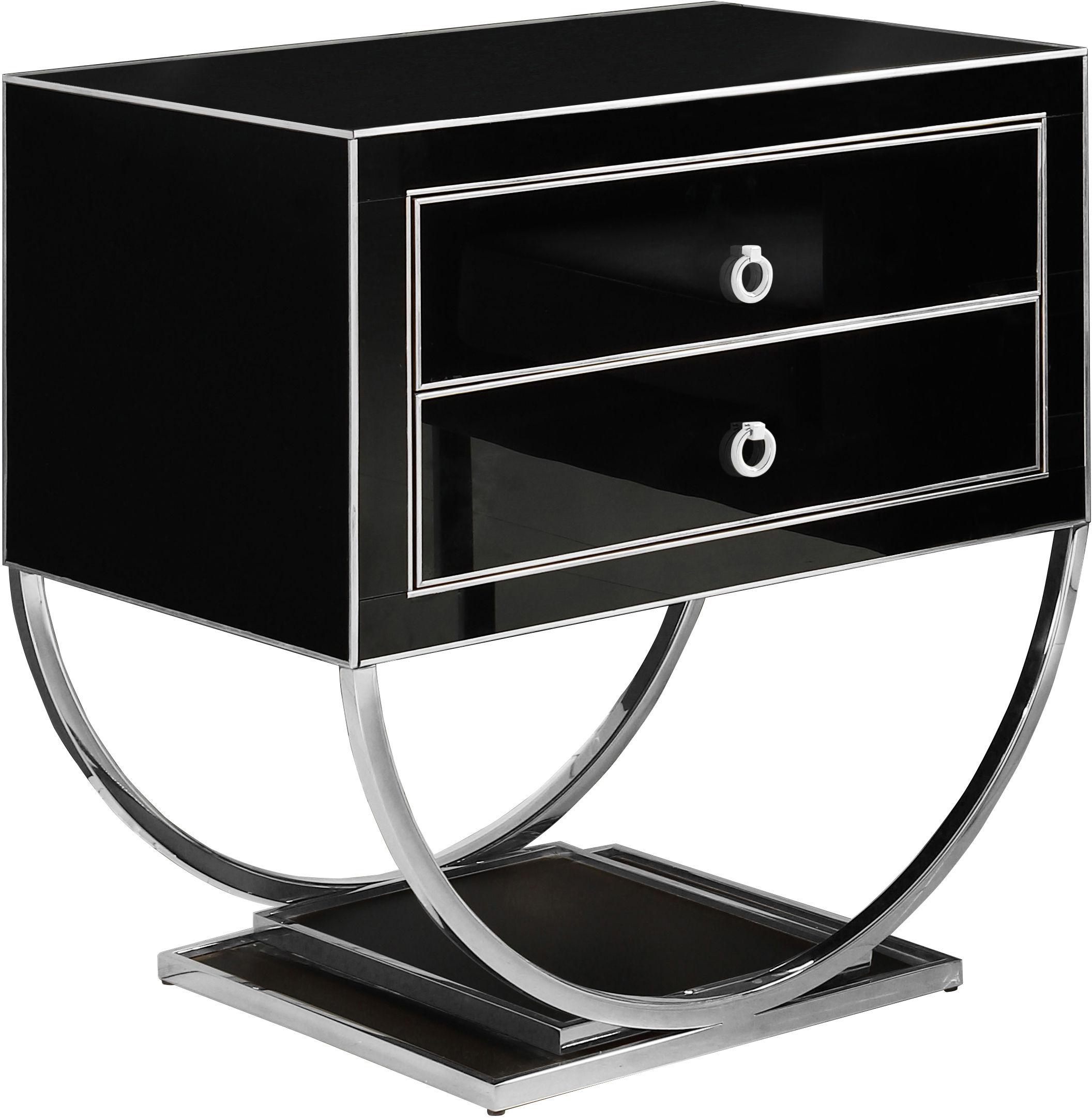 Top off your modern living room with the Alyssa Side Table. This handsome table features a semi-circle base on a dual pedestal for an attention-commanding look. The black glass finish is trimmed in chrome for a contrast that's nothing short of stunning. The double drawers help you organize everything from TV remotes to games and DVDs.Features: