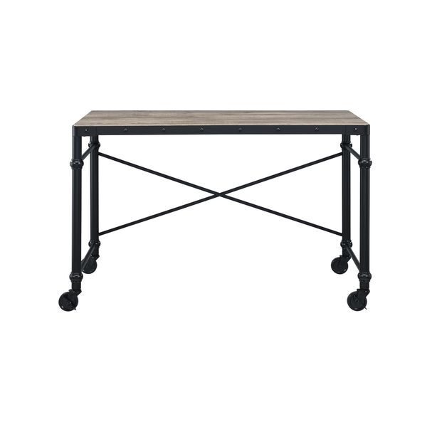 Rustic oak & black finish rectangular wooden top writing desk. Color: rustic oak & black finish. Metal base, nail head accent. Wheels included. Industrial style desk.Features: