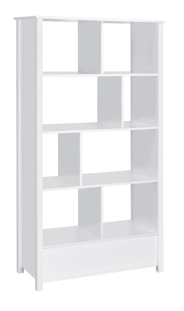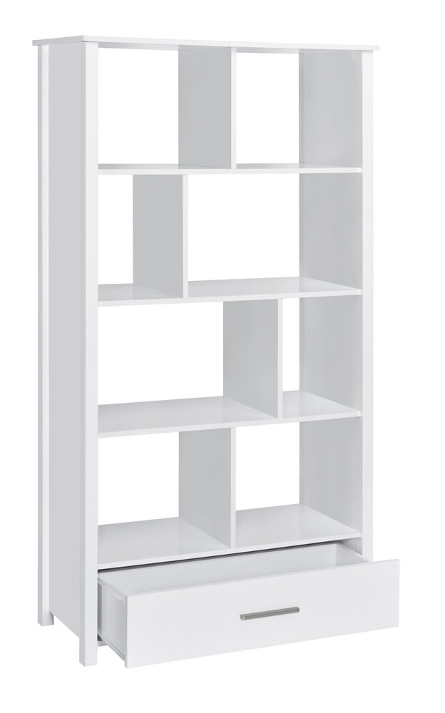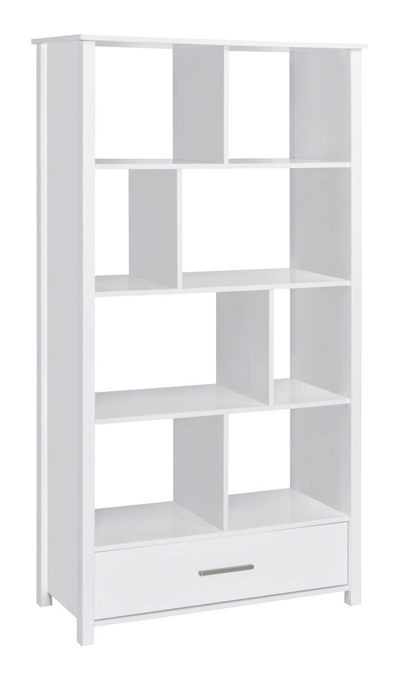Asymmetrical shelves stack against one another to create this stunning, contemporary bookcase. A stylish, eye-catching addition to a home office, this minimalist bookcase invites you to organize office accessories or showcase decor and family photos. Eight separate sections divide items categorically if you wish, while a bottom drawer keeps items out of sight. The single drawer is adorned with a sleek, brushed zinc pull that further lends to the chic nature of this bookshelf. Versatile and functional, place this tall bookcase in the room of your choosing.Features: