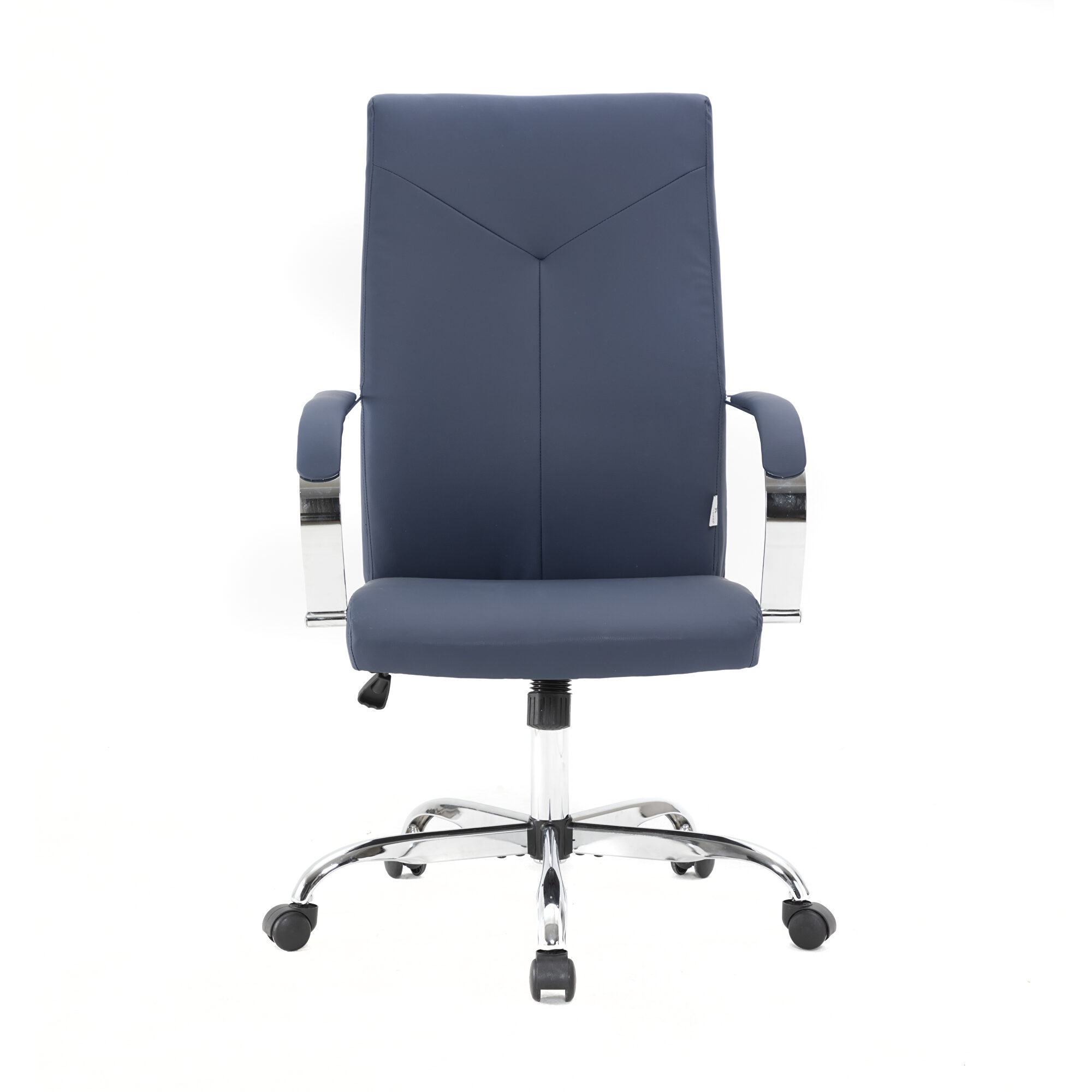 Embrace full luxury with this exceptional Steel Frame Sonora Navy Blue office chair built to provide optimal comfort and a sophisticated aesthetic. The Beautiful Y-shaped stitching will make your chair look good in your contemporary office. The Adjustable Height will help keep your hands aligned with your keyboard for extra productivity. Use the Executive Conference chair's 360-degree swivel wheels to get easily around the office. This chair is the perfect complement to any conference, executive, and management setting. The seat and high back are upholstered with elegant leather and padded with foam for a supported seat. The extra high back will support your back in a comfortable fashion. This chair is perfect for the modern office and is a welcome embodiment of the spirit of progress and determination.Features: