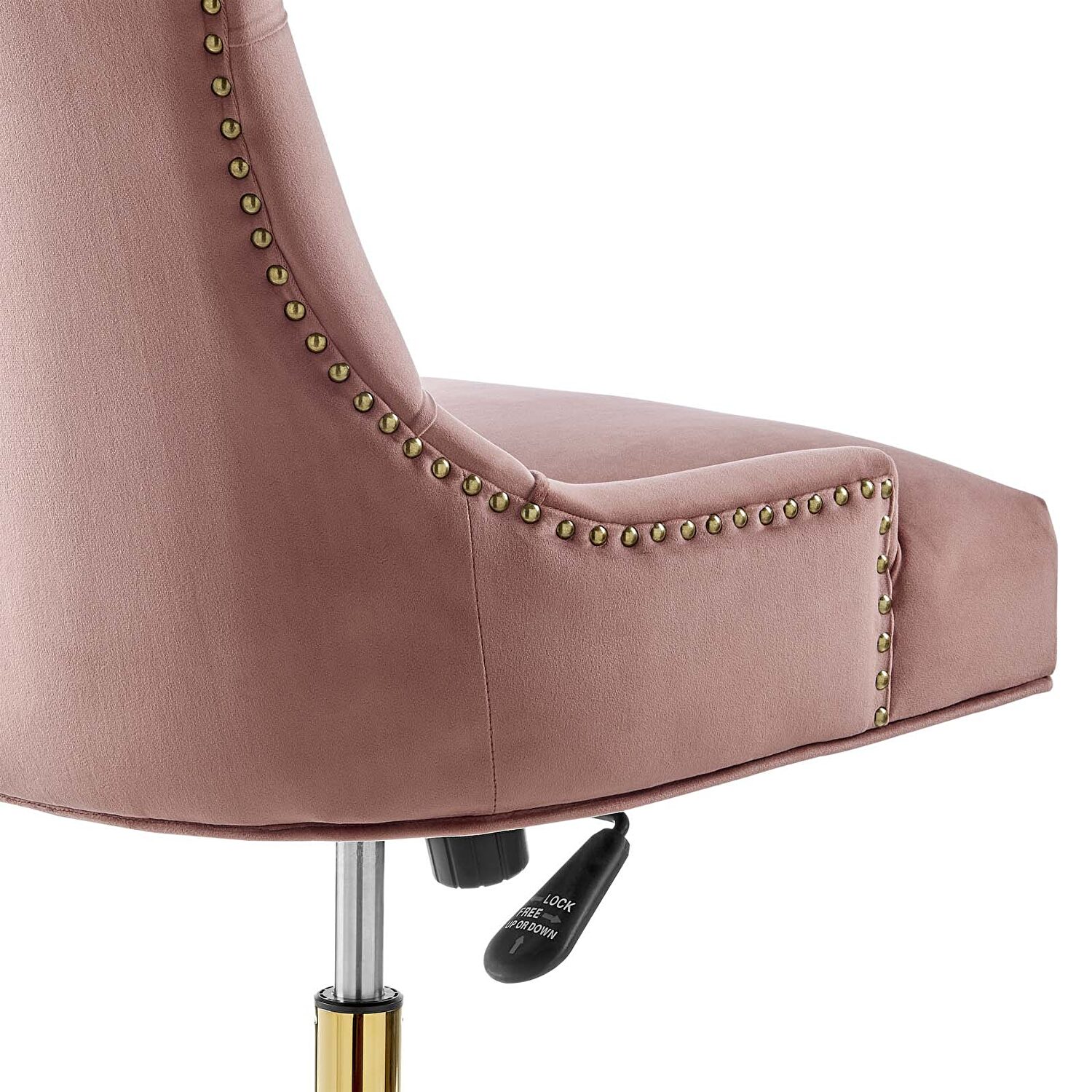 Introduce vintage flair and glam deco appeal with the Regent Tufted Performance Velvet Swivel Office Chair. Metal nailhead trim and tufted buttons provide visual depth, while a luxuriously padded upholstered stain-resistant performance velvet back and seat for exceptional support to this superbly constructed computer desk chair. A polished gold metal base and five single ball nylon casters provide easy movement over hardwood or carpeted surfaces while a full 360-degree swivel, tilt tension control, and pneumatic height adjustment create a custom seating experience for optimal performance. Perfect for the modern home or office, this velvet office chair is a desirable addition to any workspace. Chair Weight Capacity: 287 lbs.Features: