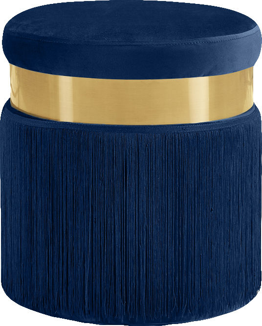 Glam it up with this Yasmine Navy Velvet Ottoman/Stool. An elegant design marries traditional design elements with contemporary panache, with the result being this fabulous stool that will become the center of attention wherever you use it. The top of this beautiful stool is covered in velvet for a chic sophistication and soft comfort as you sit. The bottom is outfitted with thin tassels for added texture and fun, and a stainless steel band intersects the top and bottom to form an interesting and visually stunning contrast.Model: Jasmine Navy