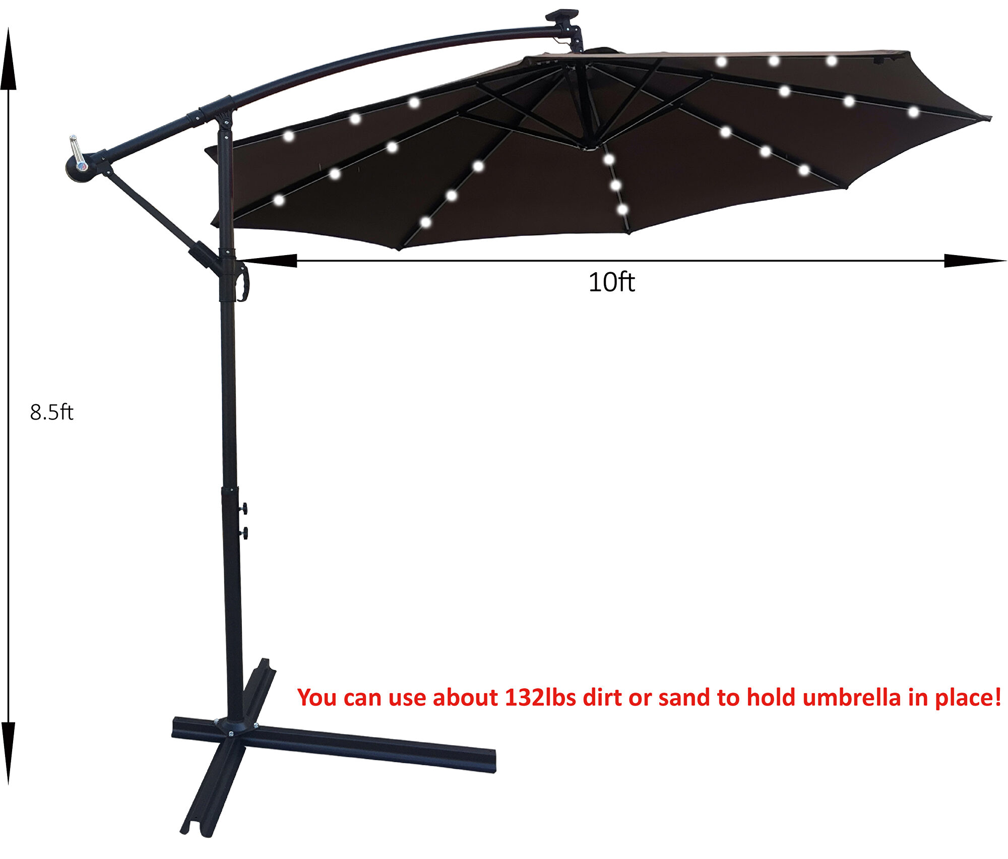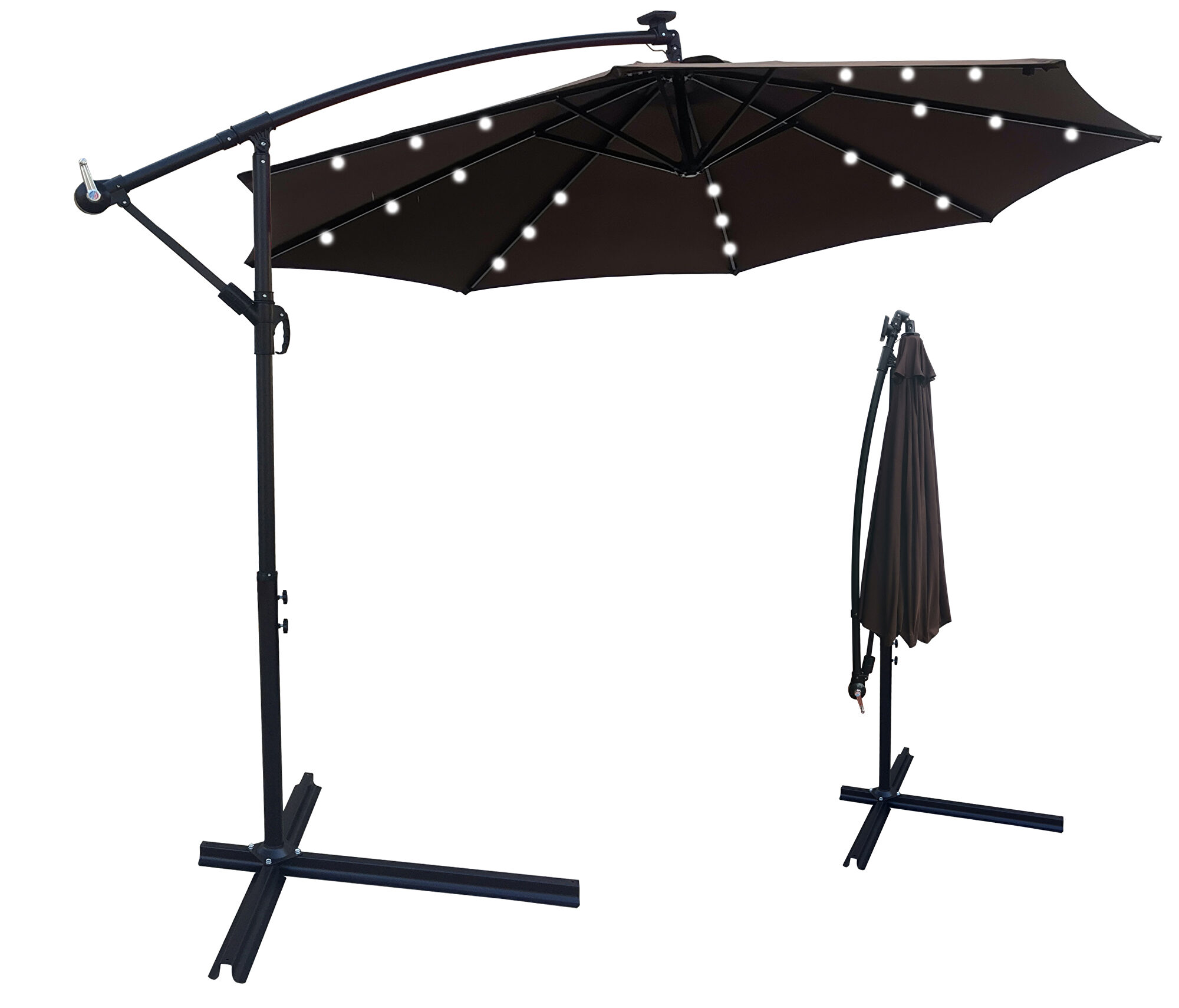 In the summer, it's very comfortable to organize activities or lie down outdoor, however, there's definitely a premise: you need a piece of shade to protect your skin from the sun. Here comes a outdoor patio solar LED umbrella, which provides you with such a large shade to enjoy the beautiful life of summer. There's no better way to sit back and enjoy the sun than with this outdoor solar LED patio umbrella from us. 100% high quality polyester canopy is waterproof, fade resistant and easy to clean. This outdoor patio umbrella has excellent materials and quality, and its waterproof and ultraviolet. The patio umbrella has 24 solar-powered LED lights that will light up your terrace when night falls. Soft lighting creates a romantic atmosphere for you. All LED bulbs are powered by solar panels at the top to save energy while maintaining perfect lighting. This solar LED patio umbrella is made of rust-free powder coated steel pole and 6 sturdy heavy duty square ribs for longer usage. Meanwhile, the bottom of the cross metal ensures the stability and balance of the umbrella and prevents the umbrella from tilting even in windy weather.Features: