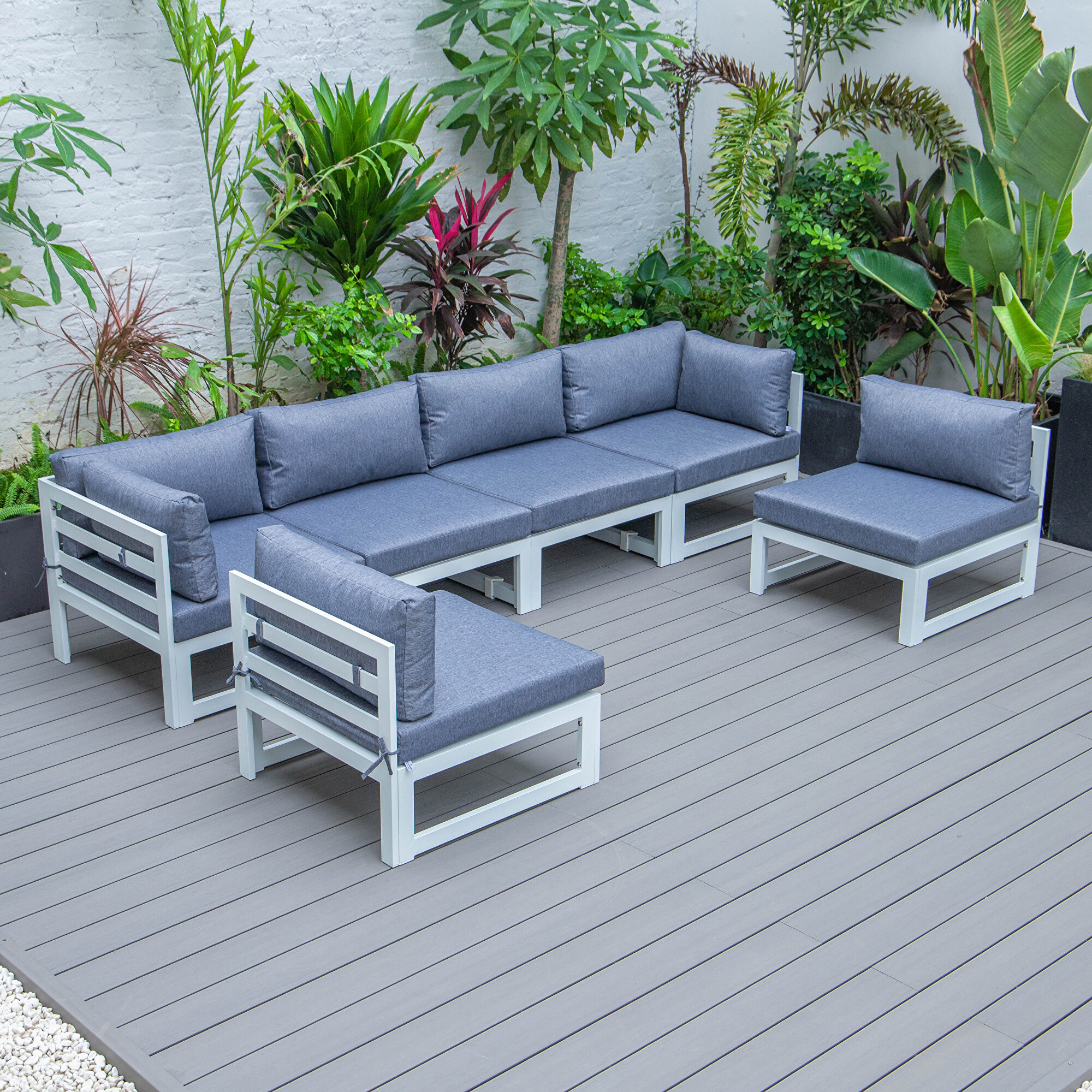 Set up a spot for Fresh air, chilled drinks & warm breezes, whether you're looking to host the neighbors in style or just spread out to enjoy warmer weather there's no better way to extend your living space than with our Chelsea Blue modern outdoor sectional set. We have a professional outdoor design team, focusing on the design of high-quality and weather resistance outdoor sectional sets. The solid structure frame ensures stability and the cushions come with ties lock the cushions for placement where you want them. Sitting enough for six people Shape the sectional in the traditional U-Shape or you can shape it however you like to help you make the most out of your patio or deck. Weight Capacity: 330 lbsFeatures: