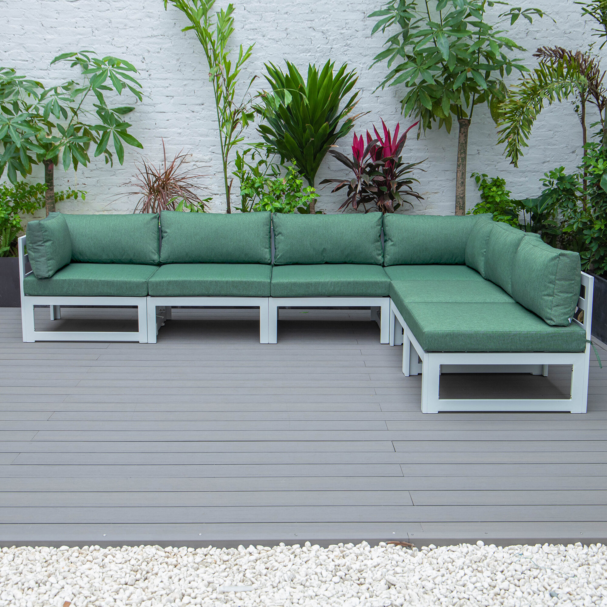 Set up a spot for Fresh air, chilled drinks & warm breezes, whether you're looking to host the neighbors in style or just spread out to enjoy warmer weather there's no better way to extend your living space than with our Chelsea Green modern outdoor sectional set. We have a professional outdoor design team, focusing on the design of high-quality and weather resistance outdoor sectional sets. The solid structure frame ensures stability and the cushions come with ties lock the cushions for placement where you want them. Sitting enough for six people Shape the sectional in the traditional U-Shape or you can shape it however you like to help you make the most out of your patio or deck.Features: