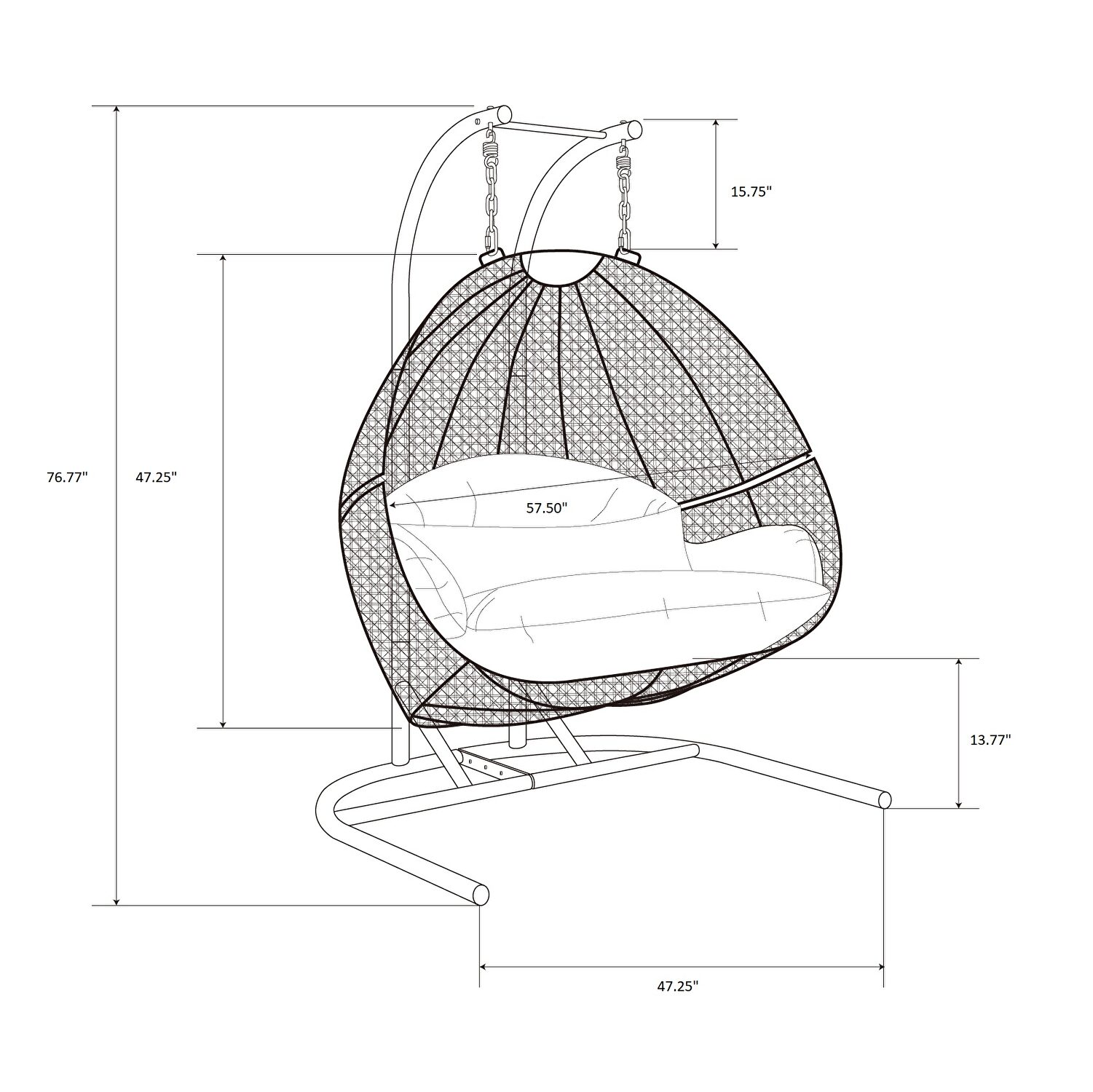 This fun egg-shaped porch swing chair that fits 2 people comfortably was built to last in the outdoors with its strong durable iron frame it will be perfect for all weathers. Sit in luxurious comfort while surrounded by the peace and beauty of your backyard, or enjoy a good book indoors with this comfortable hanging chair. Weight Capacity: 530Features: