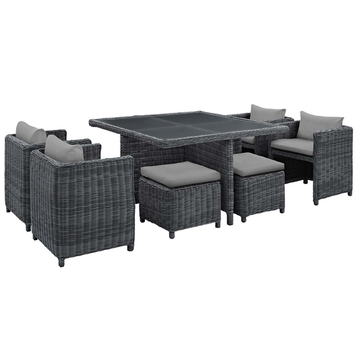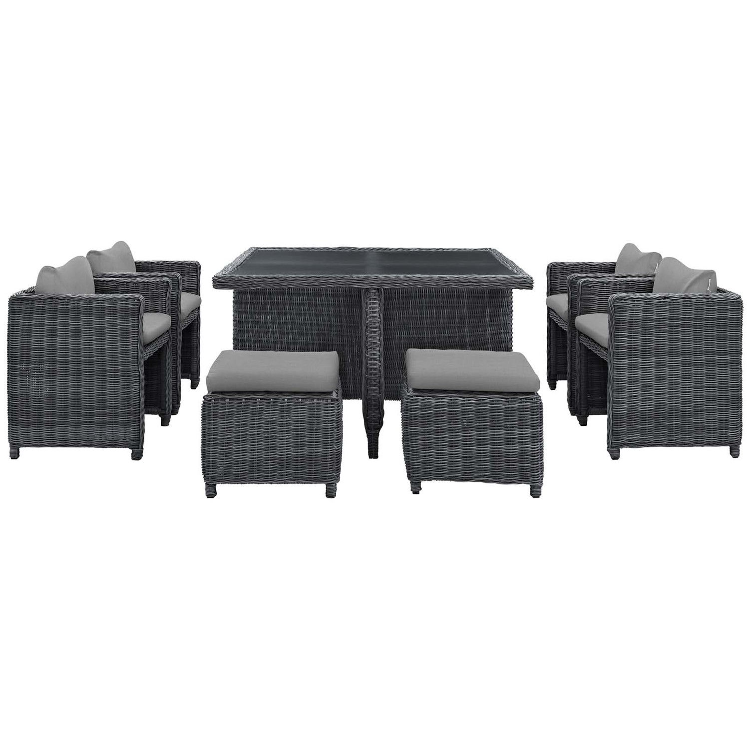 Experience the outdoors with exceptional comfort and quality. Summon offers an exquisite two-tone synthetic rattan weave, plush all-weather cushions with industry-leading Sunbrella® fabric, UV protection, and a sturdy powder-coated aluminum frame. Featuring rounded arms and an elegant modern look, Summon is an avant-garde outdoor sectional series well-equipped for enhancing patio, backyard, or poolside gatherings. Shown here in gray / gray combination. All 9 pieces included.Model: Summon 9 Gray