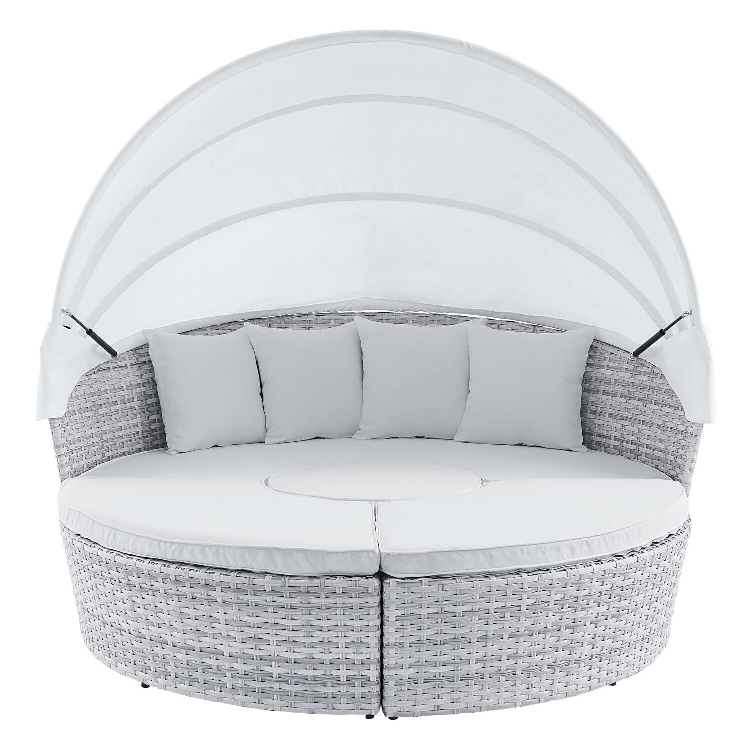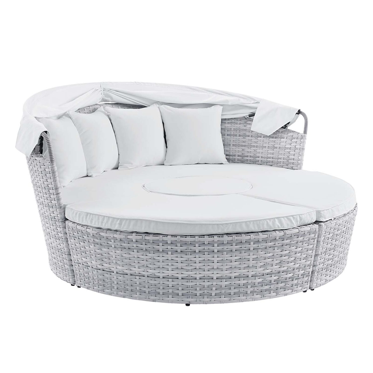 Sprawl out and enjoy relaxing amidst the warm summer breeze with the Scottsdale Outdoor Patio Sunbrella® Daybed in light gray/ White finish. A 4-piece daybed, Scottsdale is a versatile seating solution that allows for both entertaining and solo lounging on the sponge-padded cushions with removable all-weather Sunbrella® covers. Featuring a sturdy powder-coated aluminum frame that can withstand the elements, this daybed is wrapped in UV-resistant synthetic rattan and features a collapsible sun canopy to shield your outdoor leisure time with shade. This stylish daybed is the perfect choice for the poolside, backyard, deck, or outdoor patio. Weight Capacity: 771 lbs.Features: