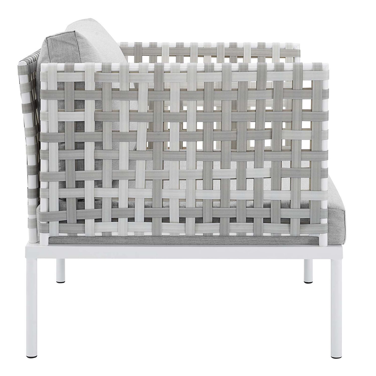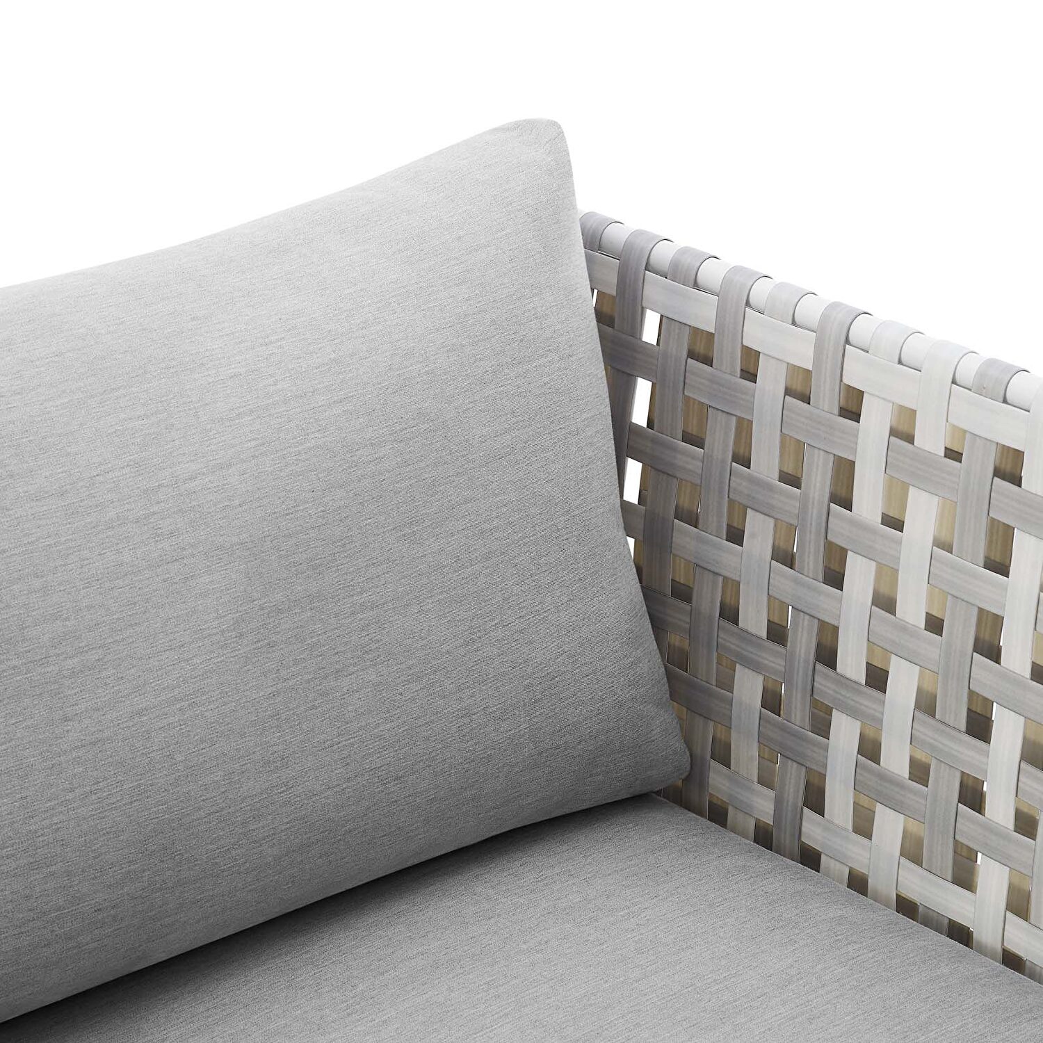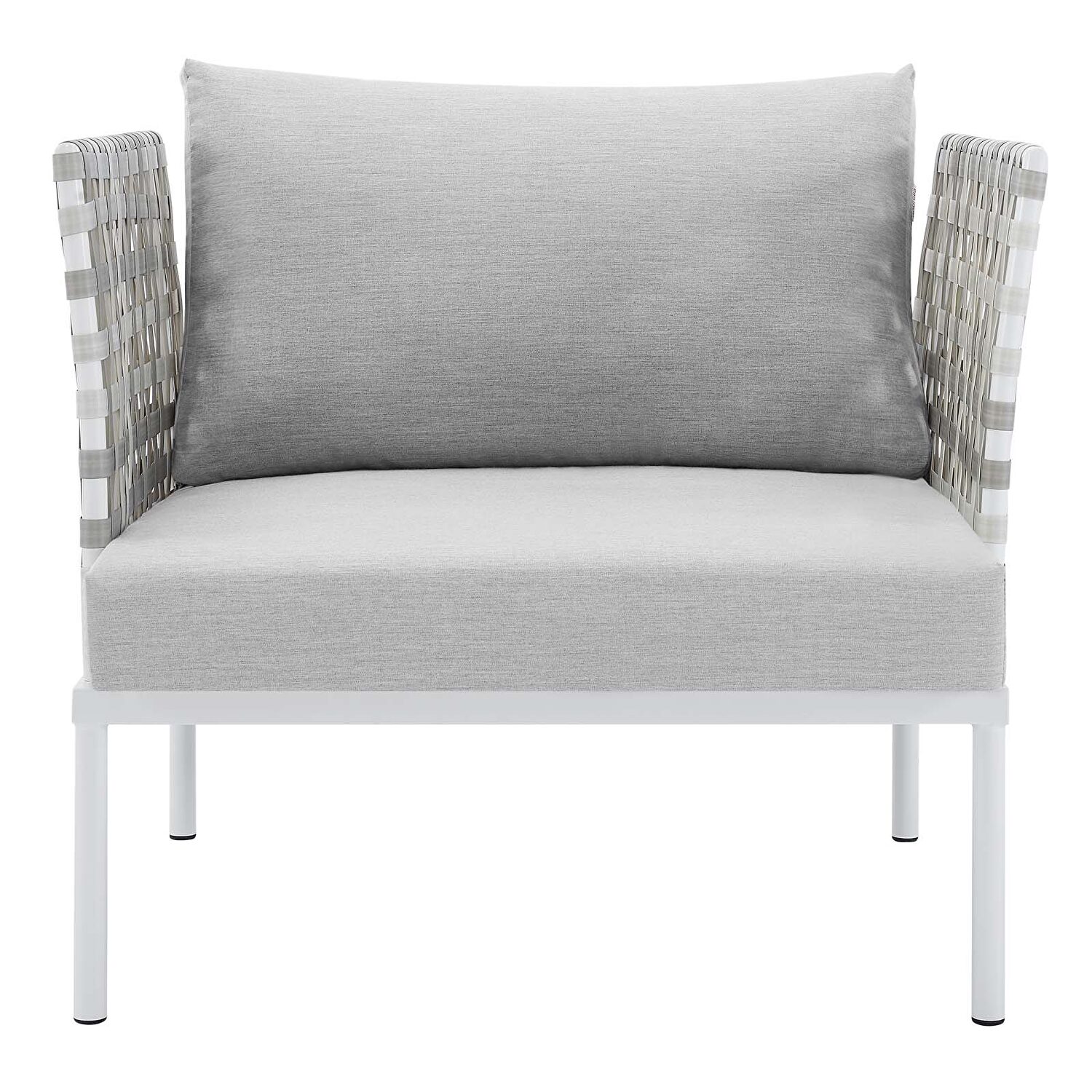 Engage life with Harmony Outdoor Patio Armchair. Enjoy casual conversation under the open sky with an all-weather waterproof outdoor chair from a versatile furniture set that delivers an exceptional outdoor porch, patio, balcony or garden experience. An exceptional modern outdoor furniture set that exceeds expectations, Harmony Patio Armchair comes with synthetic rattan seat back weave, square powder coated aluminum bases, Sunbrella® cushions, and non-marking foot caps. An outside chair that arranges according to the spontaneous needs of your guests, set your sights on open and inspired moments with the Harmony Outdoor Patio Collection.Features: