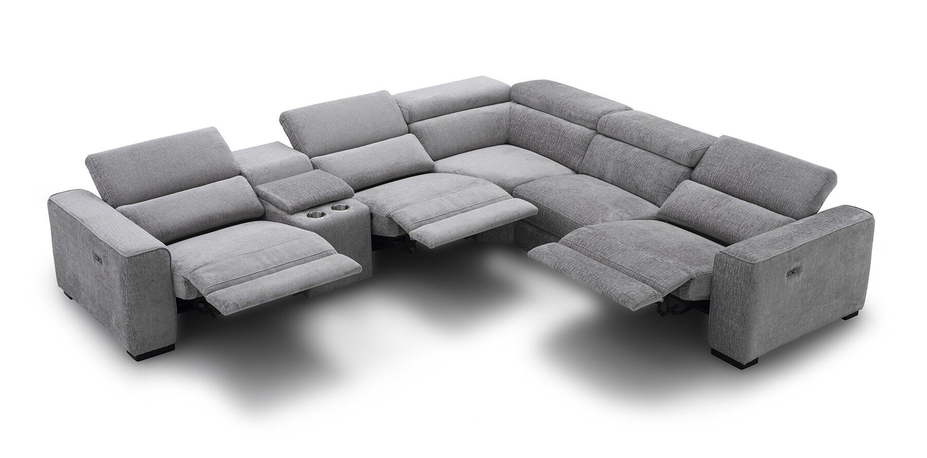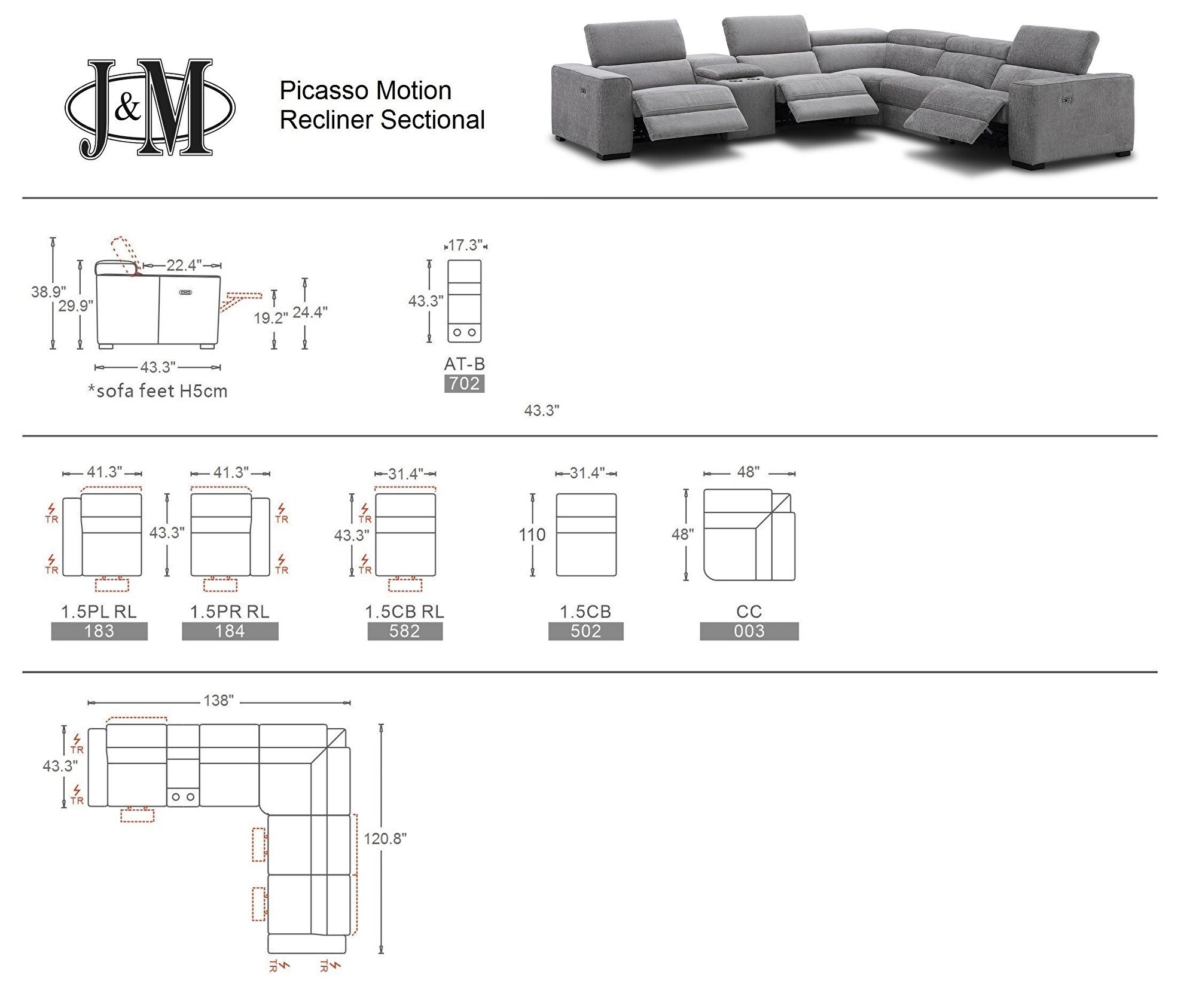 Elevate your living space with the Picasso Motion Sectional in light gray fabric, a masterpiece of design that combines form and function with unparalleled elegance. The sleek lines and generous seating of this sectional create an inviting atmosphere, while its fully modular nature allows for endless configuration possibilities to fit your unique space.Experience the pinnacle of relaxation with three powered recliners, each equipped with its own adjustable headrest, ensuring personalized comfort for every user. The six-piece set includes a convenient console that not only offers two cup holders and ample storage but also comes with built-in USB ports and 110v wall adapters to keep your devices charged and within reach.