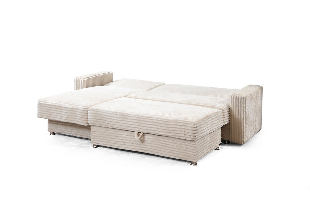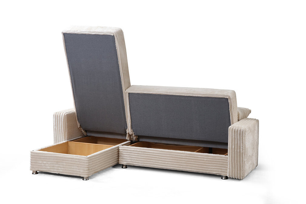 Elevate your living space with the Soft Sectional, a marvel of comfort and versatility. Available in four elegant hues—sleek black, rich brown, warm beige (shown here), and modern gray - this sectional effortlessly complements any interior design palette. Its clever reversible design allows you to assemble the chaise on either side, ensuring a perfect fit for your room layout.The Soft Sectional isn't just about looks; it's designed with practicality in mind. Both the chaise and sofa segments boast hidden storage compartments, offering a convenient space to tuck away blankets, books, or games. And for those times you have guests or simply wish to relax, the sectional converts into a bed, providing an additional sleeping area without compromising on style.