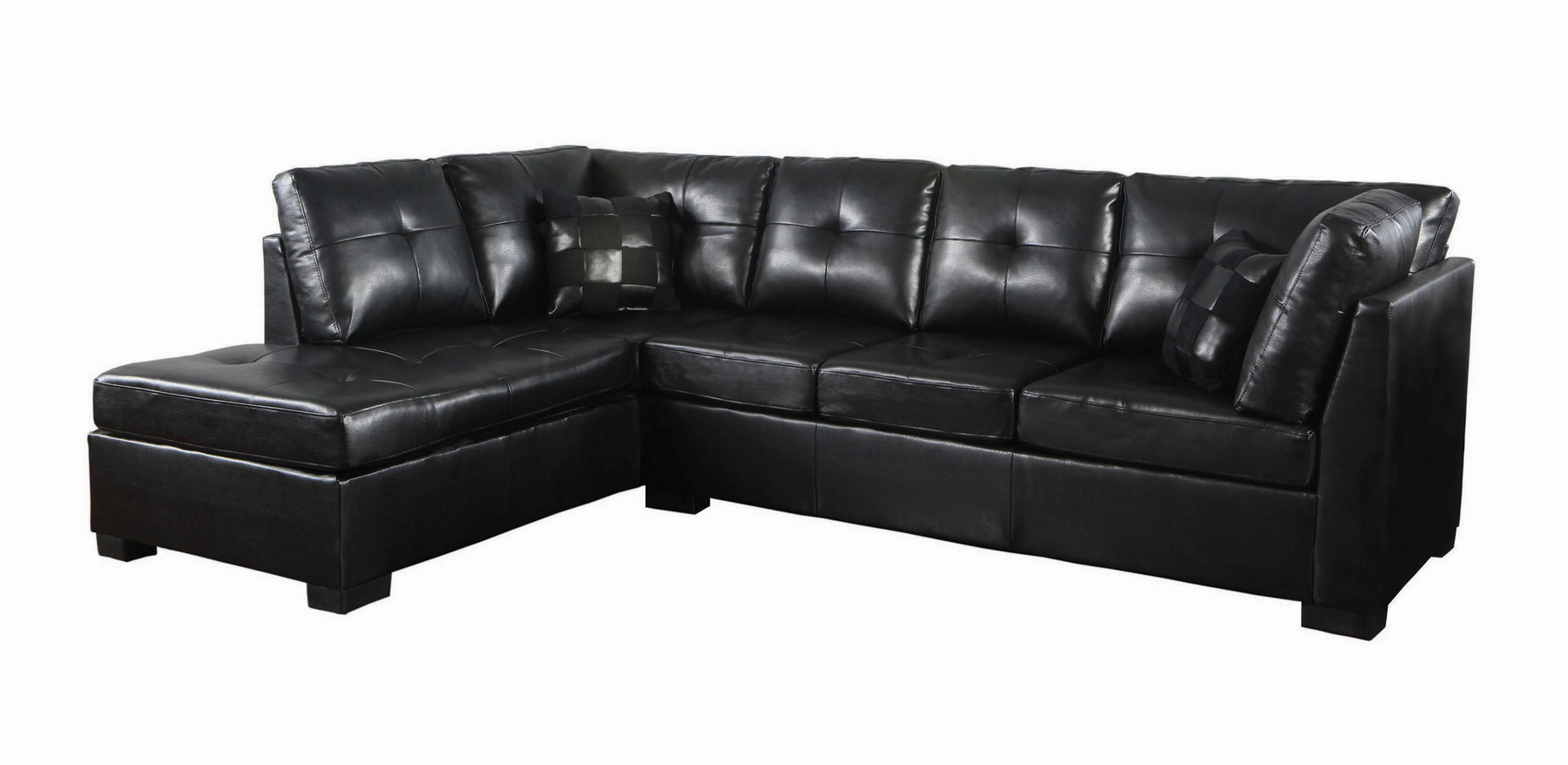 This bold and beautiful collection features tufted black bonded leather back and seats with high resiliency foam cushions. Two accent pillows included and removable cushions.Features: