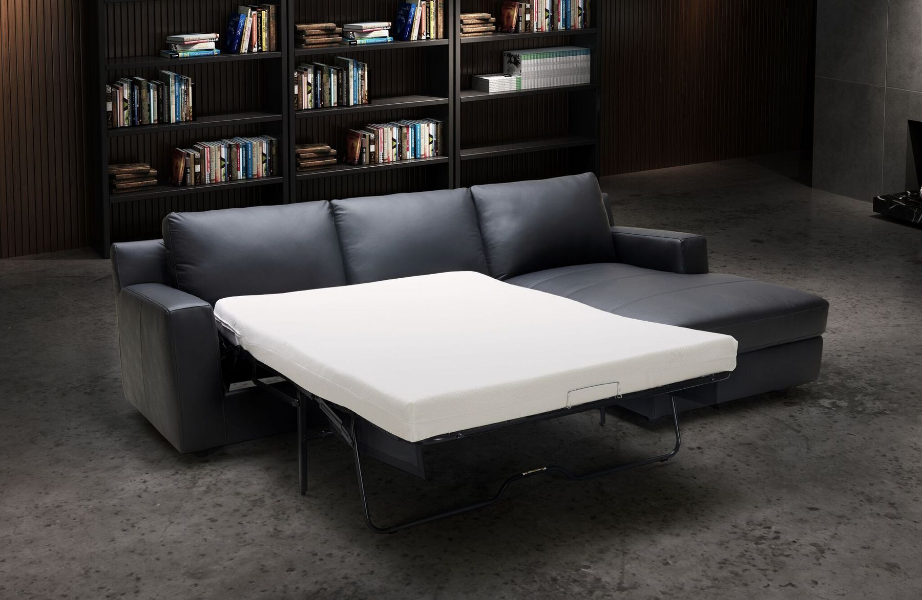 Elevate your living space with the Elizabeth Premium Black Leather Sectional, a perfect blend of style and functionality. Designed for modern homes, this right-facing sectional sofa is a true symbol of elegance, offering both a comfortable seating solution and a practical sleeper feature for your convenience.The Elizabeth Sectional isn't just about looks it's about providing you with a versatile piece of furniture that can adapt to your needs. Hidden within its sleek silhouette is a durable sleeper that effortlessly transforms the sofa into a spacious bed, ensuring you're always prepared for overnight guests.