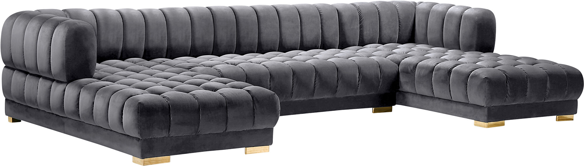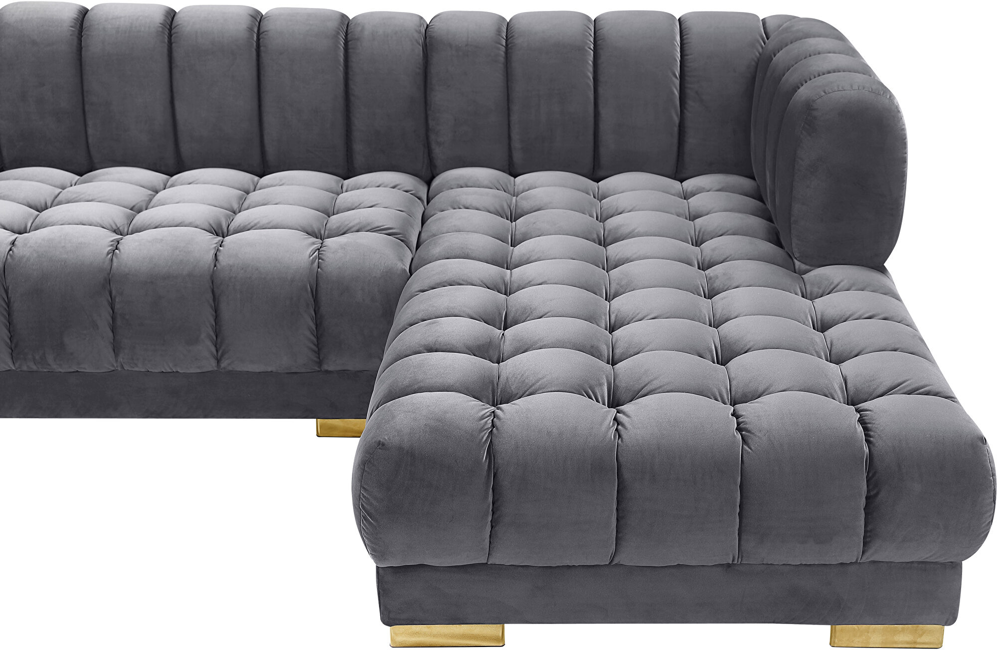 Elevate your living space with the epitome of modern luxury—the Soft Velvet 3-Piece Sectional Sofa. This exquisite piece boasts an ultra-contemporary design that commands attention and sets the tone for sophisticated living. The plush velvet upholstery, available in a selection of colors with a stunning gray featured here, is both inviting and chic, ensuring it blends seamlessly with any decor theme.Each detail is meticulously crafted to create an aura of elegance, from the deep biscuit tufting that adds texture and depth, to the shimmering gold iron legs that provide a touch of glamour. For those who prefer a different metallic accent, silver legs are also included, allowing for versatility in style. Whether positioned against a wall, nestled into a cozy corner, or taking center stage in the middle of the room, this sectional sofa promises to make a statement.