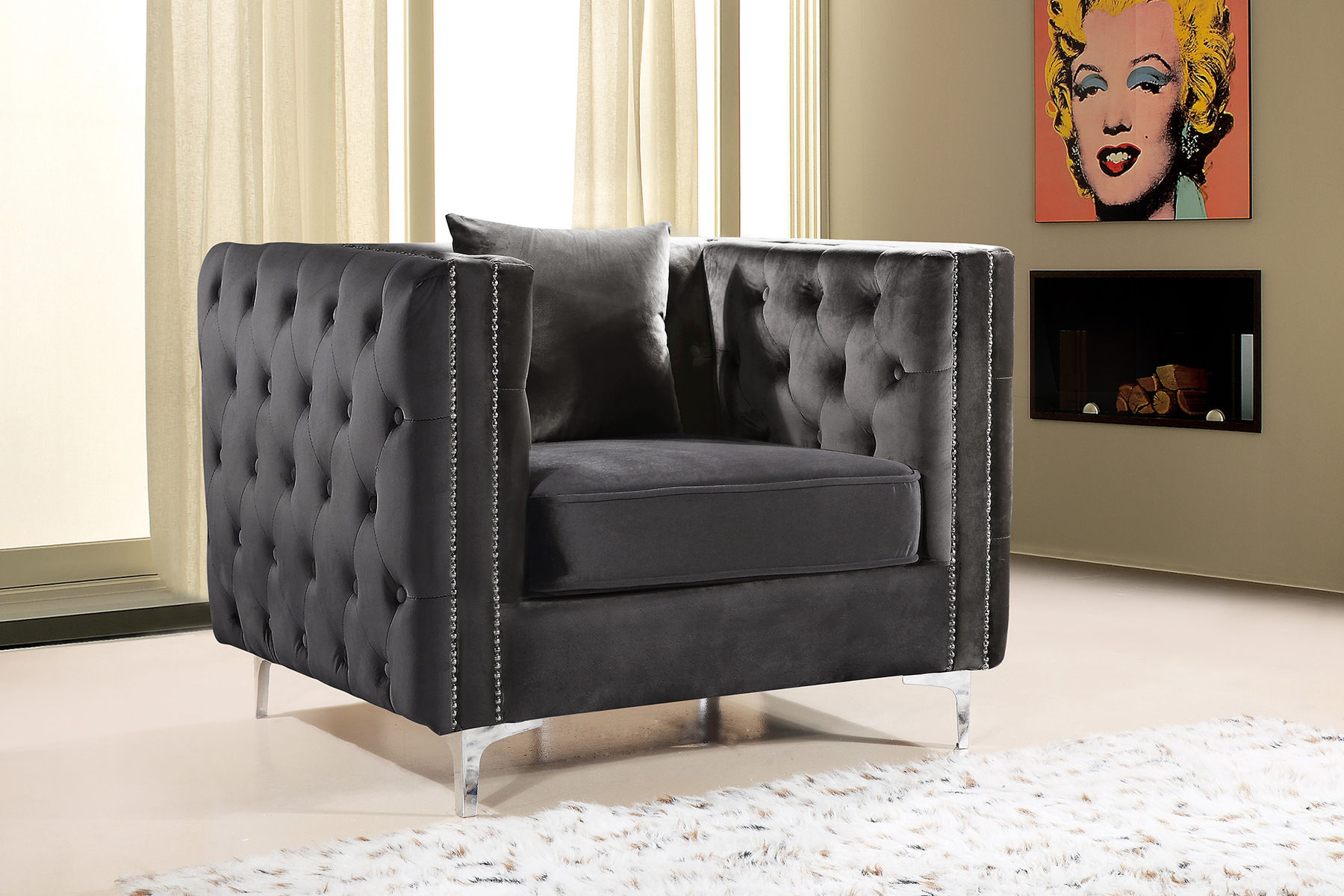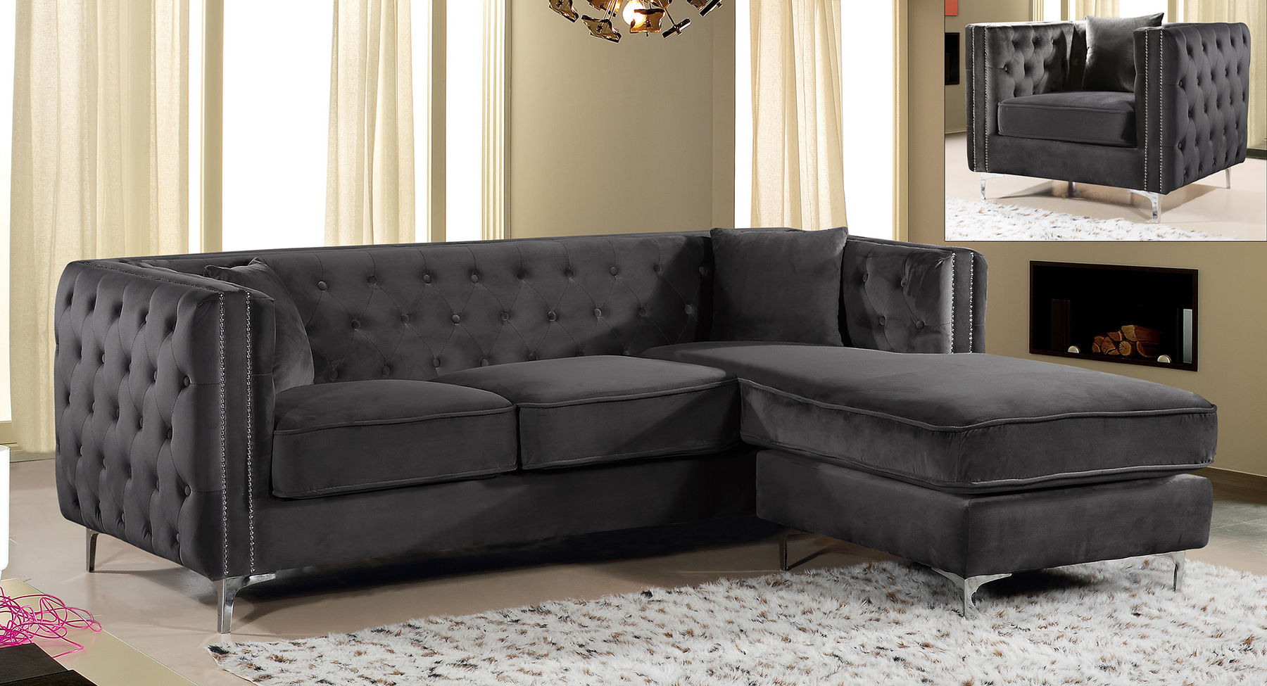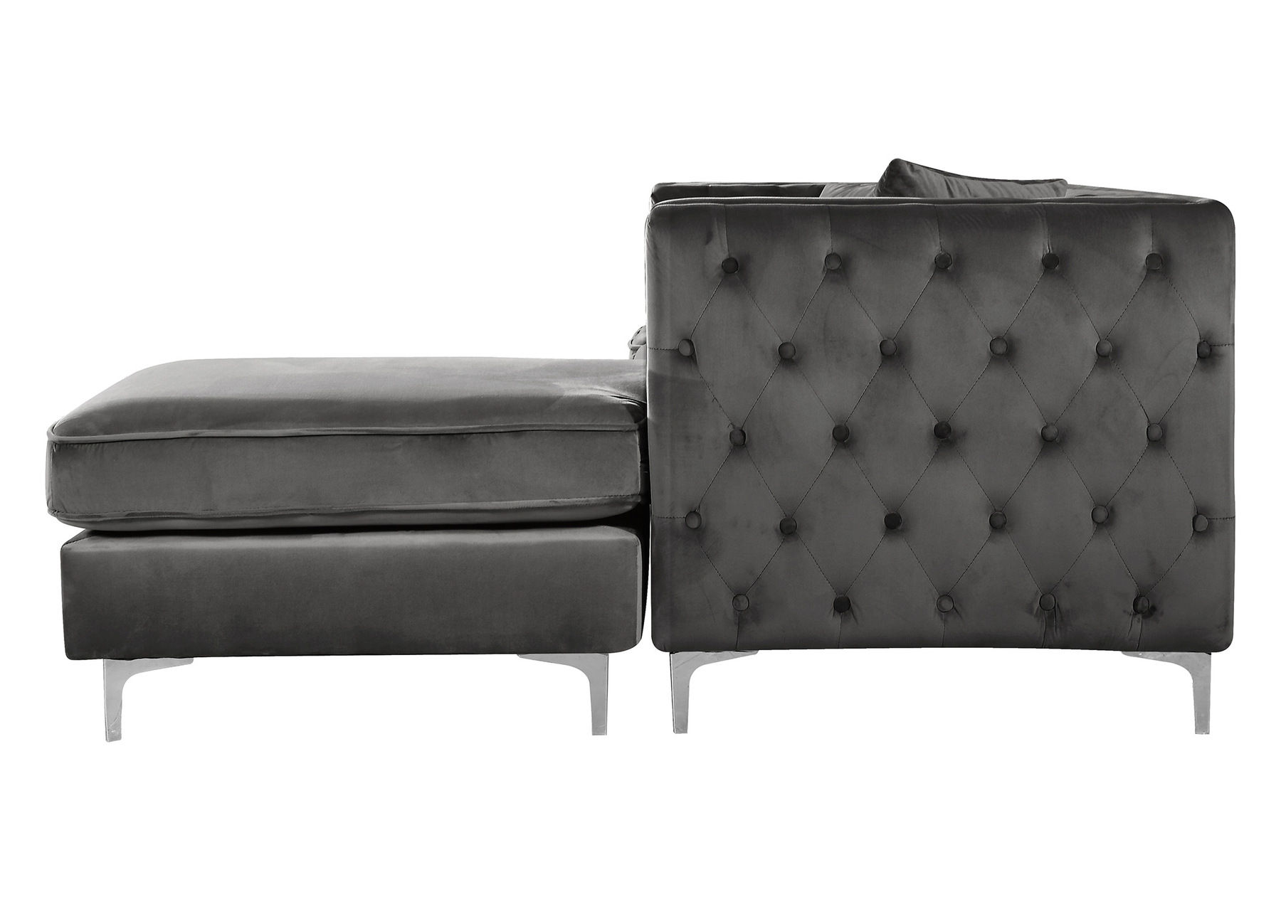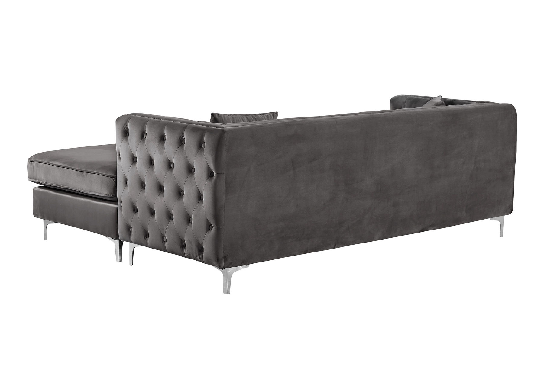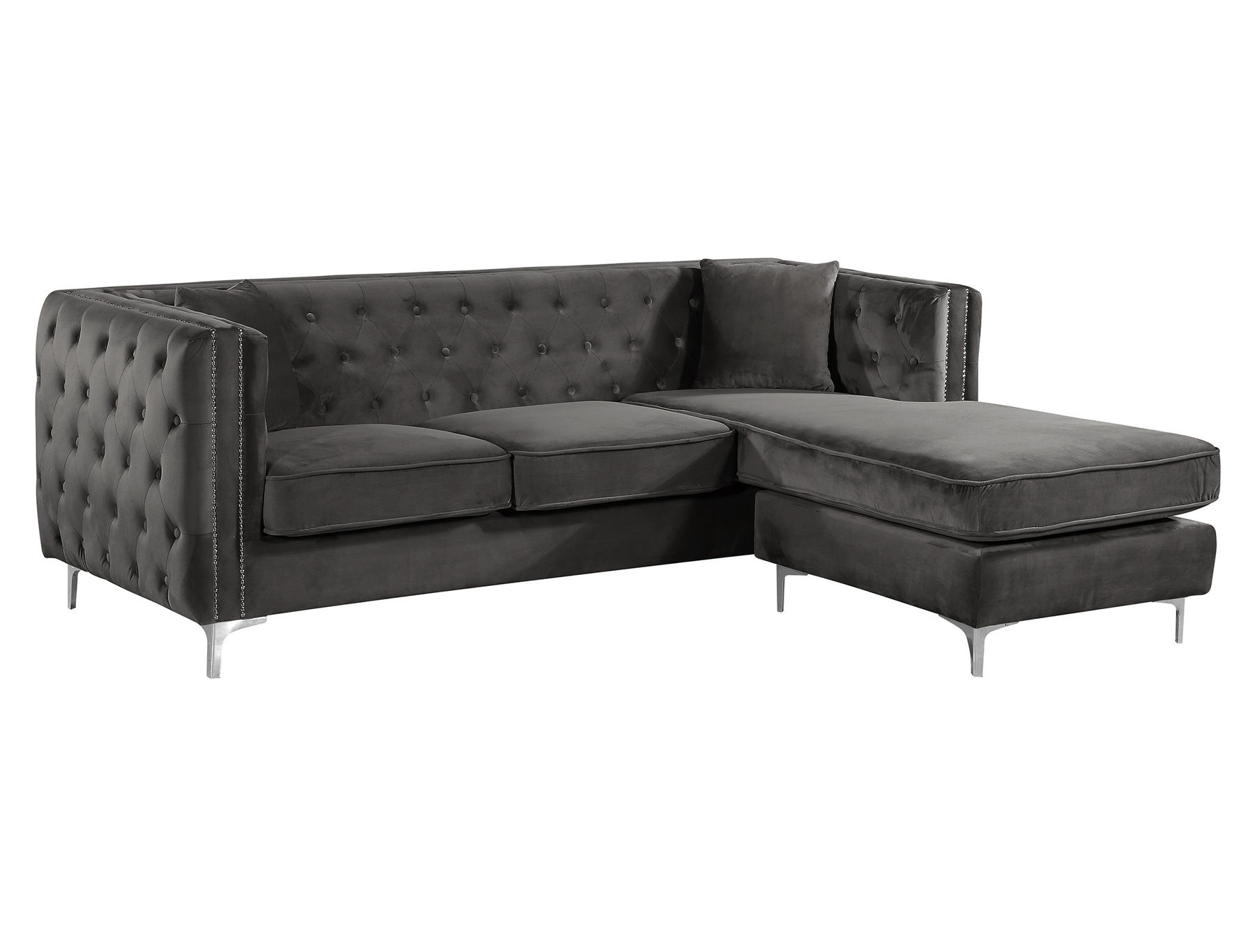 Seat the whole gang for movie night on this two-piece Jesse grey velvet reversible sectional in right-facing shape. A chaise end gives you a spot for stretching out your legs, while two other seats ensure that everyone stays comfortable. The chaise reverses, so you can use it on either end, and the seats and backs are comfortable and plump, so you snuggle up and relax. The chrome nail head trim and chromed feet and legs lend this piece a modern aesthetic that's ideal for contemporary spaces.Features: