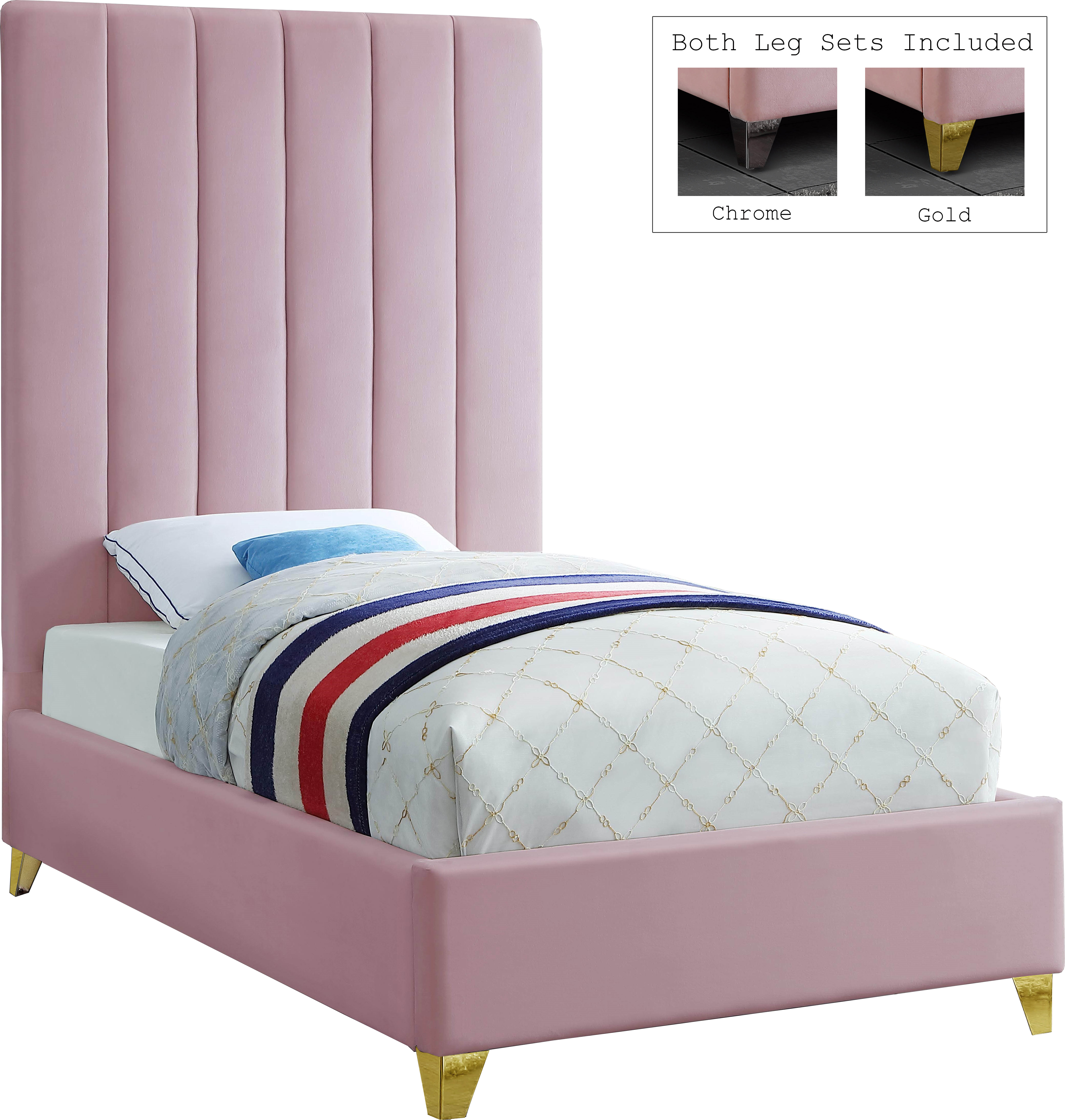 Elevate your sleeping space with the Via Queen-Sized Upholstered Bed, a pinnacle of contemporary elegance and comfort. Wrapped in sumptuous pink velvet, this bed radiates upscale sophistication that's bound to become the centerpiece of your bedroom. The deep channel tufting on the headboard not only adds a touch of luxury but also ensures the upholstery remains plush and supportive, perfect for those evenings spent reading or indulging in your favorite shows. Designed with practicality in mind, the bed is supported by sturdy metal legs that lift the frame off the ground, providing easy-to-clean space beneath and contributing to its sleek, modern silhouette. Versatility is at the forefront, as each bed comes with both gold and chrome legs, allowing you to customize the look to match your style. Moreover, the inclusion of full slats means you can enjoy this bed without the need for a box spring, streamlining your restful retreat.Features: