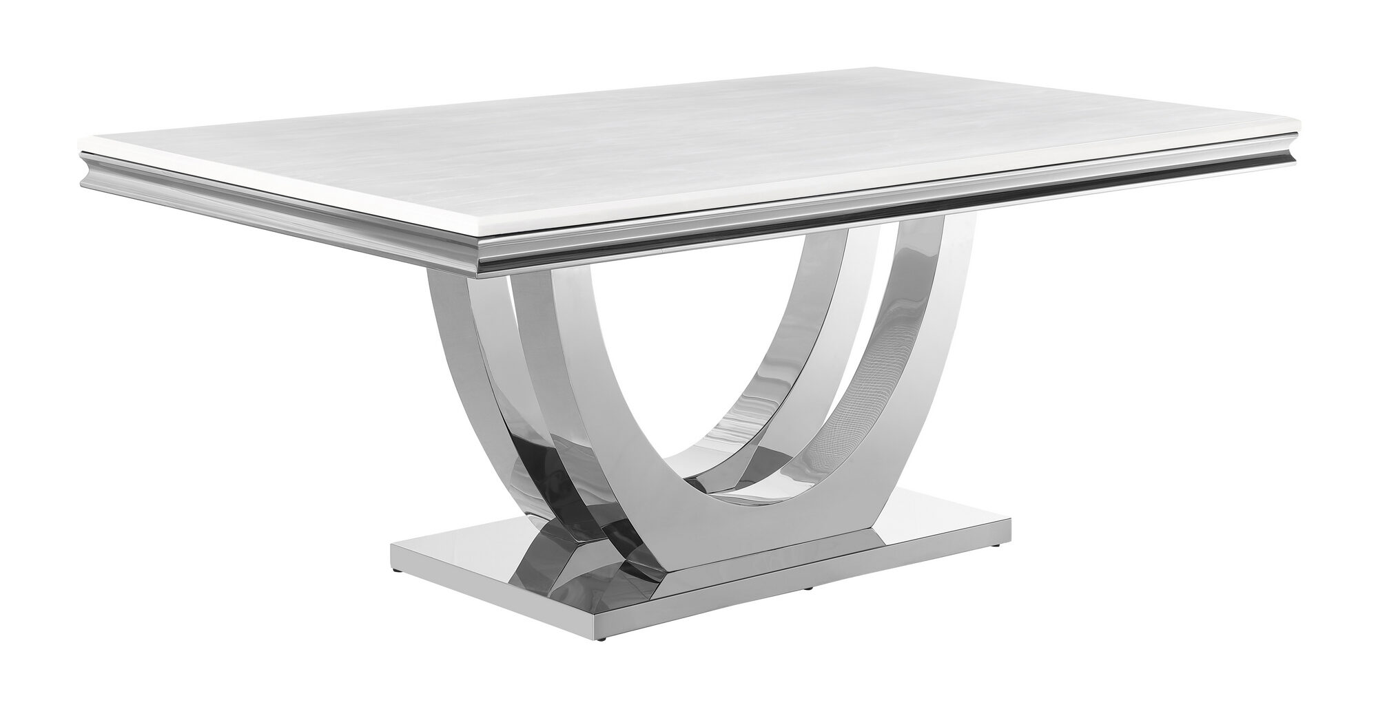 Host family and friends around this sleek, modern glam dining table for an elevated dining experience. Designed with an open demilune pedestal base in a lustrous polished chrome finish, this magnificent, rectangular dining table lends a luxurious look and feel to your space. A spacious tabletop is covered in a white marble paper and features a beveled edge that offers a timeless contemporary touch. The open pedestal base rests on a slim flush base that offers extra stability and a seamless expression. Seat six guests comfortably at this sophisticated dining table.Features: