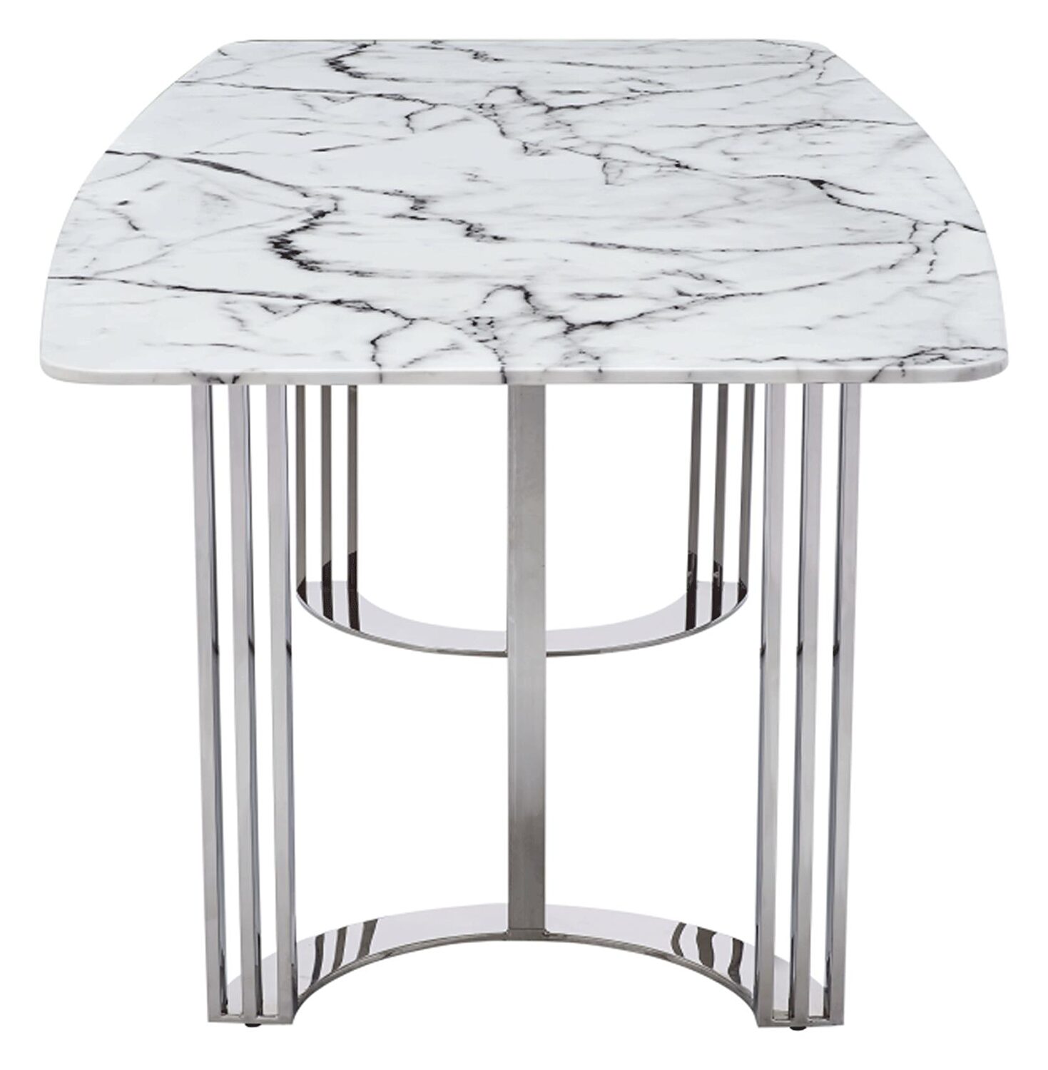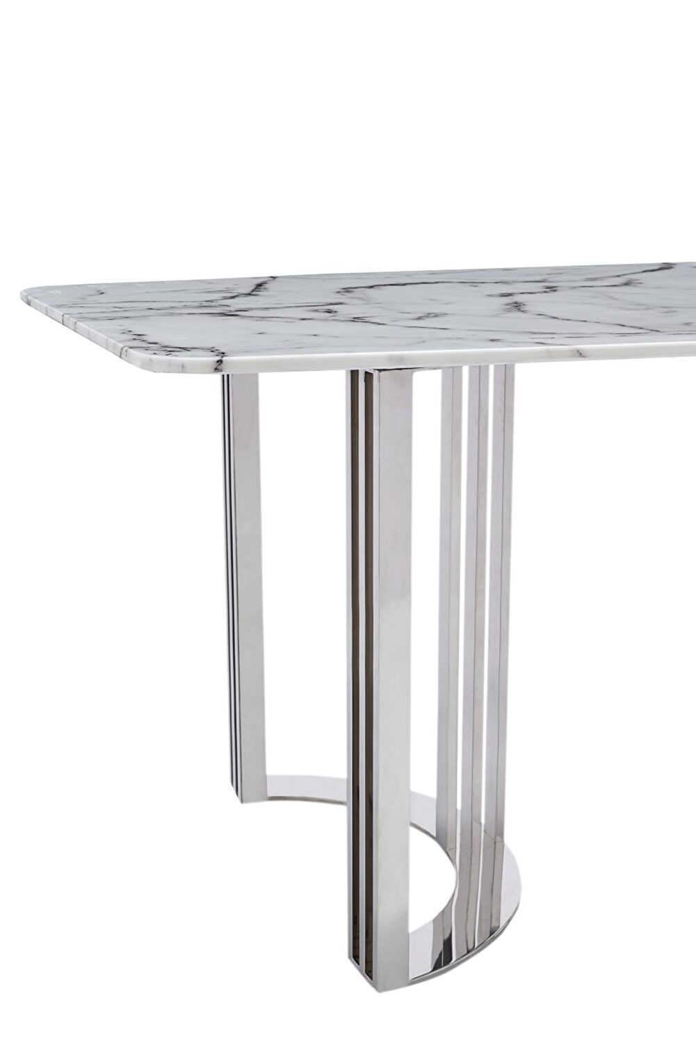 Marble top and silver stainless steel base are main features of this dining table. Usable with any chairs.Features: