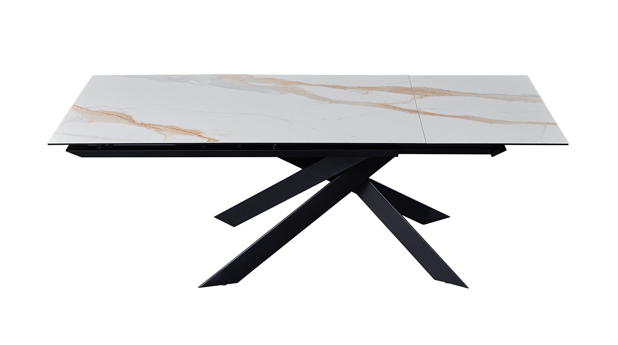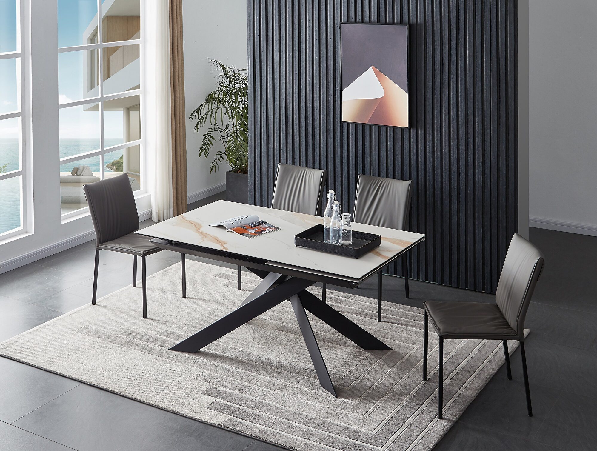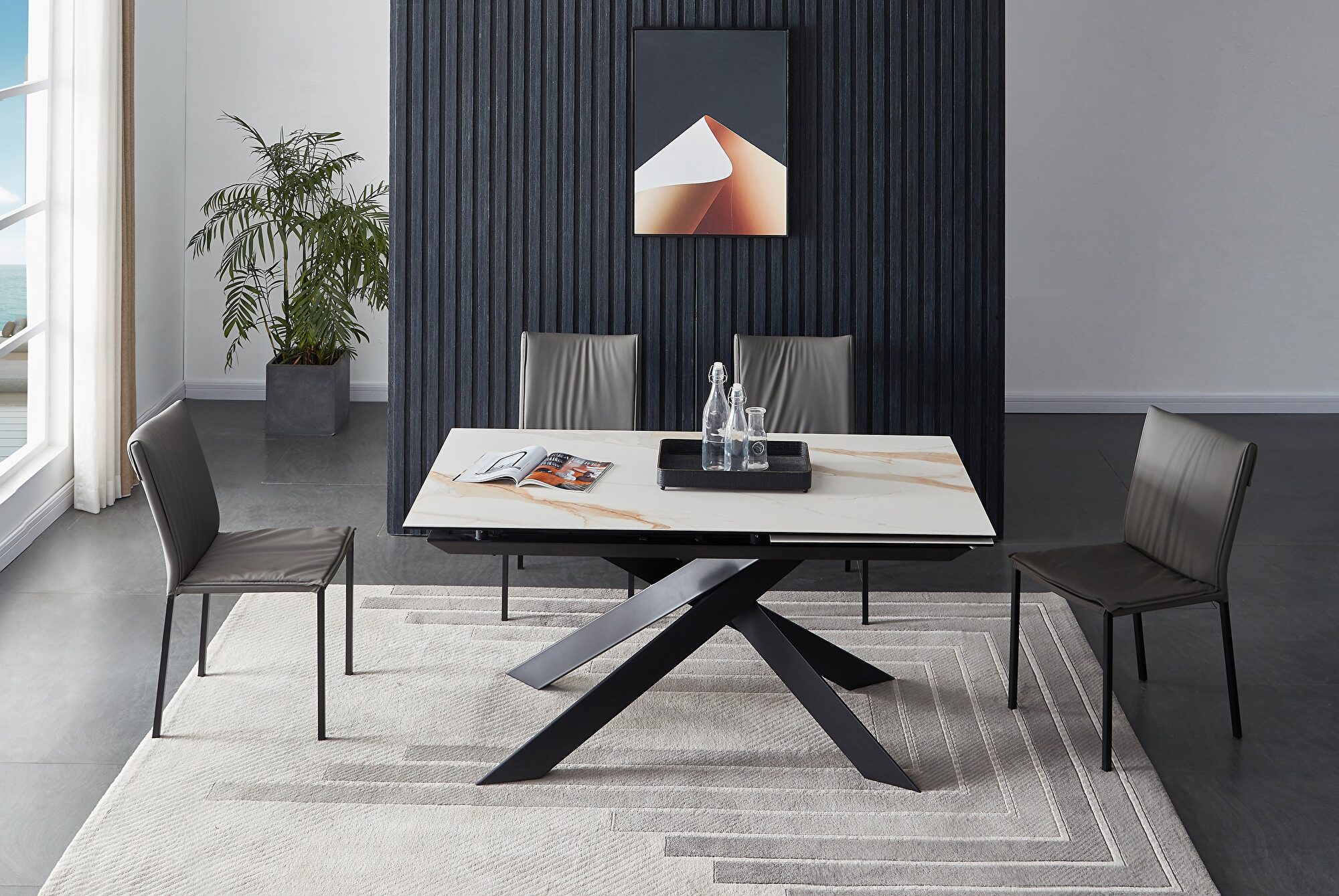 Elevate your dining experience with the latest gem in our Modern Dining Collection—the Calcutta Extension Table. Meticulously designed, this table marries functionality with elegance. The tabletop, a masterpiece in matte ceramic, promises durability without compromising on style. Its opulent surface is supported by sleek, black powder-coated aluminum legs that provide a sturdy yet sophisticated foundation.But the Calcutta isn't just about good looks; it's ingeniously practical. Our first-of-its-kind extension feature boasts an effortless swing-out mechanism, transforming your cozy dining space into a grand area fit for a feast. Ideal for those who love to host but also appreciate the art of space-saving, this table gracefully adapts to your lifestyle, expanding to welcome more guests or conserving space when it's just for you.