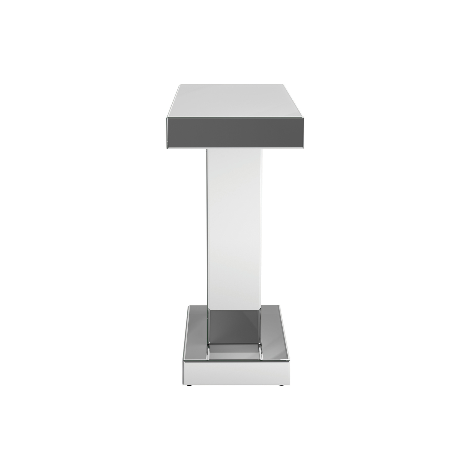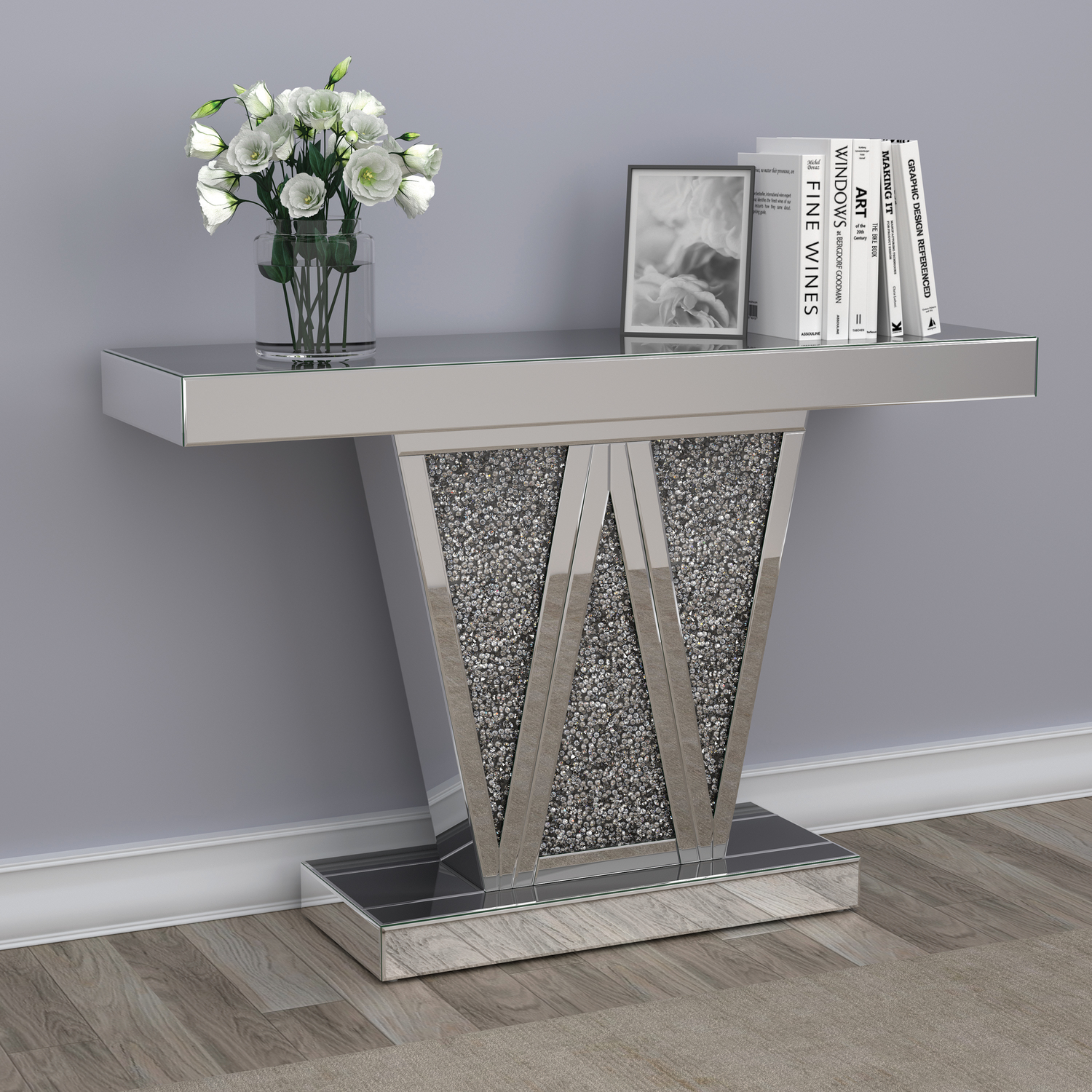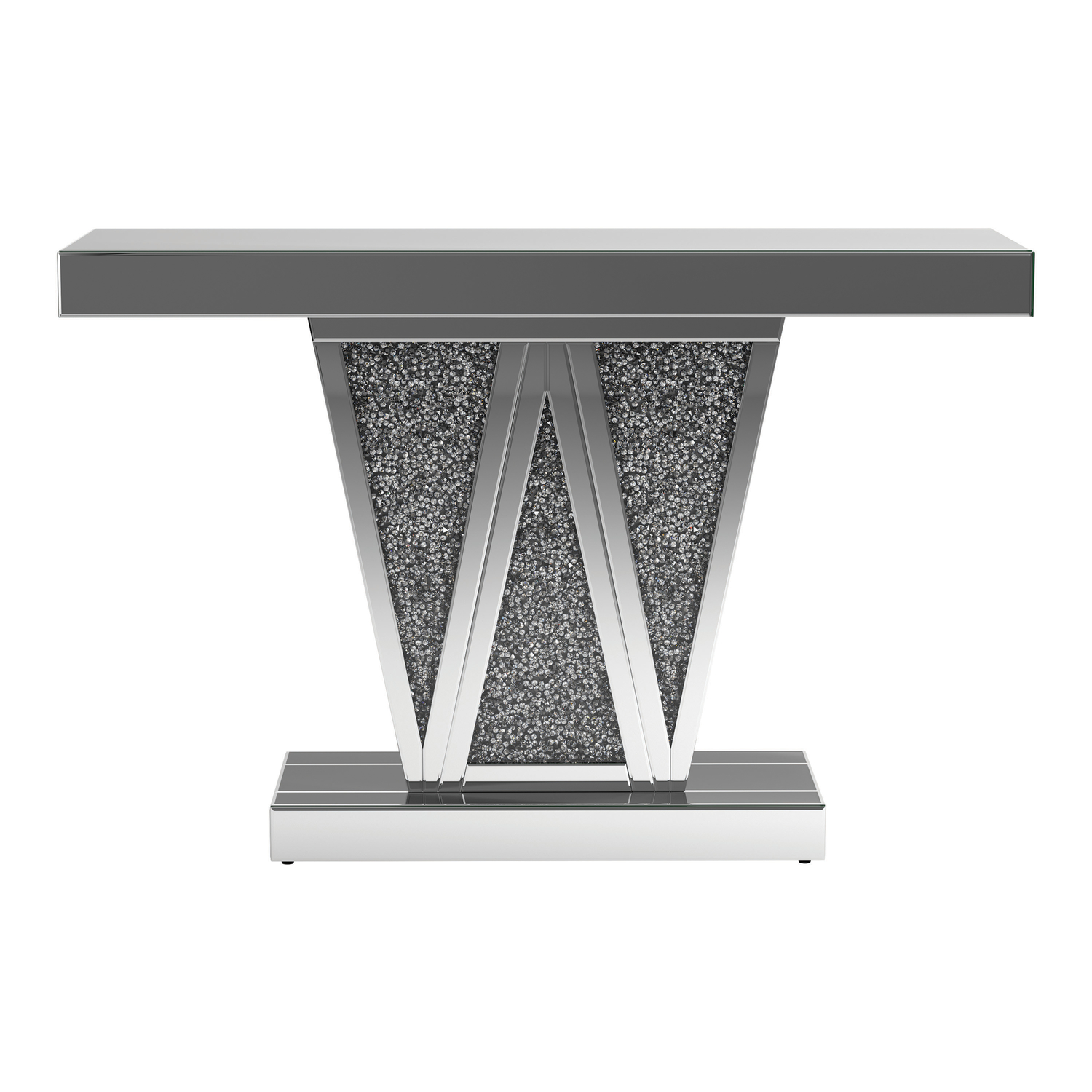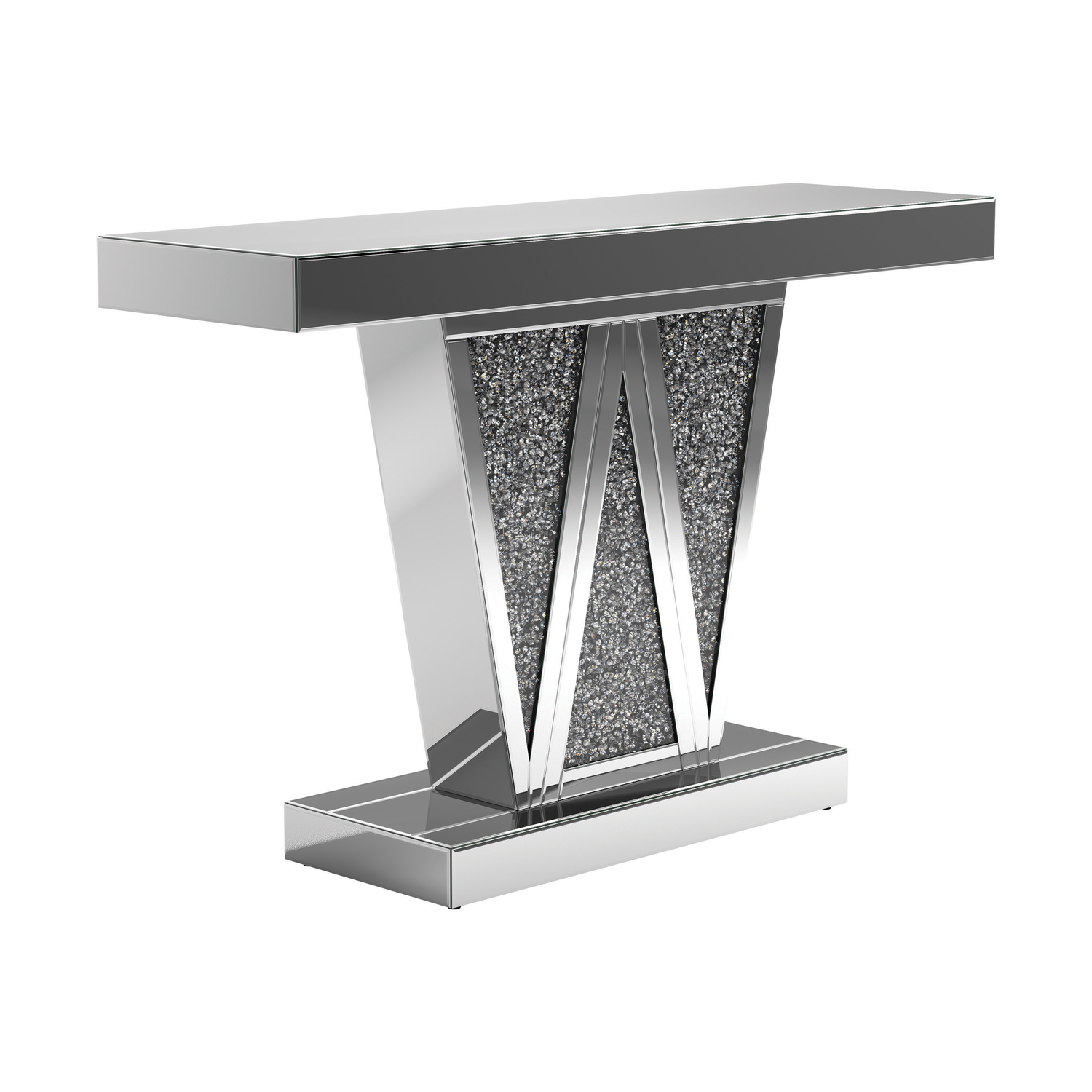 Entertain an elite crowd in your contemporary glam space with this silver console table. A geometric silhouette is enhanced by three triangular sections of the base, forming a w for added dimension in this contemporary console table. The silver finish showcases a glamorous look in any space. Equally at home in a glam dining room or a contemporary entertaining space, this console table gives that rockstar vibe. Top with a sculptural art piece for a striking accent to spark conversation.Model: CS786