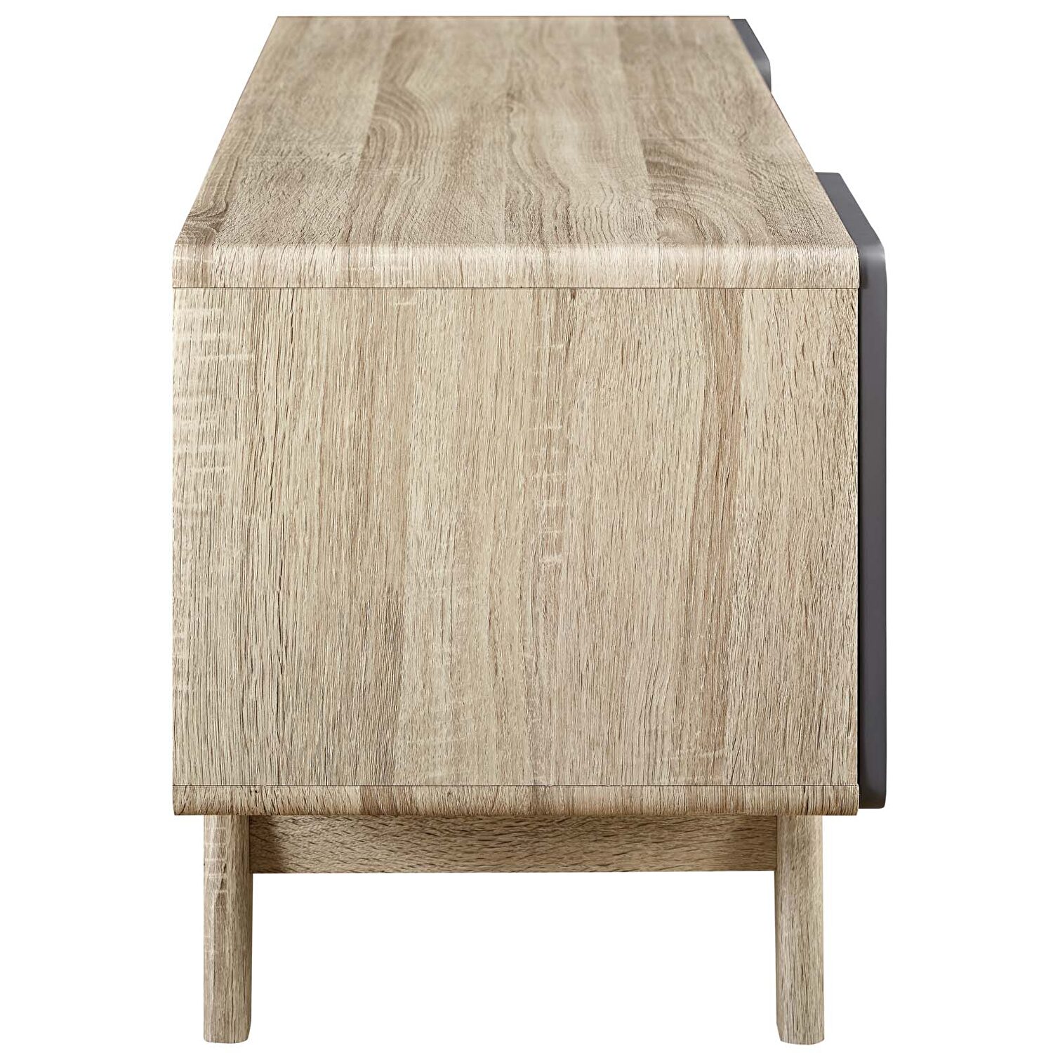 Activate the charismatic style of mid-century modern with the Tread 47†TV Stand. Featuring a linear silhouette with rounded corners, Tread comes with a height adjustable center media storage shelf, durable fiberboard construction, and extra support legs for added sturdiness. Available in either walnut grain laminate with hinged white side doors or natural grain laminate with gray side doors, Tread has a look perfect for your contemporary living room decor. Complete with center cable management for all your entertainment needs, Tread is a versatile contemporary TV stand with ample concealed and open storage. Accommodates flat screen TVs up to 52 inches.Features: