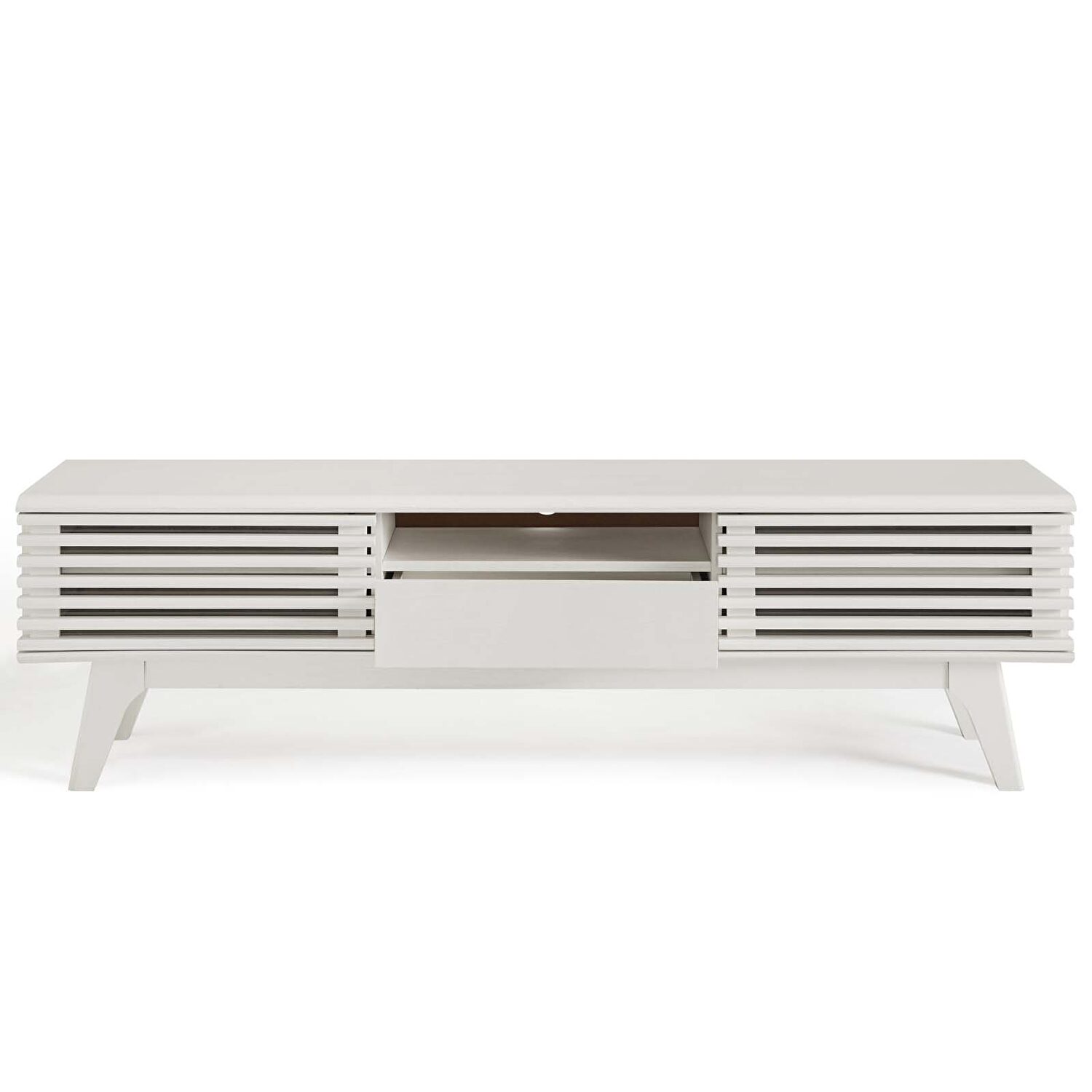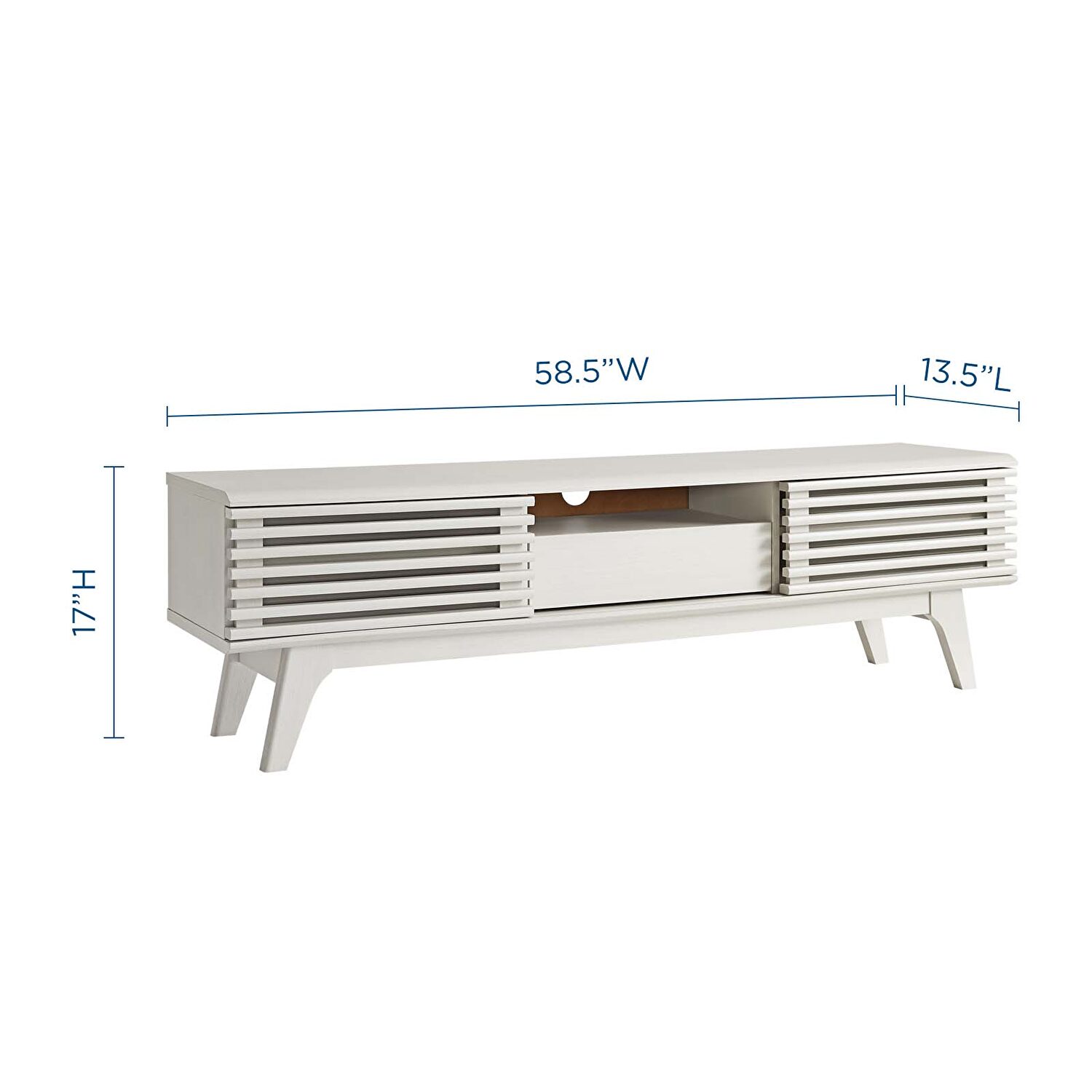 Tap into mid-century aesthetics with the Render 59†TV Stand. Render features a durable particleboard frame with smooth walnut grain laminate, four tapered wood legs, full-extension center drawer with shelf on top, non-marking foam foot pads, and opposite side adjustable shelves with dual slatted sliding doors for sophisticated media storage. Complete with a center cable management hole, Render’s contemporary linear style is the perfect addition to the modern living room, lounge or recreation area.Features: