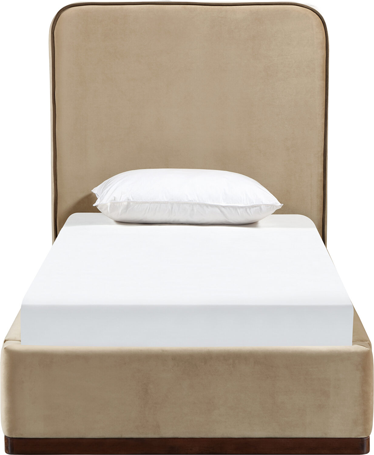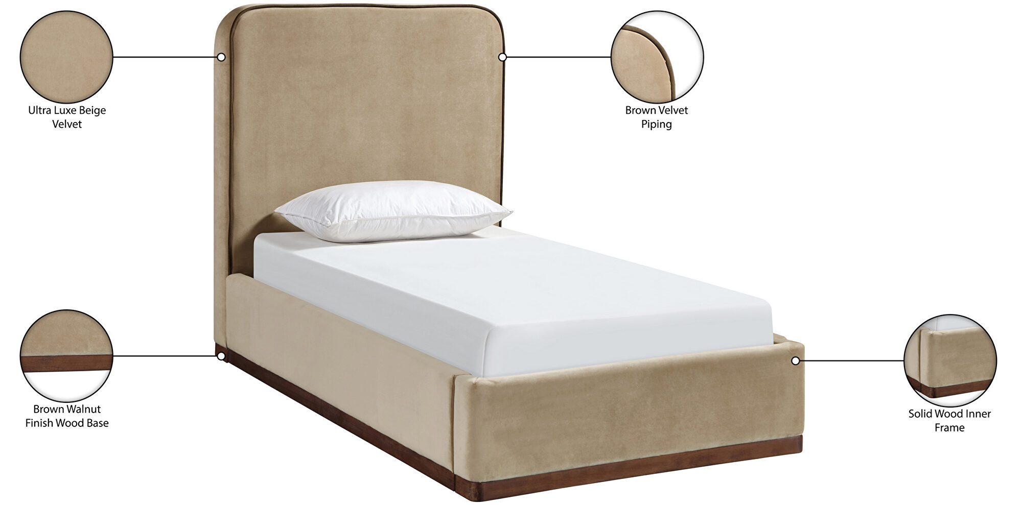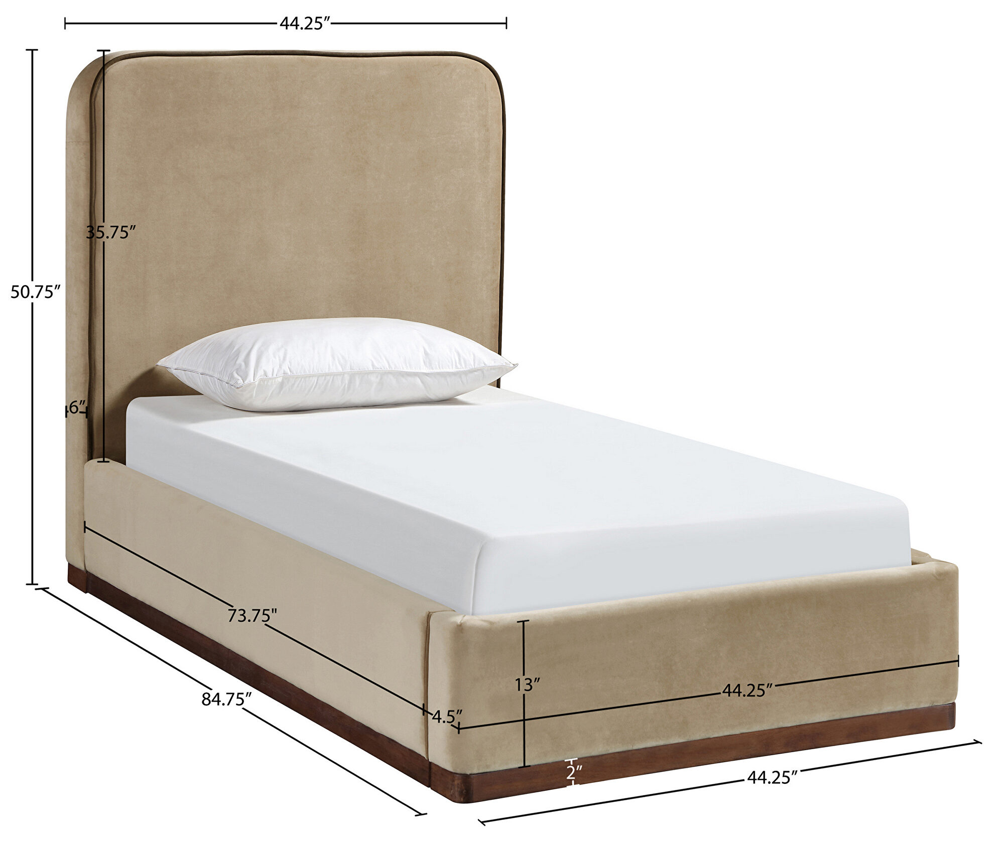 Elevate your bedroom with the Rava Velvet Upholstered Twin Size Bed in soft beige - a refined centerpiece that blends sumptuous comfort with contemporary style. The plush 460 GSM velvet upholstery creates a smooth, inviting surface, while contrasting brown velvet piping outlines the headboard and base for subtle, sophisticated detailing. A warm brown walnut wood base provides sturdy support and modern appeal, making the Rava bed a seamless fit for both elegant and everyday interiors.Designed for convenience as well as style, the Rava features a fully slatted foundation, eliminating the need for a boxspring and simplifying setup. Available in Queen, King, Full, and Twin sizes, this bed pairs luxurious materials with practical construction to deliver lasting comfort and timeless design.