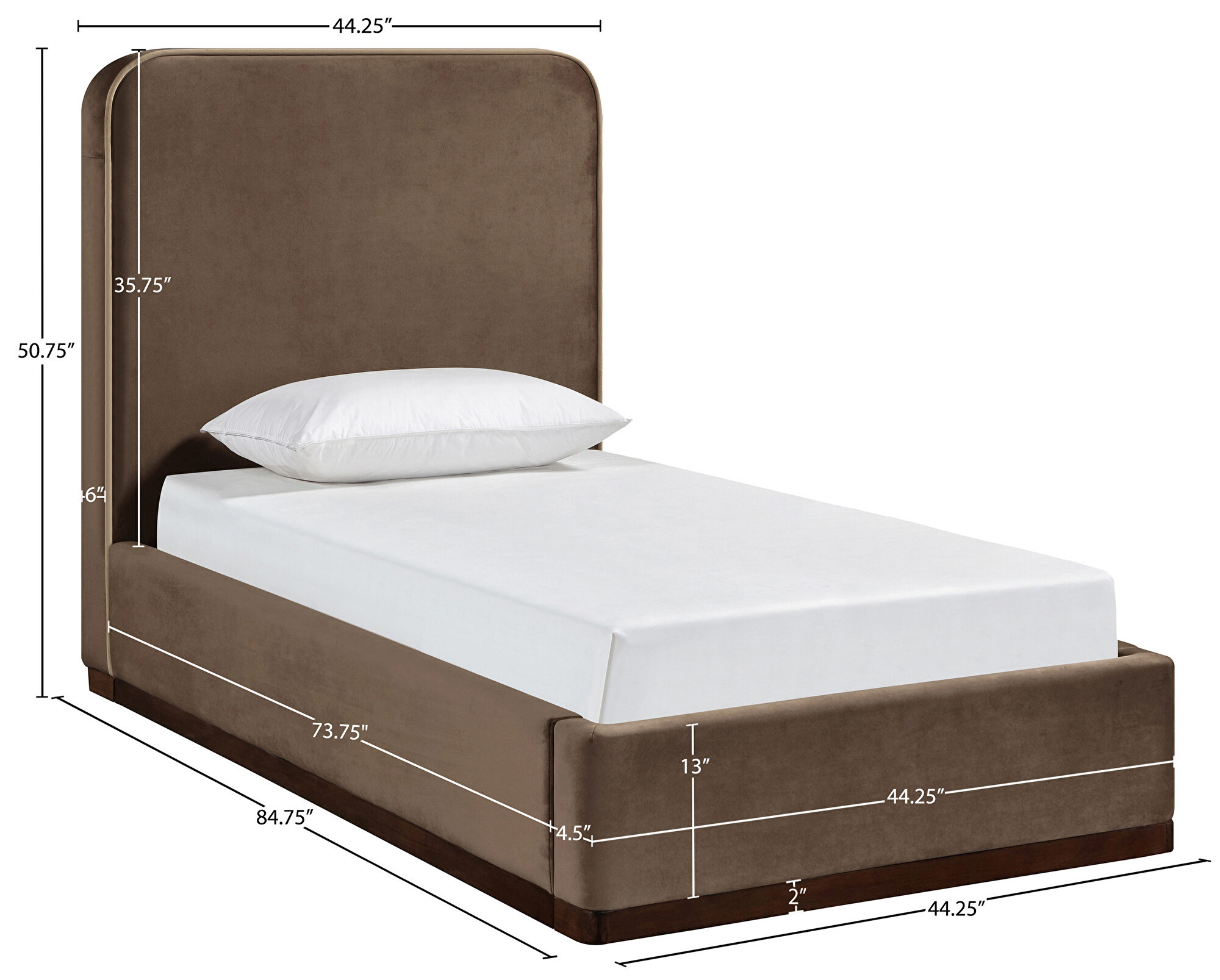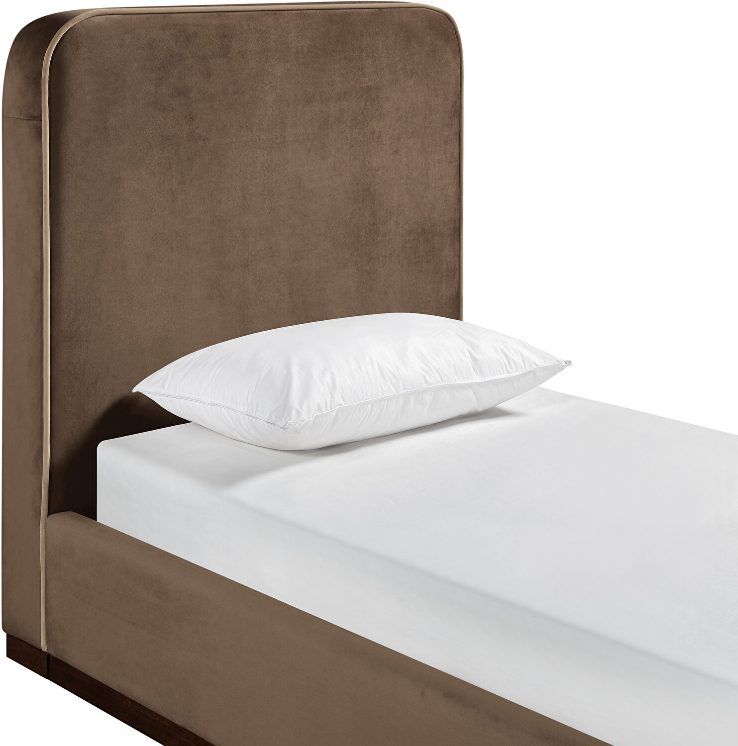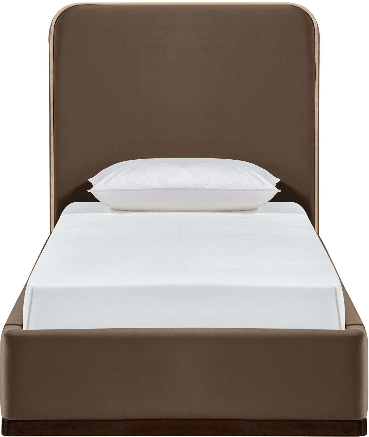 Elevate your bedroom with the Rava Velvet Upholstered Twin Size Bed in soft brown - a refined centerpiece that blends sumptuous comfort with contemporary style. The plush 460 GSM velvet upholstery creates a smooth, inviting surface, while contrasting brown velvet piping outlines the headboard and base for subtle, sophisticated detailing. A warm brown walnut wood base provides sturdy support and modern appeal, making the Rava bed a seamless fit for both elegant and everyday interiors.Designed for convenience as well as style, the Rava features a fully slatted foundation, eliminating the need for a boxspring and simplifying setup. Available in Queen, King, Full, and Twin sizes, this bed pairs luxurious materials with practical construction to deliver lasting comfort and timeless design.