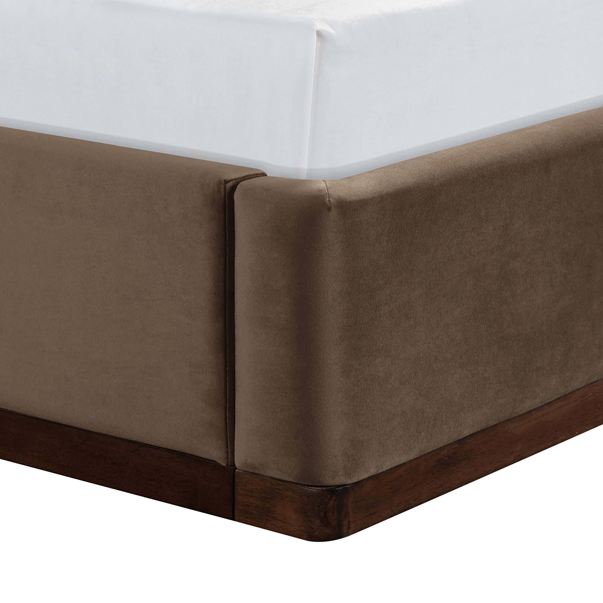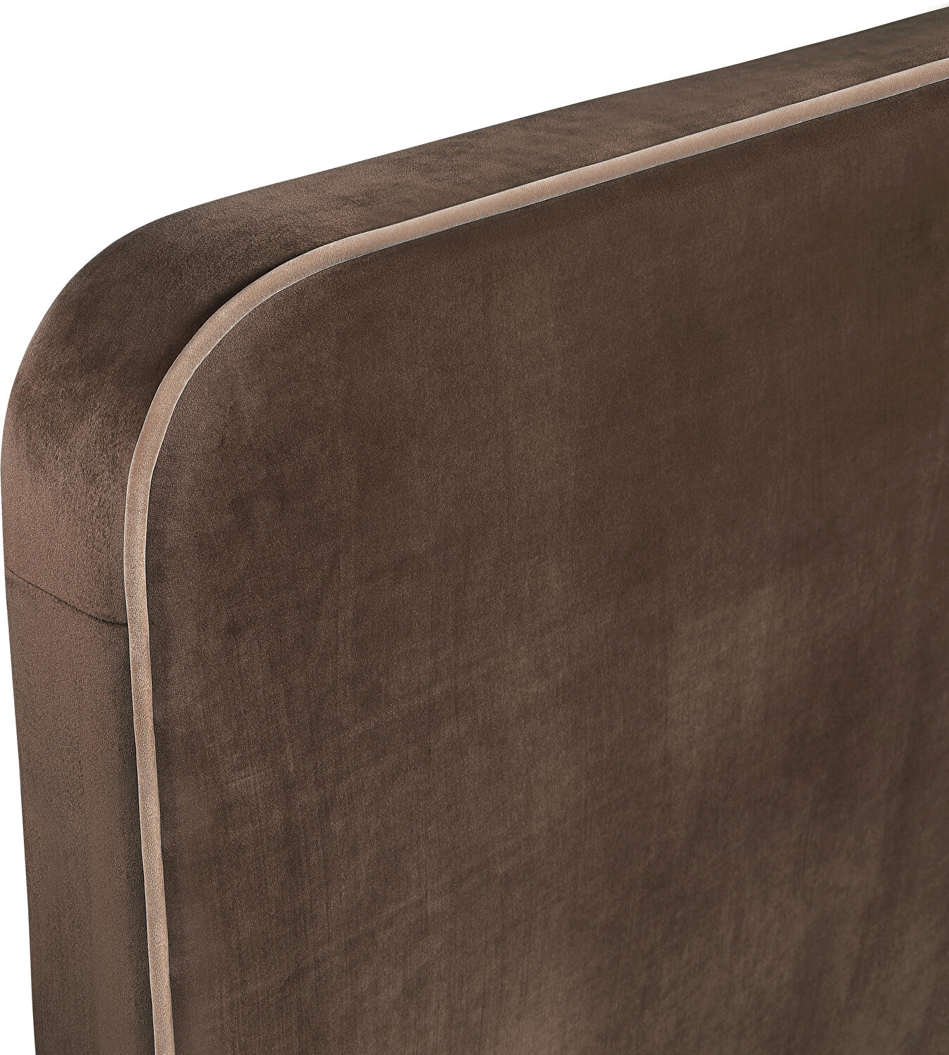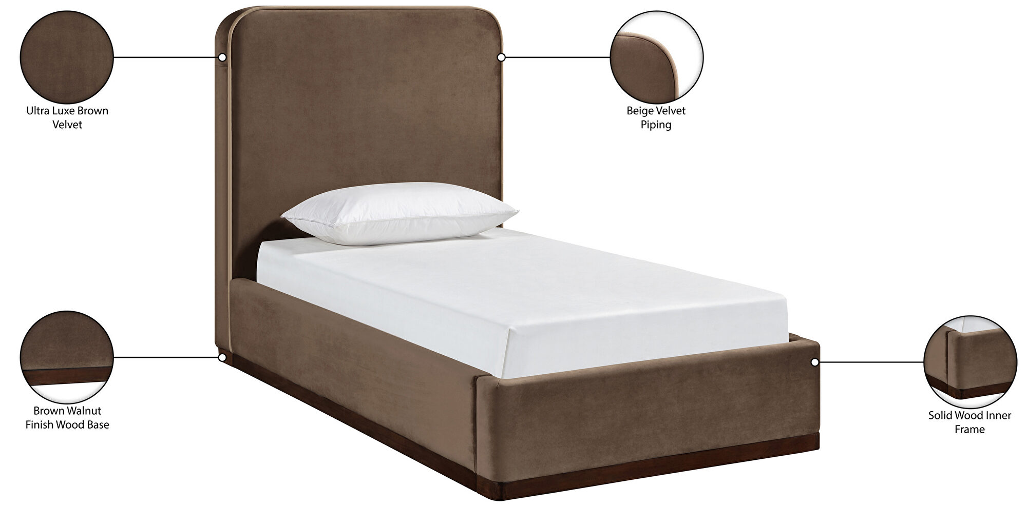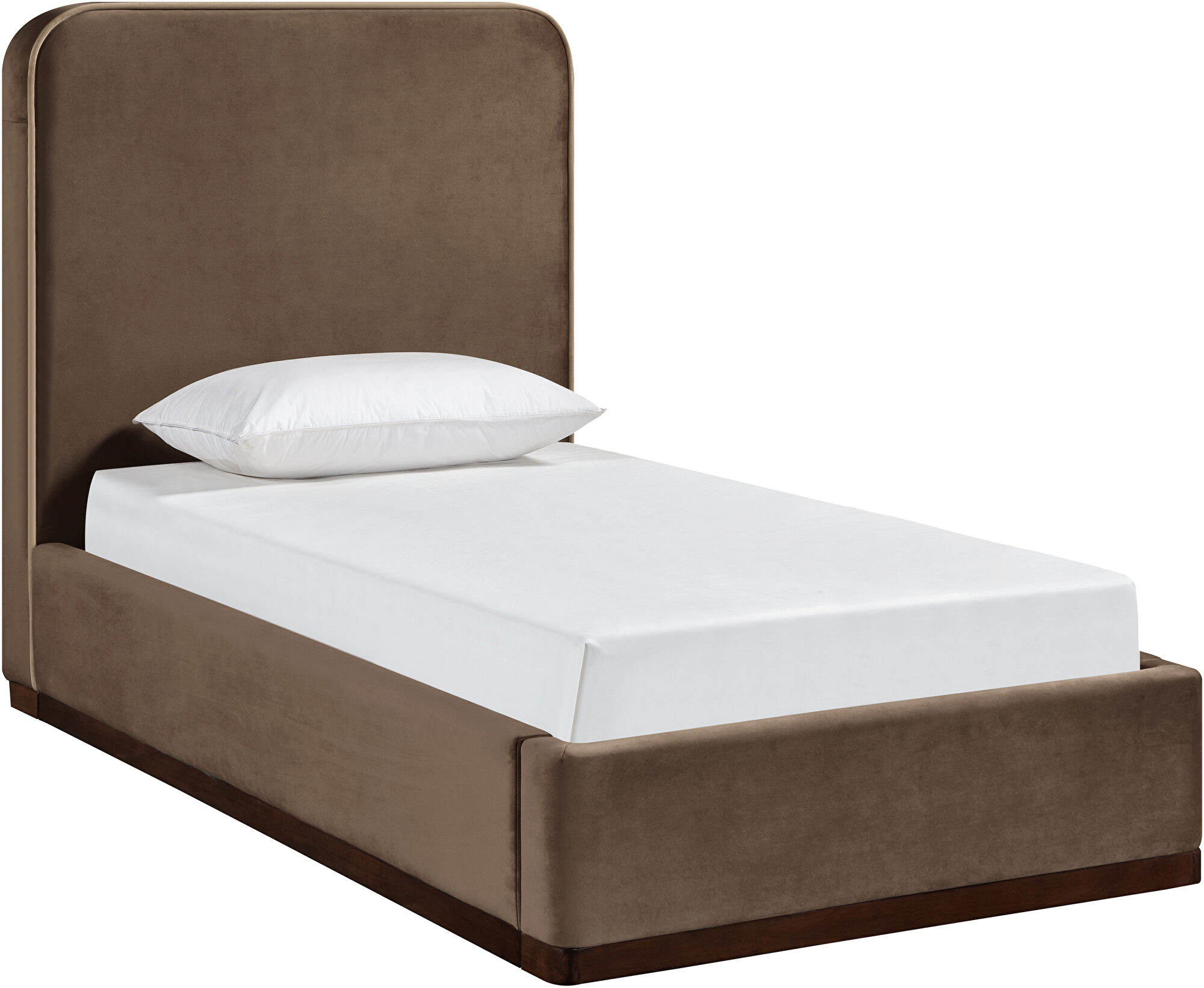Elevate your bedroom with the Rava Velvet Upholstered Twin Size Bed in soft brown - a refined centerpiece that blends sumptuous comfort with contemporary style. The plush 460 GSM velvet upholstery creates a smooth, inviting surface, while contrasting brown velvet piping outlines the headboard and base for subtle, sophisticated detailing. A warm brown walnut wood base provides sturdy support and modern appeal, making the Rava bed a seamless fit for both elegant and everyday interiors.Designed for convenience as well as style, the Rava features a fully slatted foundation, eliminating the need for a boxspring and simplifying setup. Available in Queen, King, Full, and Twin sizes, this bed pairs luxurious materials with practical construction to deliver lasting comfort and timeless design.