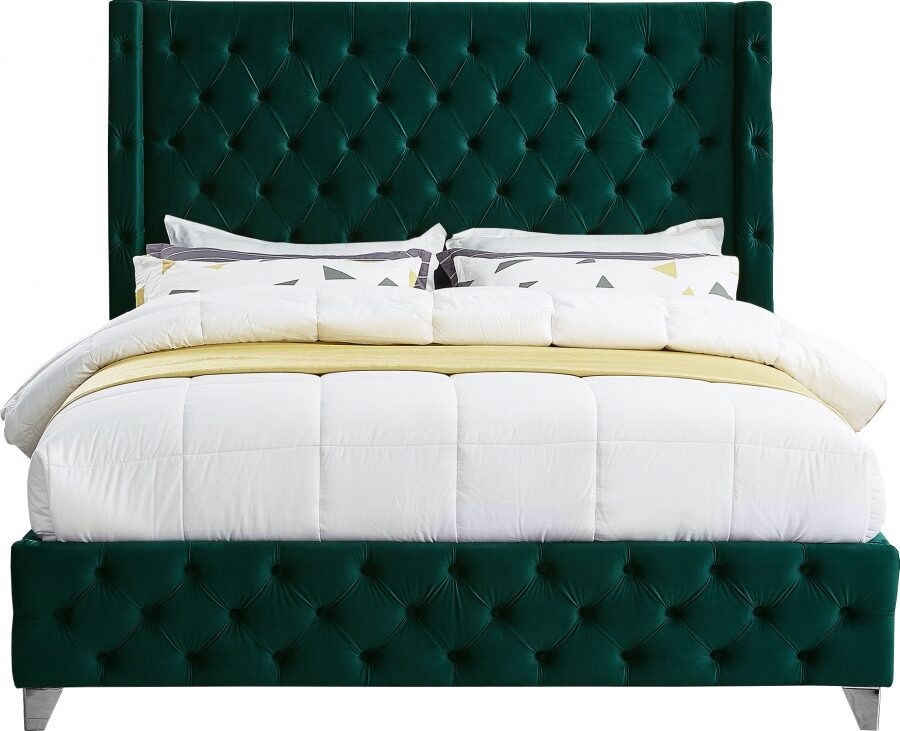 Elevate your bedroom into a realm of sophistication and elegance with the Savan velvet twin size bed. This exquisite piece is the epitome of luxury, swathed in the sumptuous texture of premium green velvet. From the imposing height of its magnificent headboard to the chic silhouette of its footboard, every detail is meticulously crafted. The deep button tufting creates a timeless allure, while the contemporary wingback design adds a touch of modern flair, ensuring your bedroom becomes a showcase of style and comfort.One of the most captivating features of this bed is its versatility in personalization. It comes equipped with two distinct sets of legs, one in a polished gold finish and the other in a sleek chrome, giving you the freedom to tailor the look to match your decor whims. Whether you're aiming for a bold statement or a subtle hint of opulence, the choice is yours.