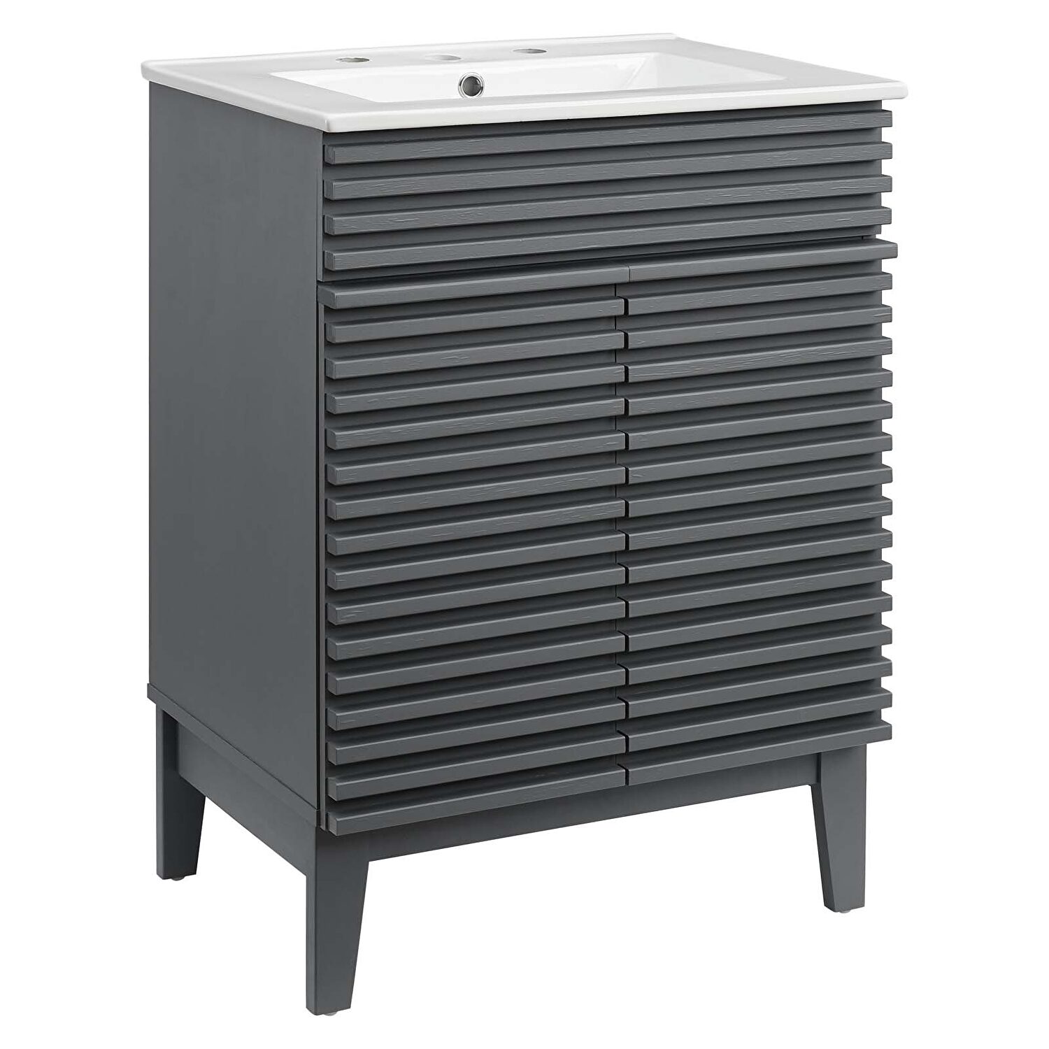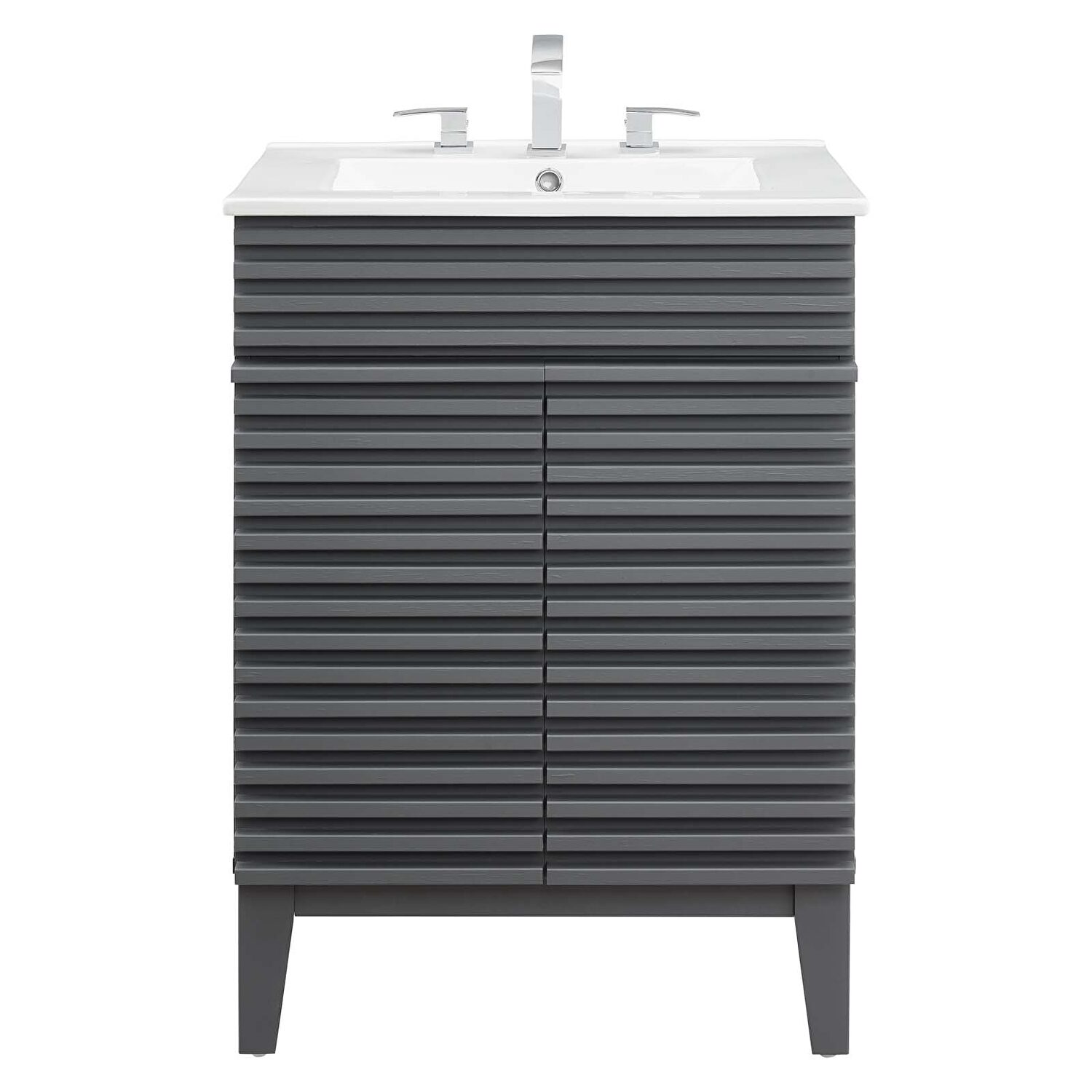 Tap into mid-century aesthetics with the Render Vanity. Render Bathroom Vanity features a durable particleboard frame with smooth walnut grain laminate, four tapered wood legs, and adjustable storage shelf behind two soft-close hinged doors. A curved basin and integrated countertop with three faucet holes create sleek lines and crisp design for an edgy style designed to meet your needs. Boasting a mid-century modern style this vanity features a solid construction with a pleasing look and practical functionality. 8" centerset faucet holes. Assembly required and fixtures not included.Features: