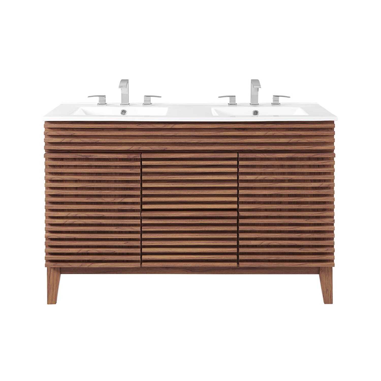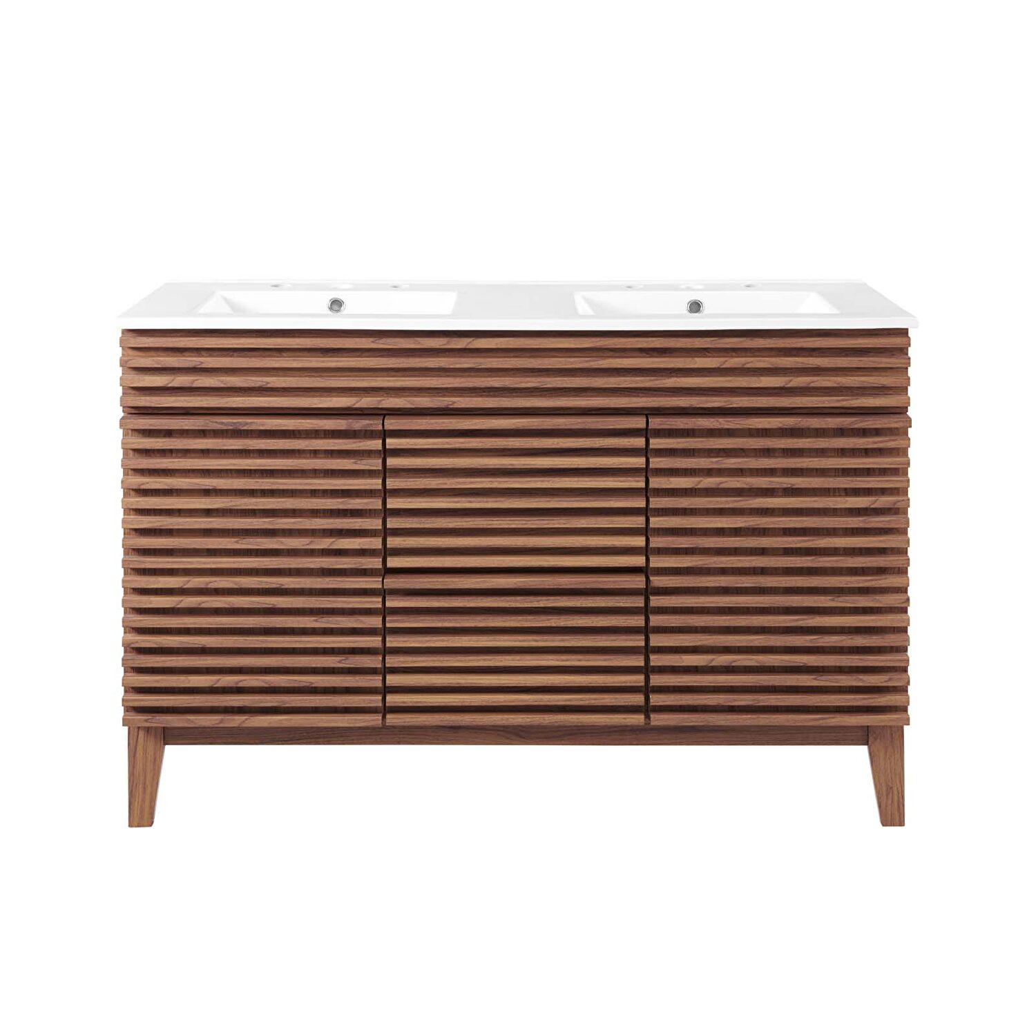 Tap into mid-century aesthetics with the Render Vanity. The Render 48" Bathroom Vanity features a durable MDF and particleboard frame with smooth walnut grain laminate, four tapered wood legs, and ample under sink storage space in full-extension drawers and behind soft-close hinged doors. Crafted with ceramic, a double sink with an integrated countertop, 8" widespread faucet holes, and rectangular sink basins continues the sleek look of this retro modern vanity. Clean lines and crisp design align for an edgy style designed to meet your needs. Boasting a mid-century modern style this vanity features a solid construction with a pleasing look and practical functionality. Assembly required and fixtures not included.Features: